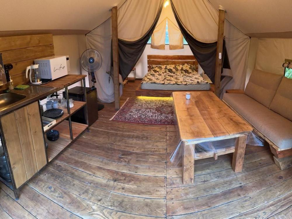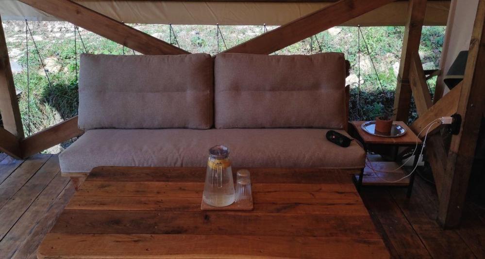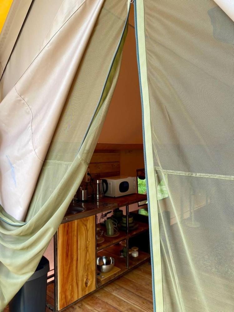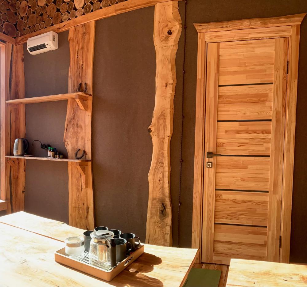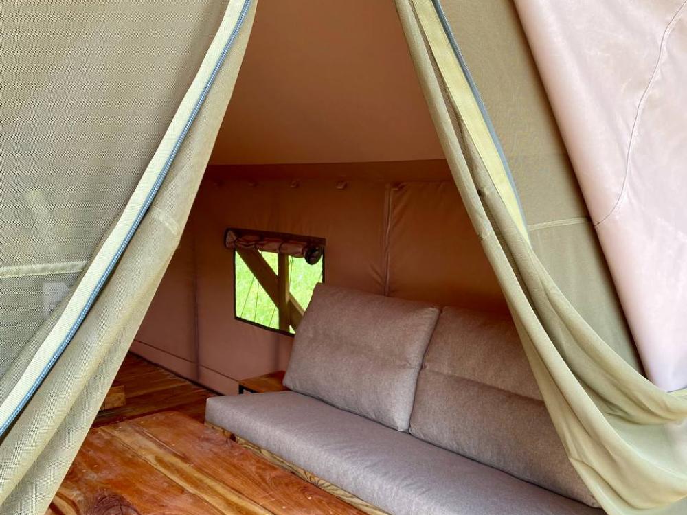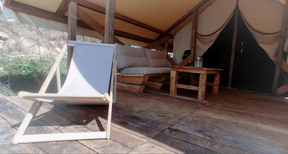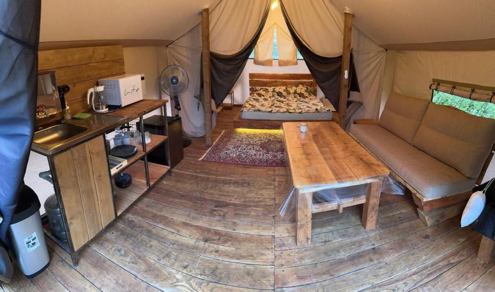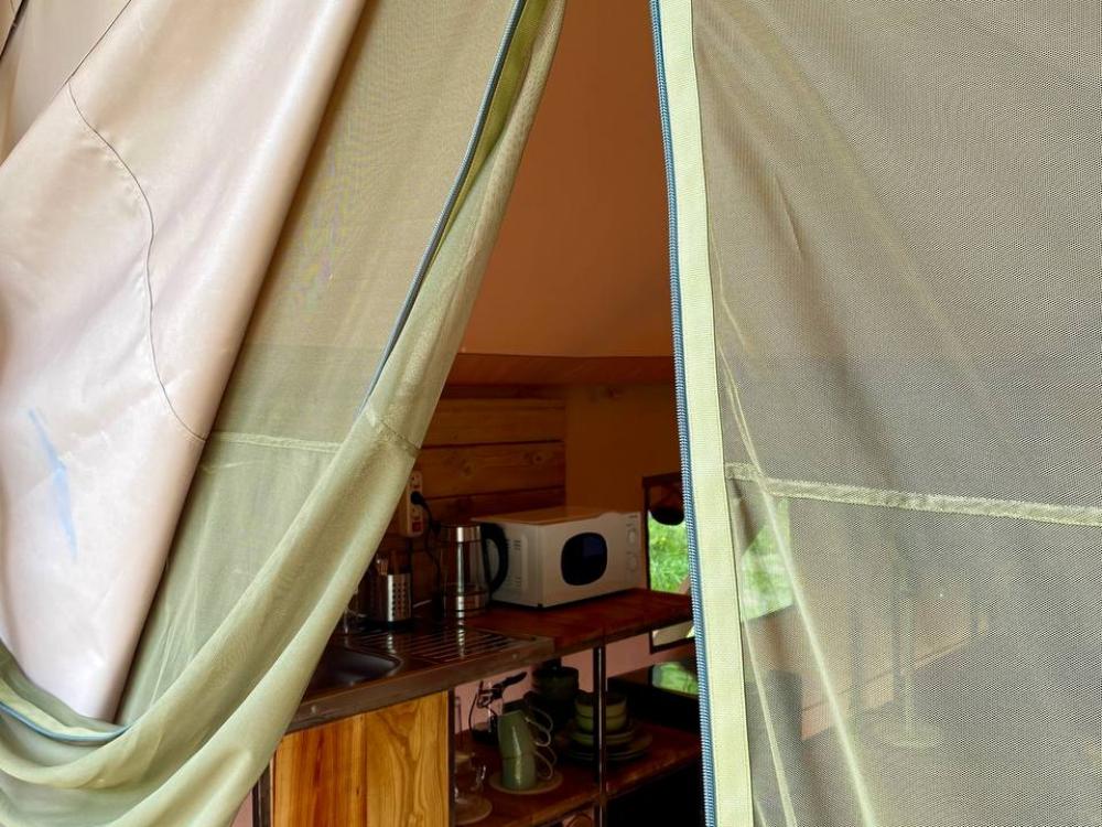 Сафари-тент «Воздух» - это 3-х местная палатка с террасой, закрытой зоной кухни. 2 основных спальных места расположены на кровати, а 3-е - на диванчике . Внутри палатки находятся 2 уютных пространства: спальное, с большой кроватью с подогревом и мягким постельным бельем, а также удобная кухонная зона со всем необходимым. Окна палатки обеспечивают естественное освещение и панорамный вид на окружающую природу. В палатке установлены нежные светильники, создающие уютную атмосферу вечером, а также техника контроля температуры. Через 15 метров от палатки находится сооружение с личным санузлом, который закрывается на замок. Зона спальни: jбогреватель, кровать кинг-сайз (180х200 см), стеллаж, постельное белье по количеству гостей, прикроватная тумба-табурет, розетки, теплая простынь, теплое центральное освещение, кондиционер. Зона кухни: диван, розетки, обеденный стол, табурет, вешалка для одежды, мусорный контейнер, холодильник, вентилятор, ковер, отопление, доступ к горячей воде, шезлонги, кухонный гарнитур, москитные сетки, раковина, посуда и столовые приборы, а также сахар, соль, перец, кофе и фирменный мезмайский чай. Индивидуальная ванная комната: душ, туалет, раковина, зеркало, полка для принадлежностей, полотенцесушитель, теплый пол, коврики, ершик, мусорная урна, розетки, вытяжка, а также гостевые шампуни, гели для душа, жидкое мыло и туалетная бумага.