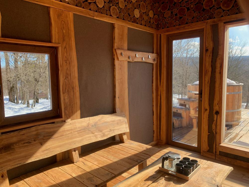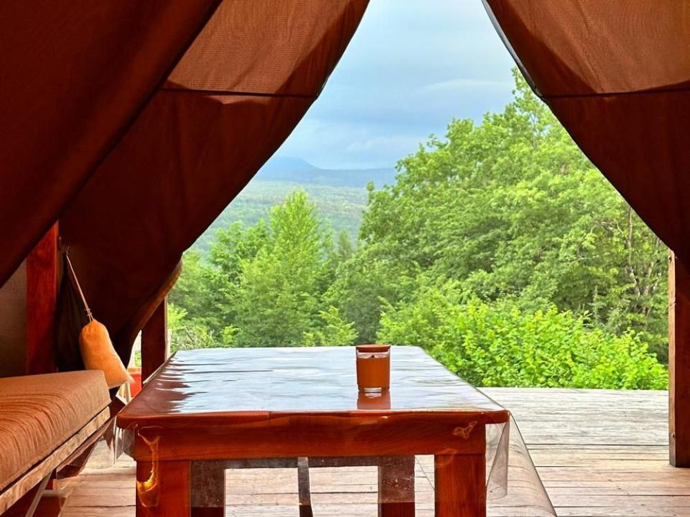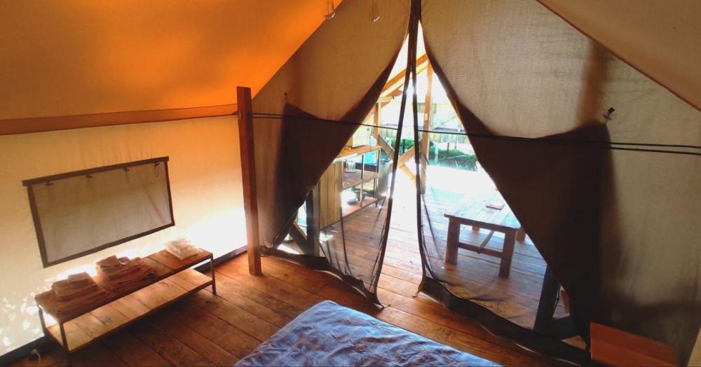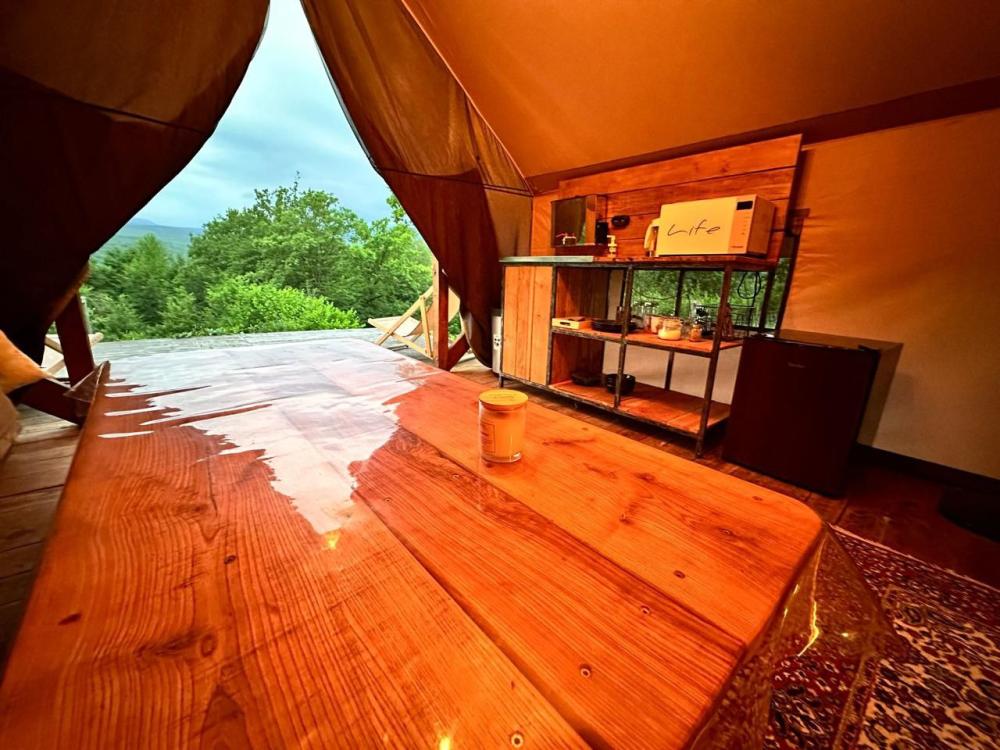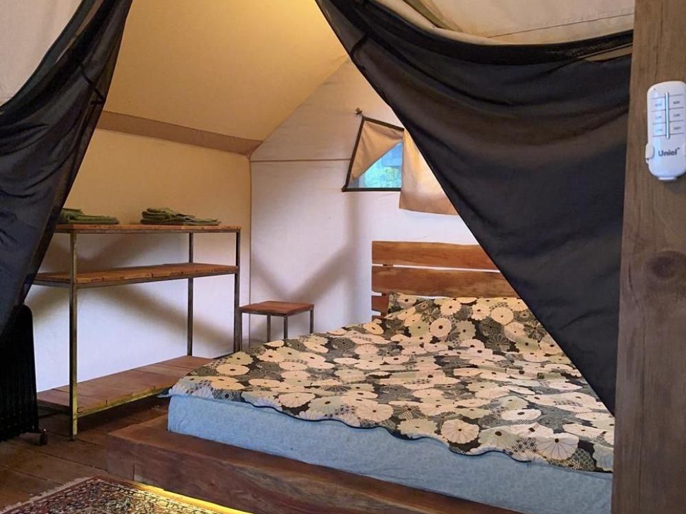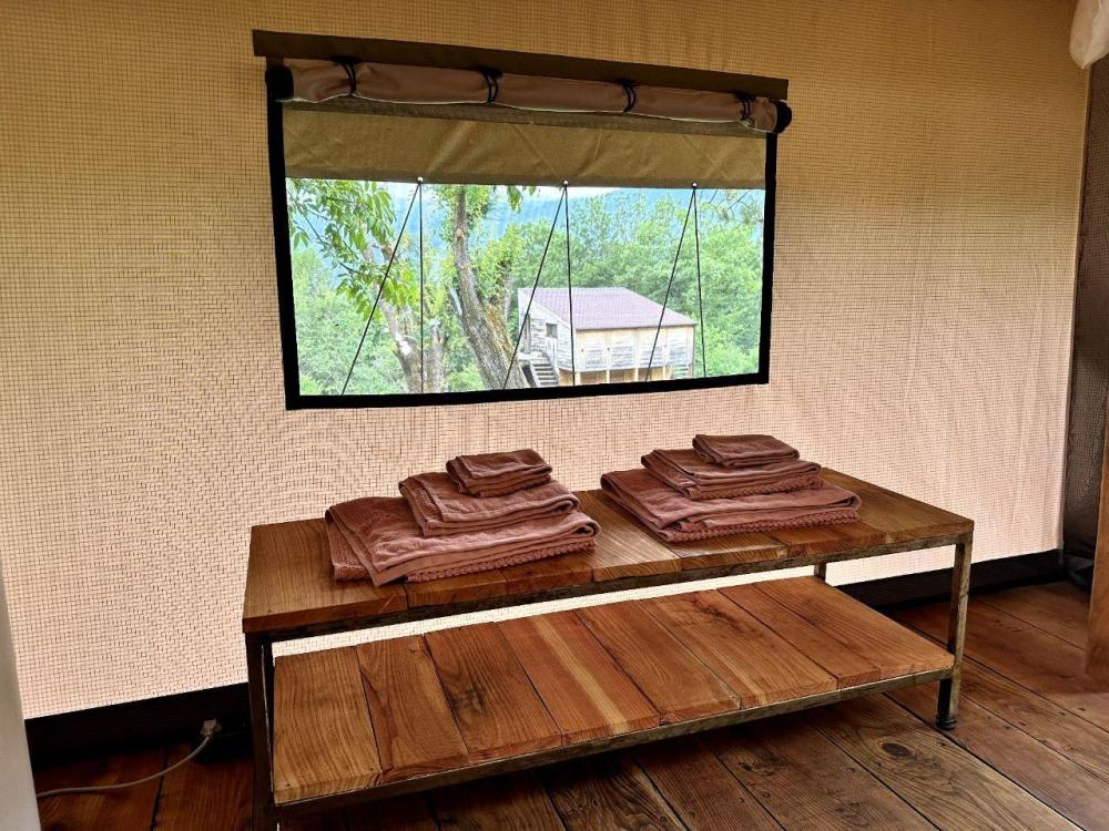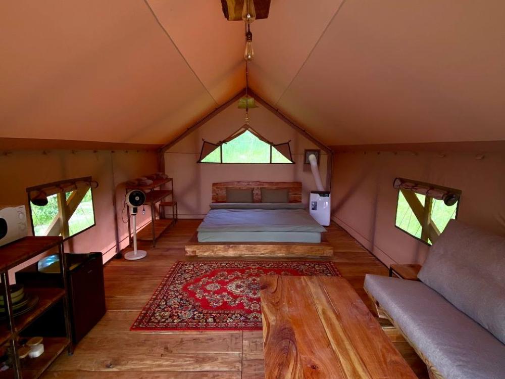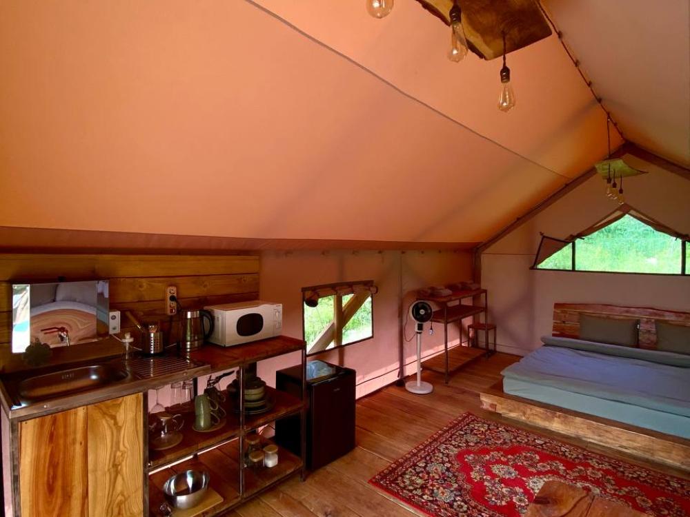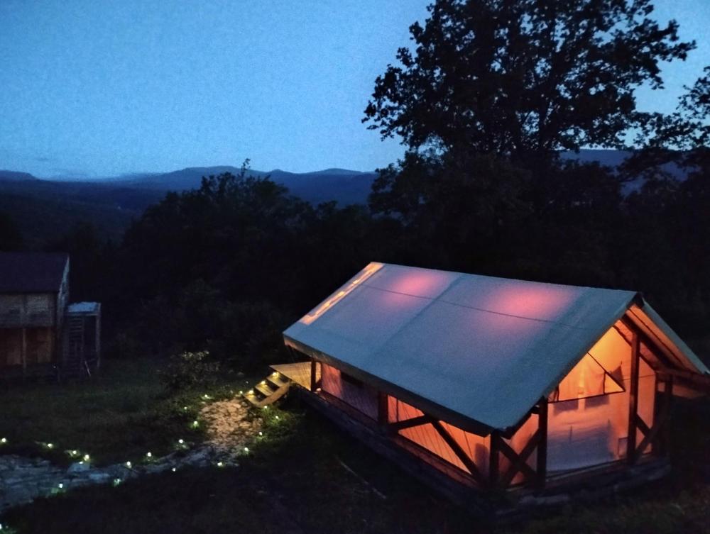 Сафари-тент «Воздух» - это 3-х местная палатка с террасой, закрытой зоной кухни. 2 основных спальных места расположены на кровати, а 3-е - на диванчике . Внутри палатки находятся 2 уютных пространства: спальное, с большой кроватью с подогревом и мягким постельным бельем, а также удобная кухонная зона со всем необходимым. Окна палатки обеспечивают естественное освещение и панорамный вид на окружающую природу. В палатке установлены нежные светильники, создающие уютную атмосферу вечером, а также техника контроля температуры. Через 15 метров от палатки находится сооружение с личным санузлом, который закрывается на замок. Зона спальни: jбогреватель, кровать кинг-сайз (180х200 см), стеллаж, постельное белье по количеству гостей, прикроватная тумба-табурет, розетки, теплая простынь, теплое центральное освещение, кондиционер. Зона кухни: диван, розетки, обеденный стол, табурет, вешалка для одежды, мусорный контейнер, холодильник, вентилятор, ковер, отопление, доступ к горячей воде, шезлонги, кухонный гарнитур, москитные сетки, раковина, посуда и столовые приборы, а также сахар, соль, перец, кофе и фирменный мезмайский чай. Индивидуальная ванная комната: душ, туалет, раковина, зеркало, полка для принадлежностей, полотенцесушитель, теплый пол, коврики, ершик, мусорная урна, розетки, вытяжка, а также гостевые шампуни, гели для душа, жидкое мыло и туалетная бумага.