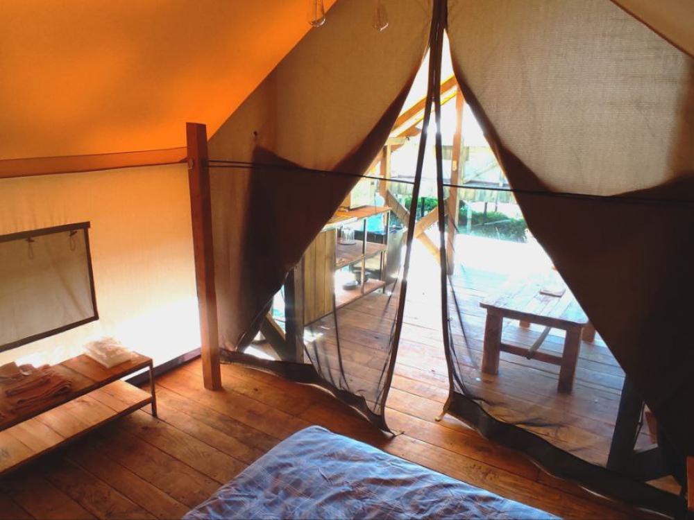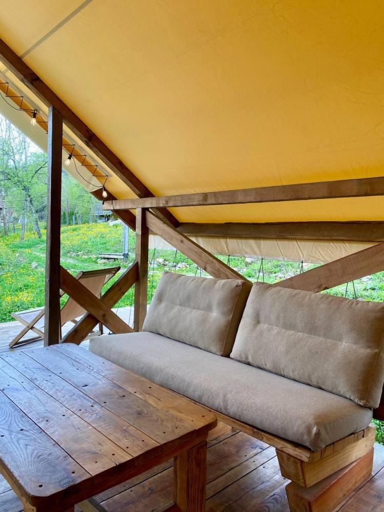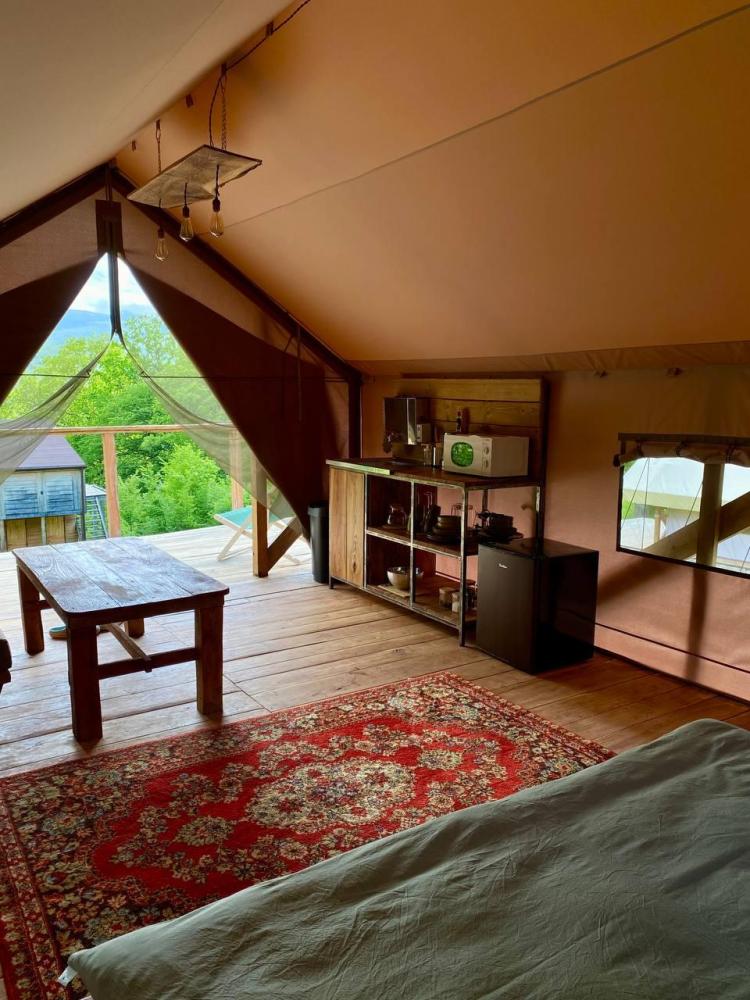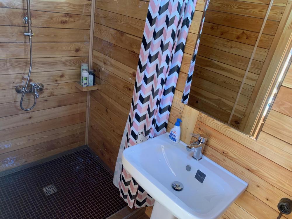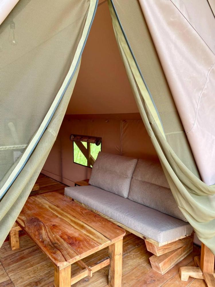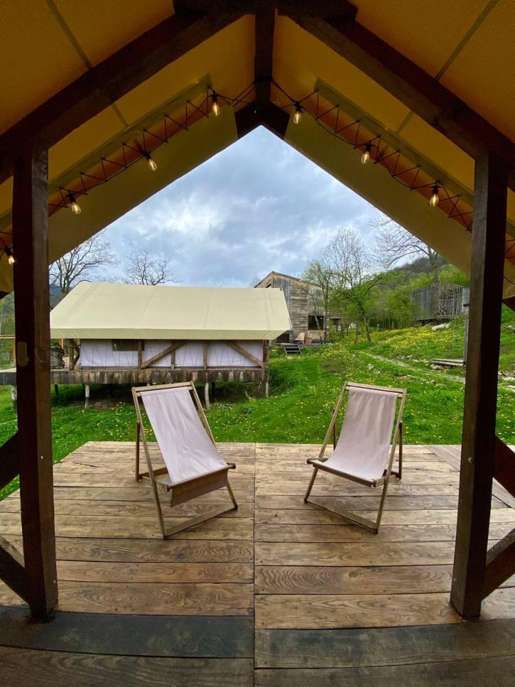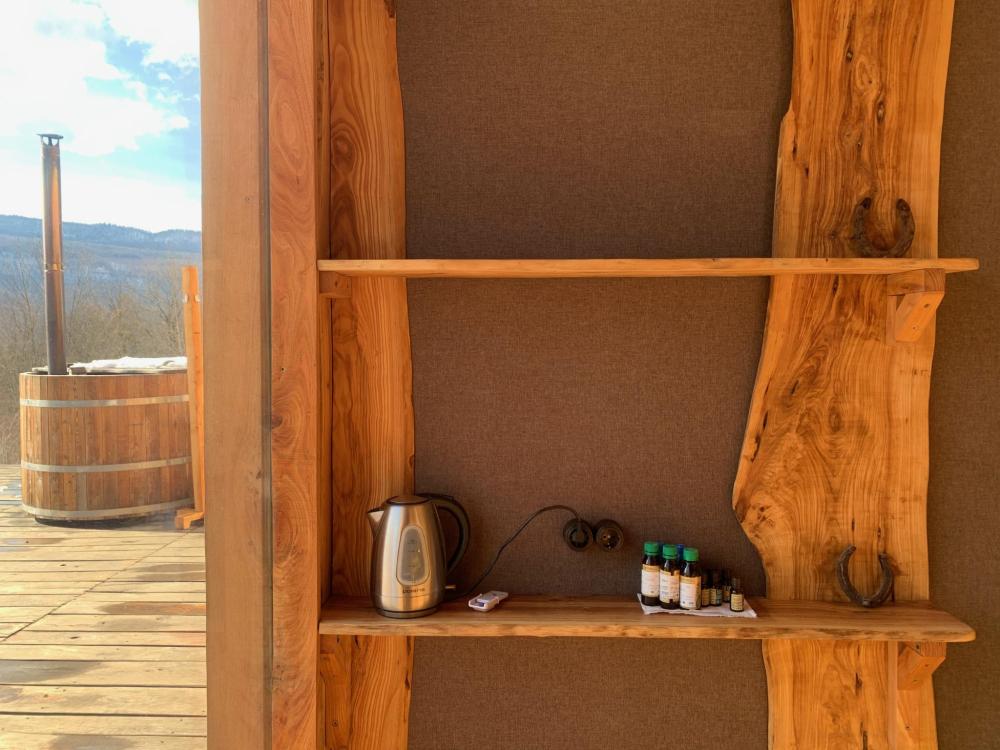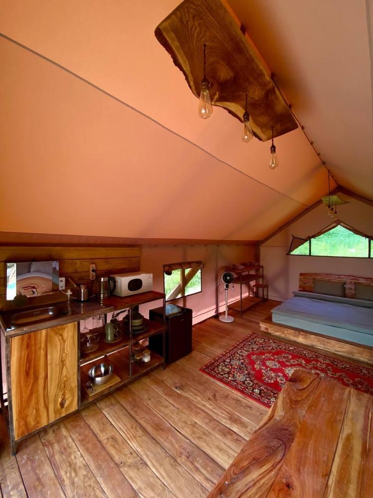 Сафари-тент «Воздух» - это 3-х местная палатка с террасой, закрытой зоной кухни. 2 основных спальных места расположены на кровати, а 3-е - на диванчике . Внутри палатки находятся 2 уютных пространства: спальное, с большой кроватью с подогревом и мягким постельным бельем, а также удобная кухонная зона со всем необходимым. Окна палатки обеспечивают естественное освещение и панорамный вид на окружающую природу. В палатке установлены нежные светильники, создающие уютную атмосферу вечером, а также техника контроля температуры. Через 15 метров от палатки находится сооружение с личным санузлом, который закрывается на замок. Зона спальни: jбогреватель, кровать кинг-сайз (180х200 см), стеллаж, постельное белье по количеству гостей, прикроватная тумба-табурет, розетки, теплая простынь, теплое центральное освещение, кондиционер. Зона кухни: диван, розетки, обеденный стол, табурет, вешалка для одежды, мусорный контейнер, холодильник, вентилятор, ковер, отопление, доступ к горячей воде, шезлонги, кухонный гарнитур, москитные сетки, раковина, посуда и столовые приборы, а также сахар, соль, перец, кофе и фирменный мезмайский чай. Индивидуальная ванная комната: душ, туалет, раковина, зеркало, полка для принадлежностей, полотенцесушитель, теплый пол, коврики, ершик, мусорная урна, розетки, вытяжка, а также гостевые шампуни, гели для душа, жидкое мыло и туалетная бумага.