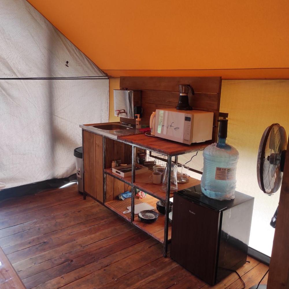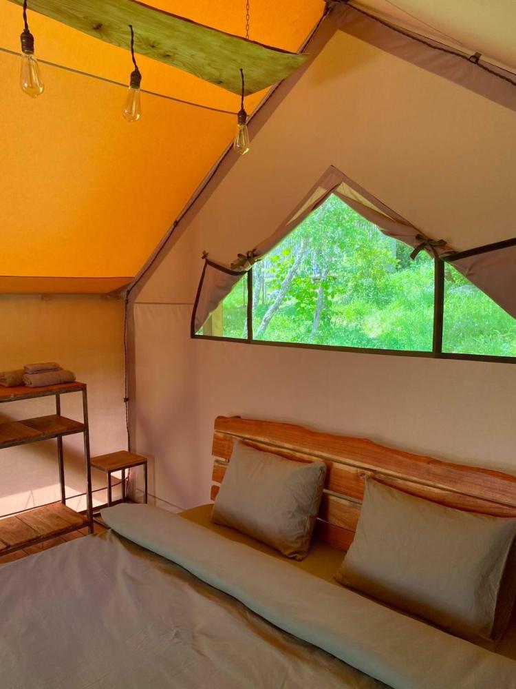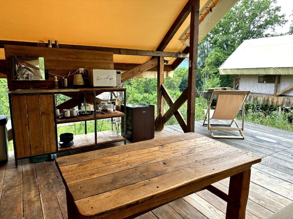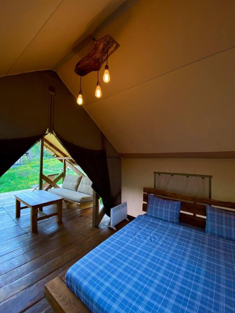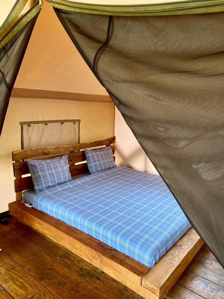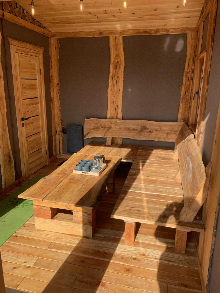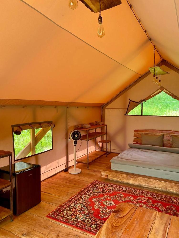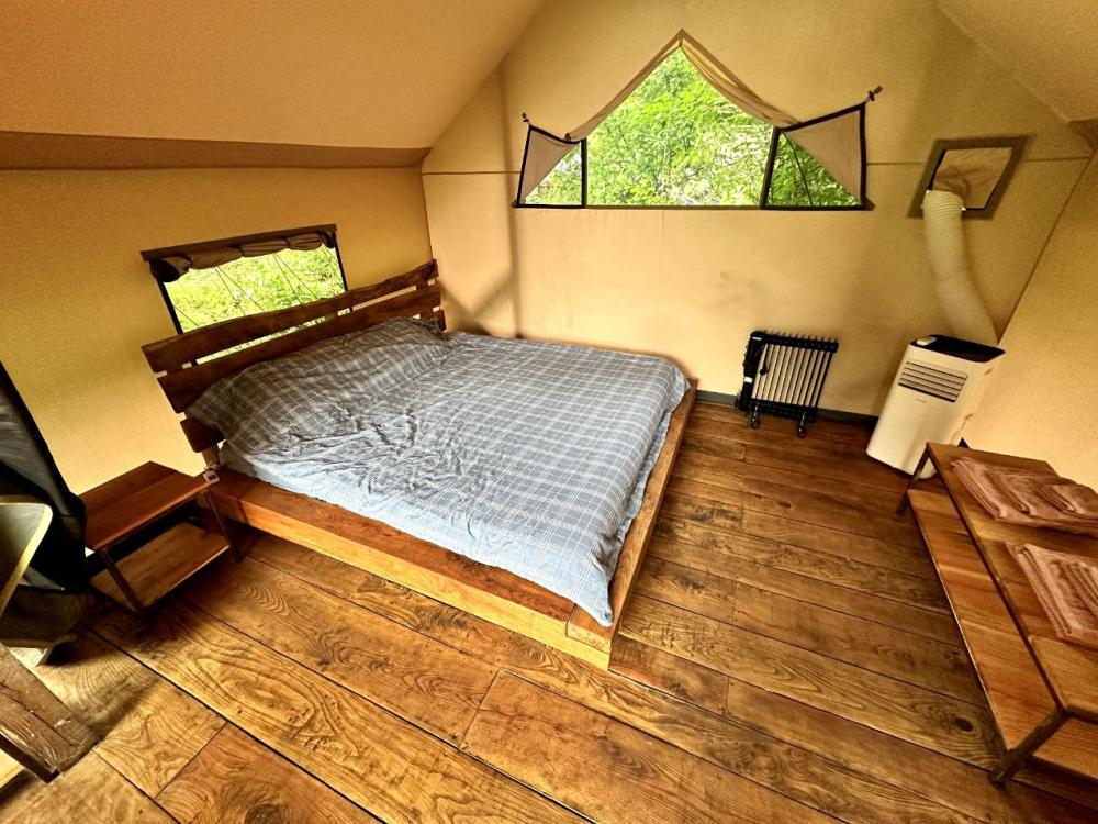 Сафари-тент «Воздух» - это 3-х местная палатка с террасой, закрытой зоной кухни. 2 основных спальных места расположены на кровати, а 3-е - на диванчике . Внутри палатки находятся 2 уютных пространства: спальное, с большой кроватью с подогревом и мягким постельным бельем, а также удобная кухонная зона со всем необходимым. Окна палатки обеспечивают естественное освещение и панорамный вид на окружающую природу. В палатке установлены нежные светильники, создающие уютную атмосферу вечером, а также техника контроля температуры. Через 15 метров от палатки находится сооружение с личным санузлом, который закрывается на замок. Зона спальни: jбогреватель, кровать кинг-сайз (180х200 см), стеллаж, постельное белье по количеству гостей, прикроватная тумба-табурет, розетки, теплая простынь, теплое центральное освещение, кондиционер. Зона кухни: диван, розетки, обеденный стол, табурет, вешалка для одежды, мусорный контейнер, холодильник, вентилятор, ковер, отопление, доступ к горячей воде, шезлонги, кухонный гарнитур, москитные сетки, раковина, посуда и столовые приборы, а также сахар, соль, перец, кофе и фирменный мезмайский чай. Индивидуальная ванная комната: душ, туалет, раковина, зеркало, полка для принадлежностей, полотенцесушитель, теплый пол, коврики, ершик, мусорная урна, розетки, вытяжка, а также гостевые шампуни, гели для душа, жидкое мыло и туалетная бумага.