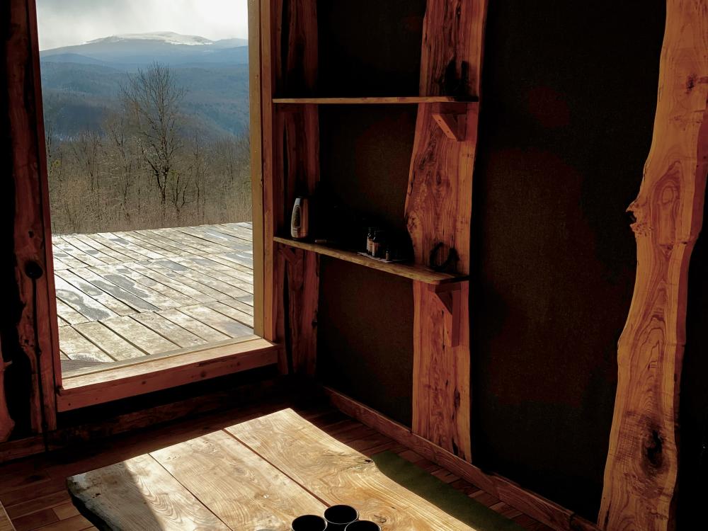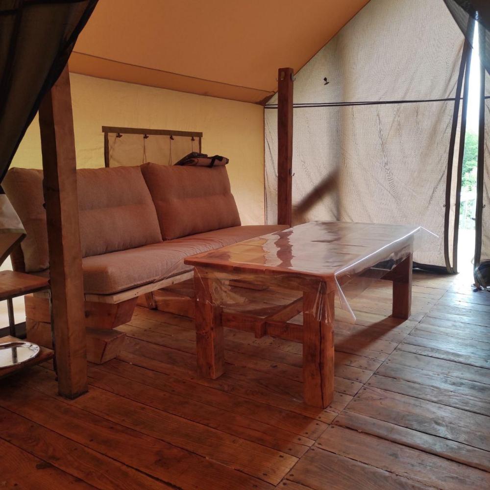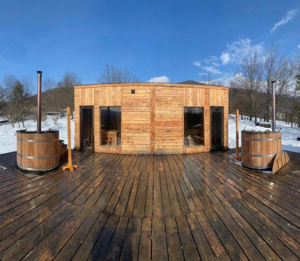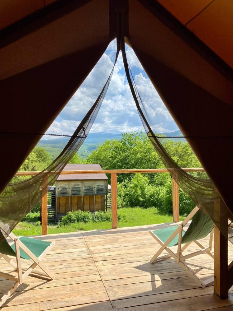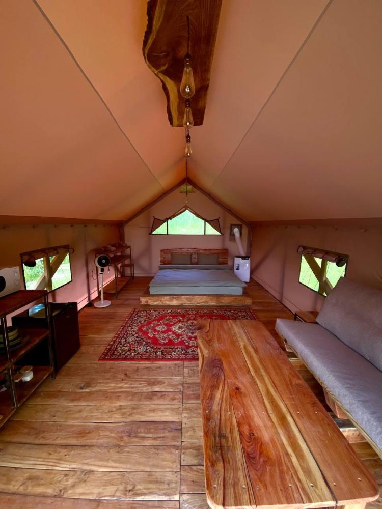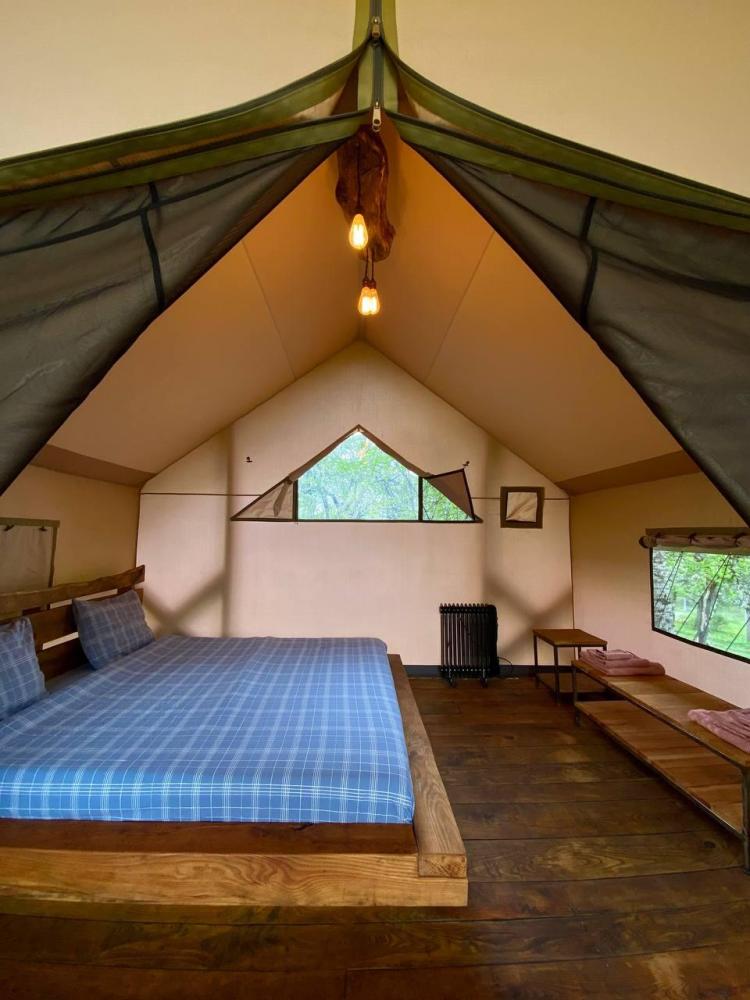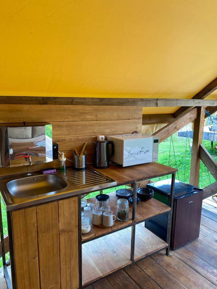 Сафари-тент «Воздух» - это 3-х местная палатка с террасой, закрытой зоной кухни. 2 основных спальных места расположены на кровати, а 3-е - на диванчике . Внутри палатки находятся 2 уютных пространства: спальное, с большой кроватью с подогревом и мягким постельным бельем, а также удобная кухонная зона со всем необходимым. Окна палатки обеспечивают естественное освещение и панорамный вид на окружающую природу. В палатке установлены нежные светильники, создающие уютную атмосферу вечером, а также техника контроля температуры. Через 15 метров от палатки находится сооружение с личным санузлом, который закрывается на замок. Зона спальни: jбогреватель, кровать кинг-сайз (180х200 см), стеллаж, постельное белье по количеству гостей, прикроватная тумба-табурет, розетки, теплая простынь, теплое центральное освещение, кондиционер. Зона кухни: диван, розетки, обеденный стол, табурет, вешалка для одежды, мусорный контейнер, холодильник, вентилятор, ковер, отопление, доступ к горячей воде, шезлонги, кухонный гарнитур, москитные сетки, раковина, посуда и столовые приборы, а также сахар, соль, перец, кофе и фирменный мезмайский чай. Индивидуальная ванная комната: душ, туалет, раковина, зеркало, полка для принадлежностей, полотенцесушитель, теплый пол, коврики, ершик, мусорная урна, розетки, вытяжка, а также гостевые шампуни, гели для душа, жидкое мыло и туалетная бумага.