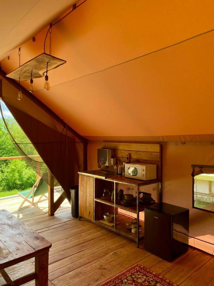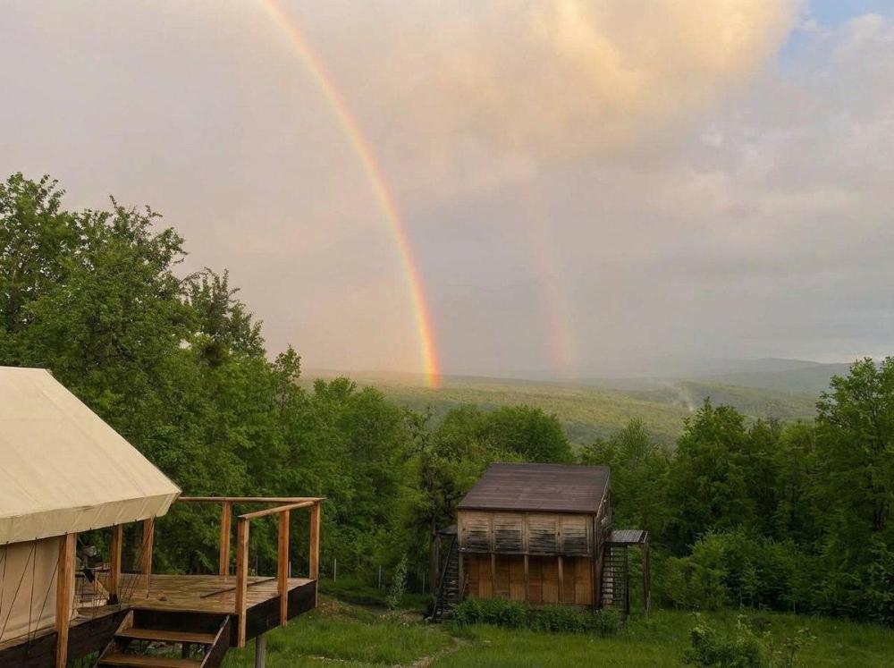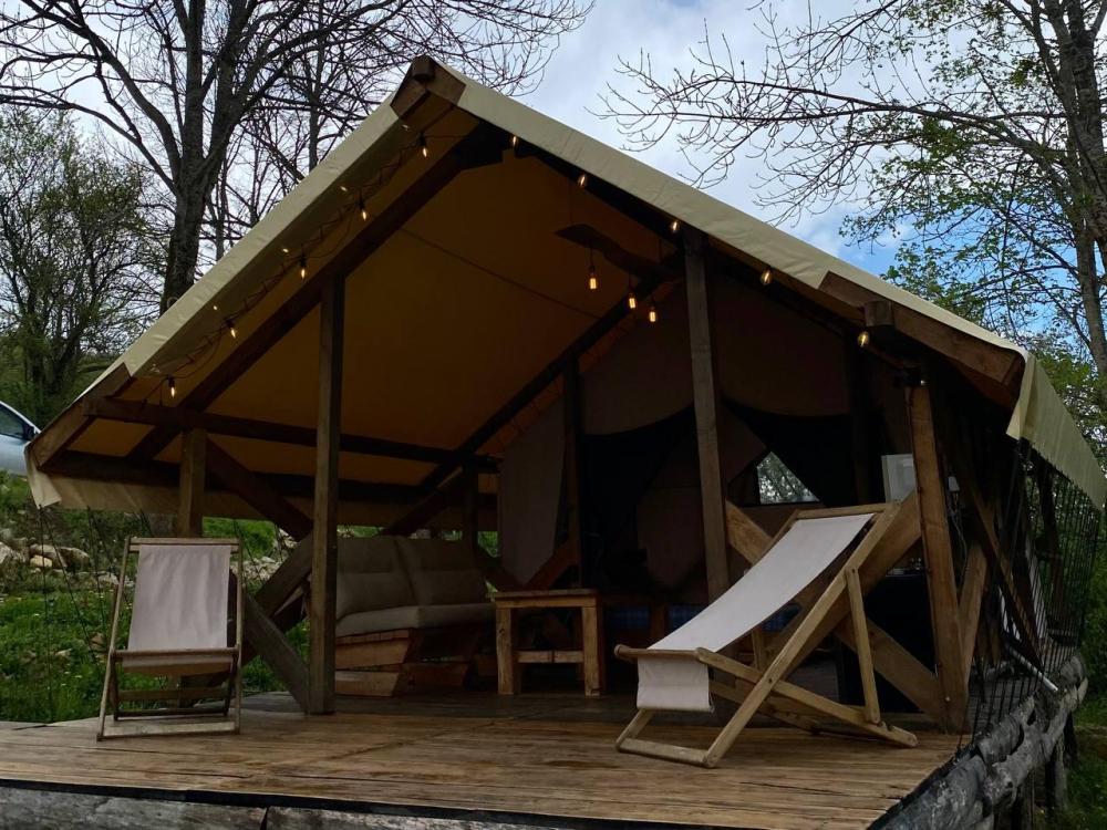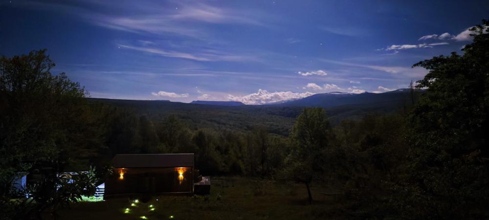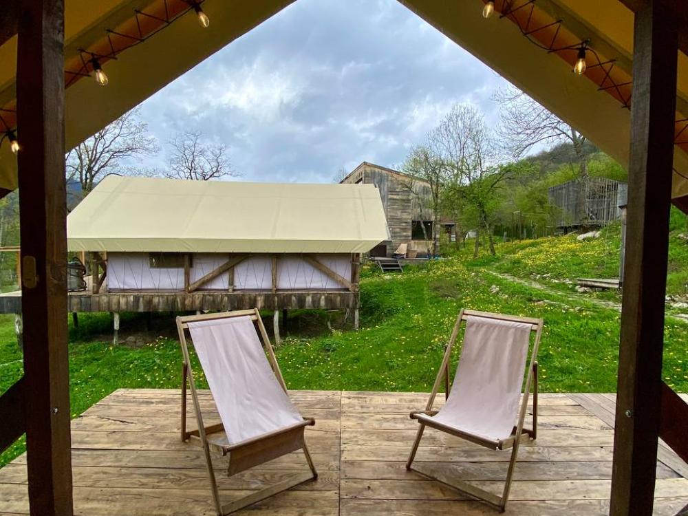 Сафари-тент «Земля» - это 2-х местная палатка с террасой и открытой зоной кухни. 2 основных спальных места расположены на большой удобной кровати. Внутри палатки уютное пространство с большой кроватью с подогревом и мягким постельным бельем, а также удобное пространство кухни, со всем необходимым. Окна палатки обеспечивают естественное освещение и панорамный вид на окружающую природу. В палатке установлены нежные светильники, создающие уютную атмосферу вечером, а также техника контроля температуры. Через 15 метров от палатки находится сансооружение с личным санузлом, который замыкается на замок. Зона спальни: jбогреватель, кровать кинг-сайз (180х190), стеллаж, постельное белье и полотенца по количеству гостей, прикроватная тумба-табурет, розетки, теплая простынь, теплое центральное освещение, кондиционер, вешалка для одежды, москитные сетки. Зона кухни: диван, розетки, кухонный гарнитур, обеденный стол, табурет, мусорный контейнер, холодильник, раковина, посуда и столовые приборы, доступ к горячей воде, шезлонги, стол, табуреты, раковина, посуда и столовые приборы, а также сахар, соль, перец, кофе и фирменный мезмайский чай. Индивидуальная ванная комната: душ, туалет, раковина, зеркало, полка для принадлежностей, полотенцесушитель, теплый пол, коврики, ершик, мусорная урна, розетки, вытяжка, а также гостевые шампуни, гели для душа, жидкое мыло и туалетная бумага.