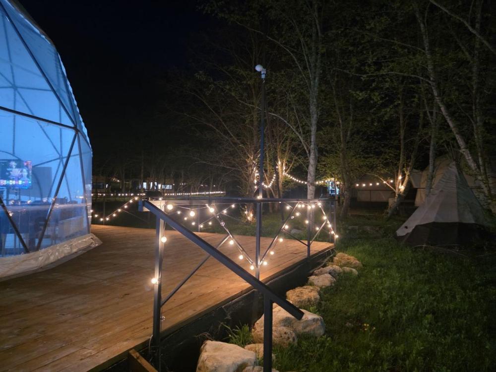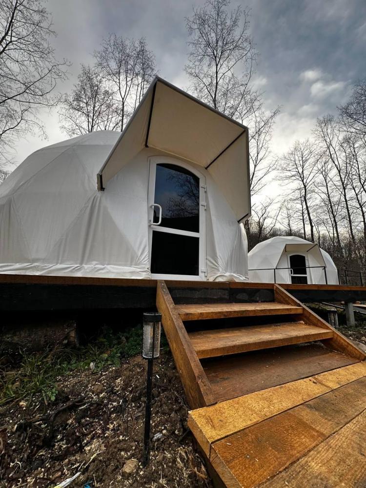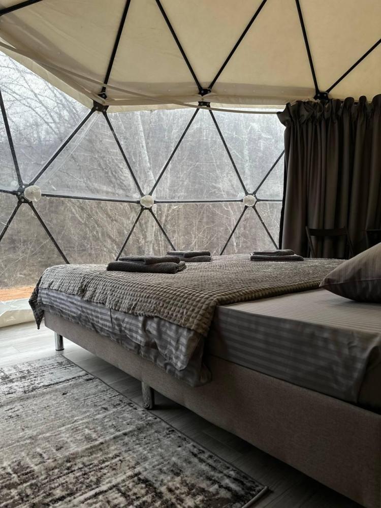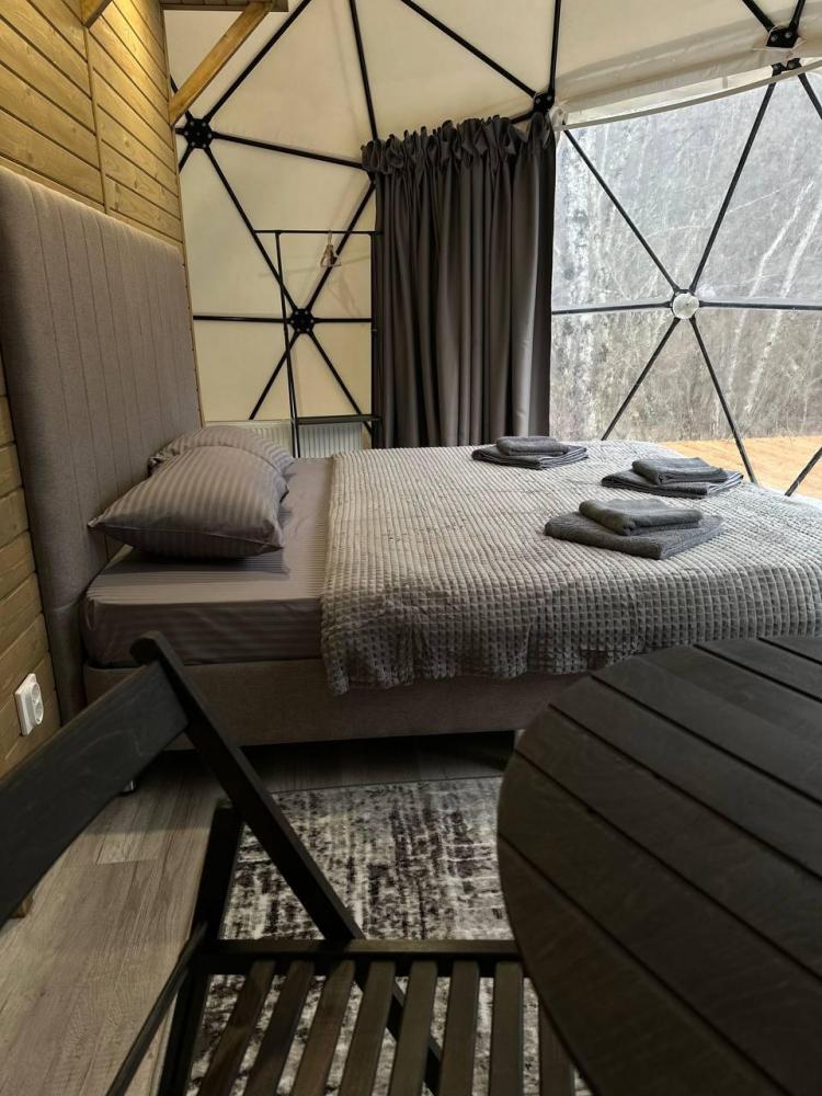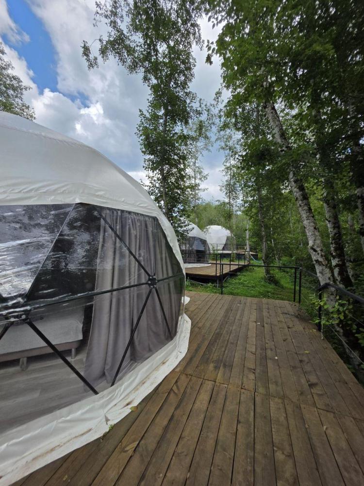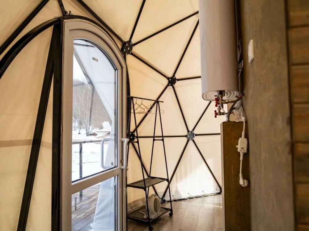 Вместимость: до 3 человек. Двуспальная кровать + дополнительное место на втором уровне. Для комфортного проживания каждая сфера оборудована сплит-системой с режимами «обогрев/охлаждение», розетками, отдельным санузлом с душем и необходимыми душевыми принадлежностями премиального качества. Телевизор, холодильник, чайник, посуда.