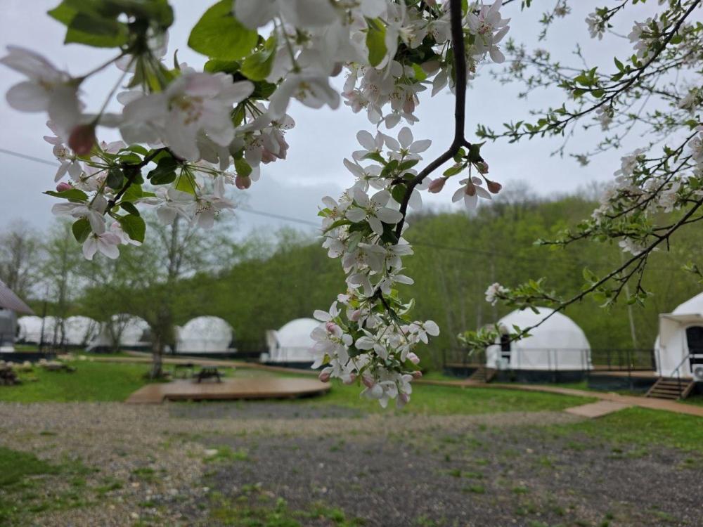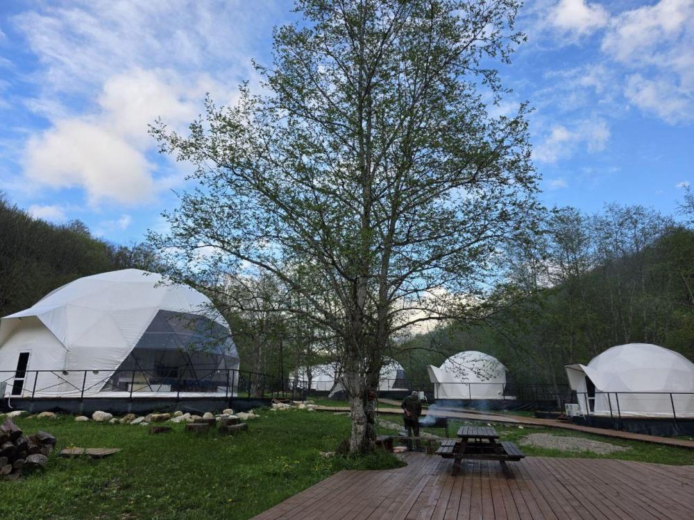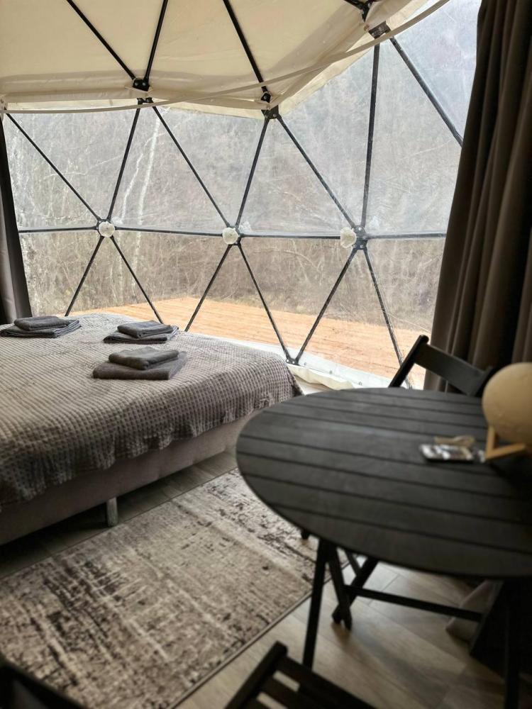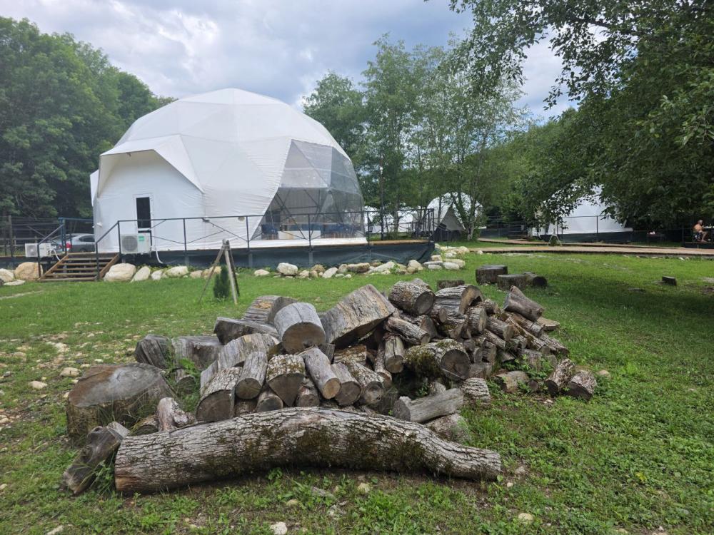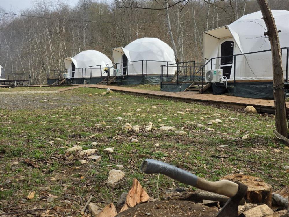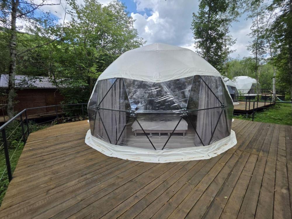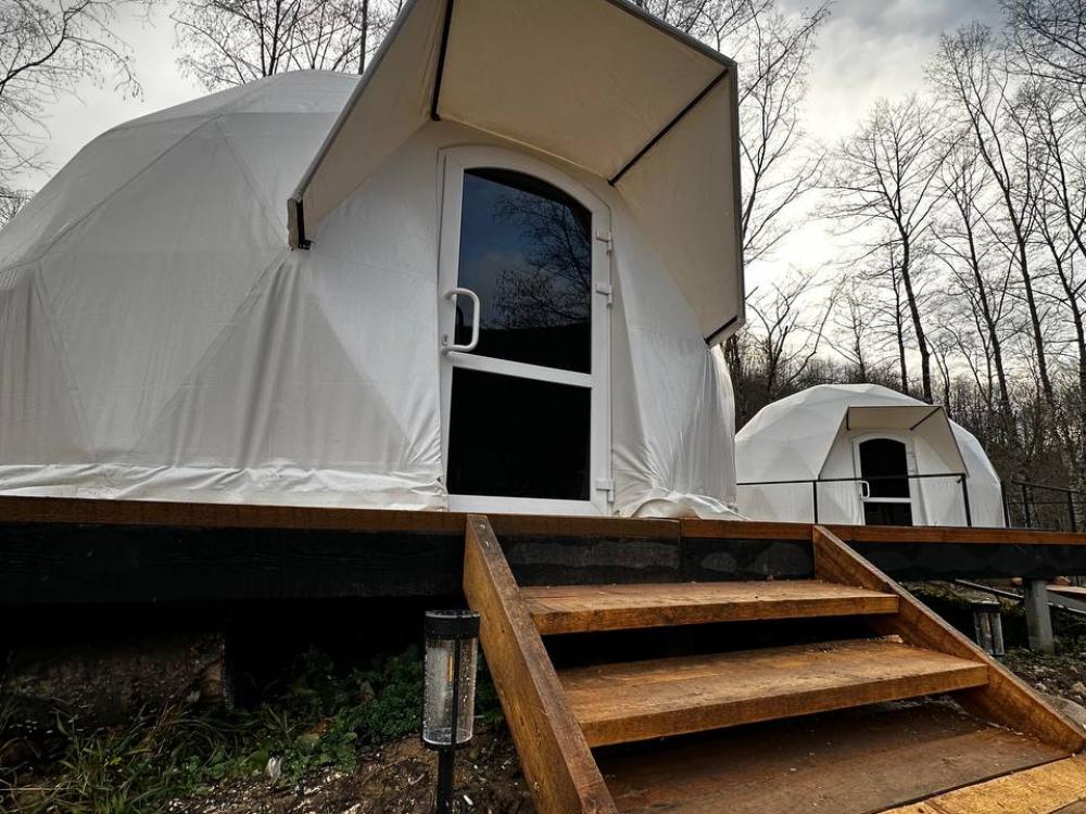 Вместимость: до 3 человек. Двуспальная кровать + дополнительное место на втором уровне. Для комфортного проживания каждая сфера оборудована сплит-системой с режимами «обогрев/охлаждение», розетками, отдельным санузлом с душем и необходимыми душевыми принадлежностями премиального качества. Телевизор, холодильник, чайник, посуда.