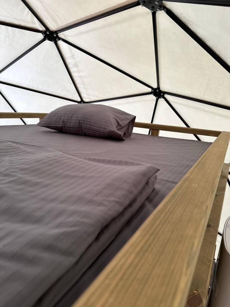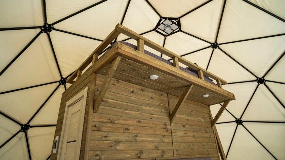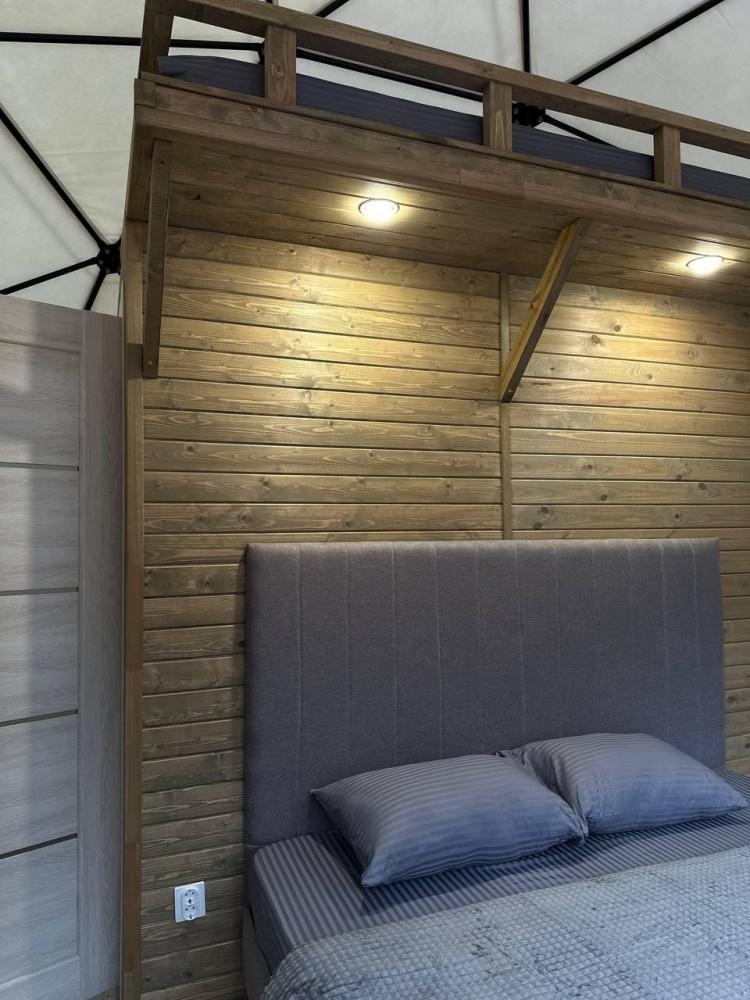 Двуспальная кровать + дополнительное место на втором уровне. Для комфортного проживания каждая сфера оборудована сплит-системой с режимами «обогрев/охлаждение», розетками, отдельным санузлом с душем и необходимыми душевыми принадлежностями премиального качества. Телевизор, холодильник, чайник, посуда.