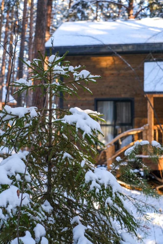 В Глэмпинге идеальное сочетание дизайнерского интерьера, девственного леса и полного комфорта. Оснащение: двуспальная кровать - 200х160, прикроватные столики, обеденный стол, обеденные стулья, 2 кресло - кровати. шкаф для одежды, комод, кухонная зона. Бытовая техника: холодильник, чайник, микроволновая печь, вентилятор, обогреватель, теплый пол. Общий санузел на 6 туалетных и 4 душевых кабинки.