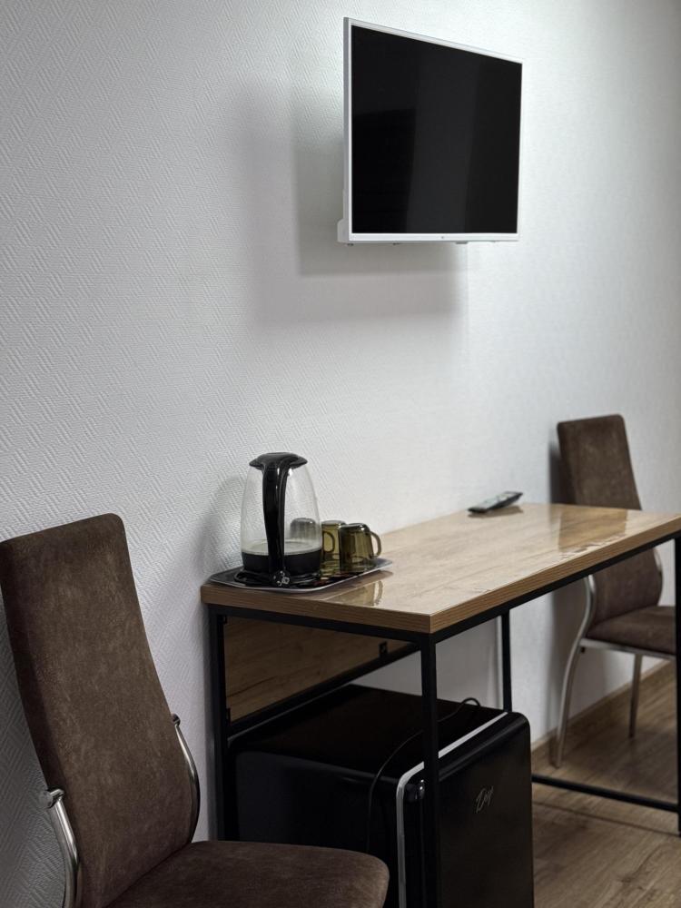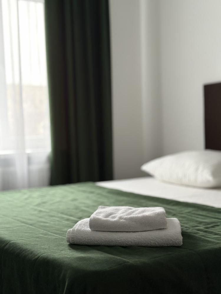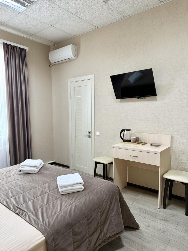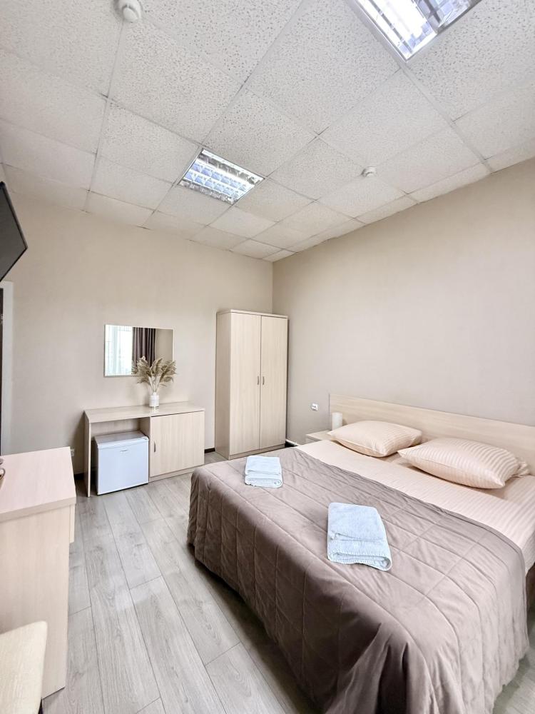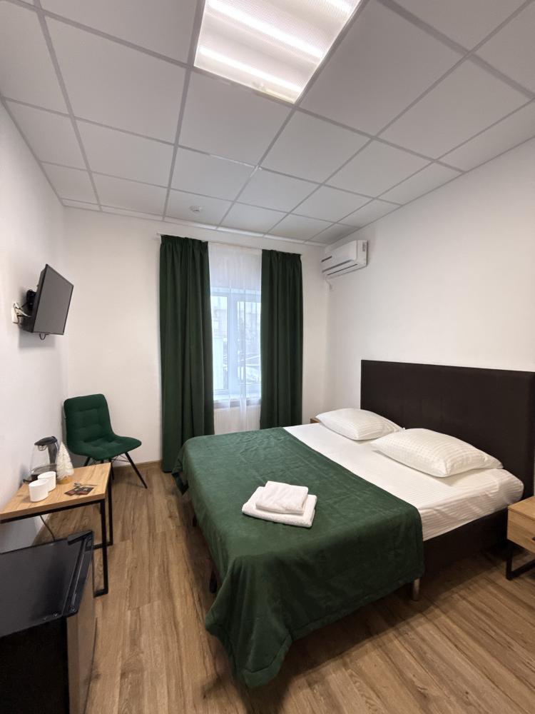 Уютный номер делюкс с 1 двуспальной кроватью. В номере предусмотрены: телевизор, WiFi, чайник, холодильник.