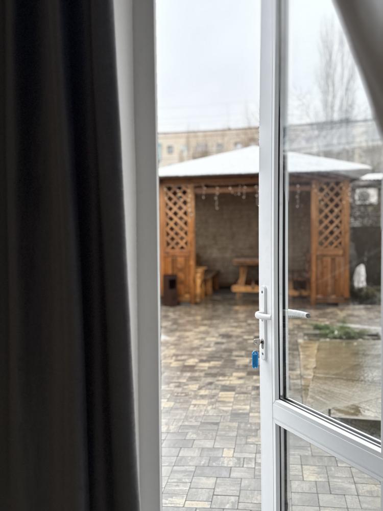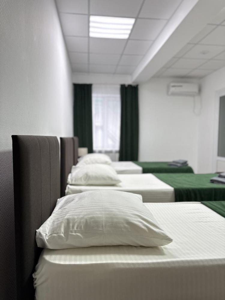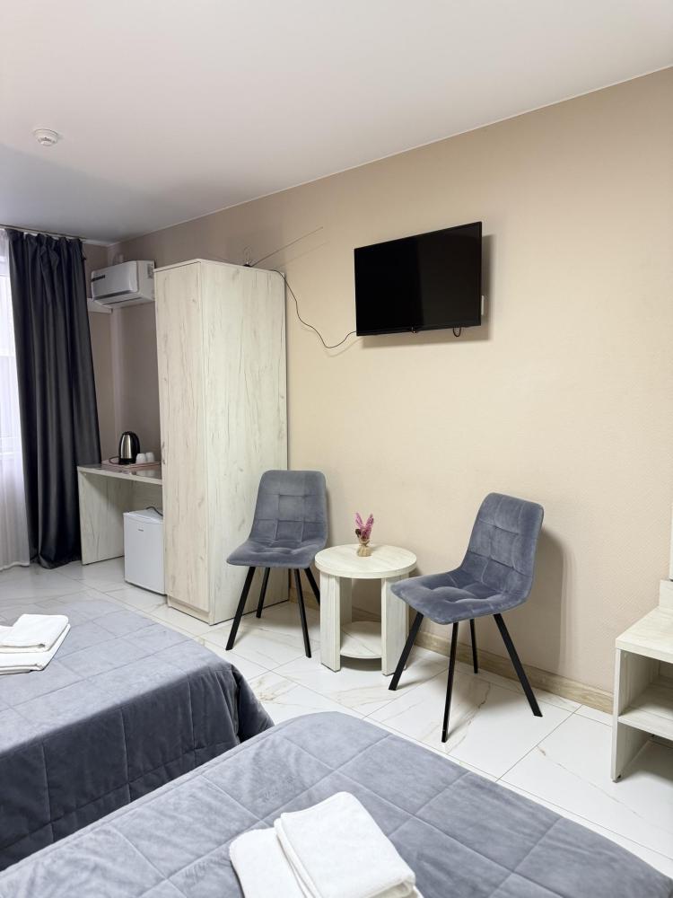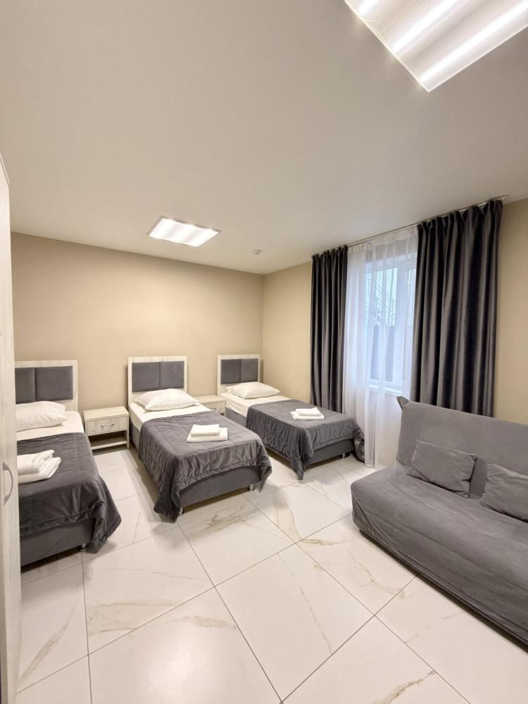 В номере три раздельные кровати, телевизор, чайник, кондиционер, площадь 15 кв. м. Душ и туалет на этаже.