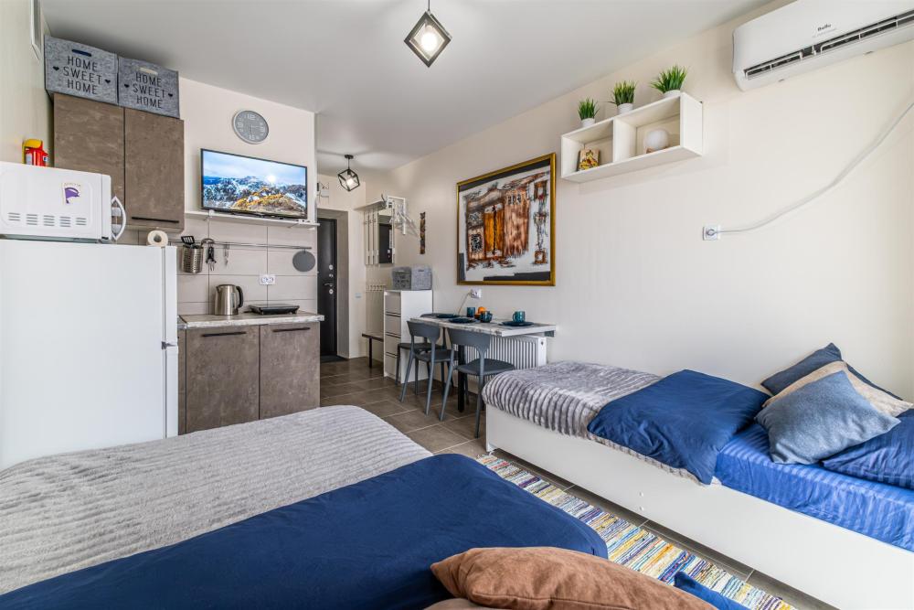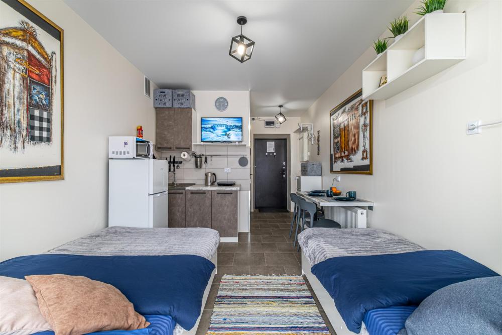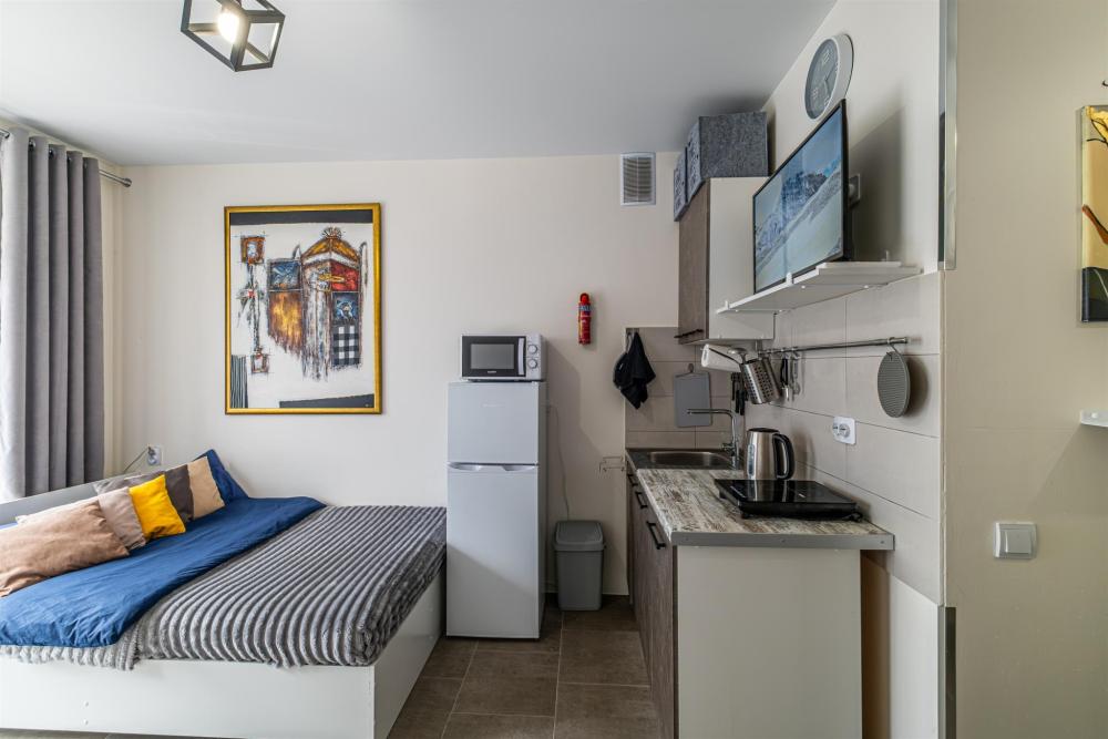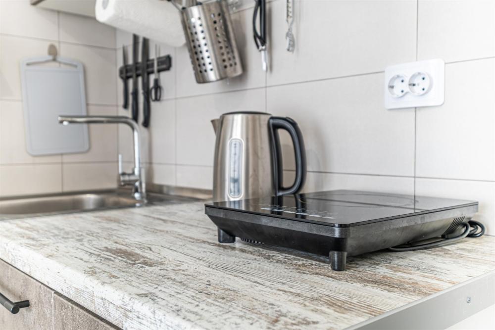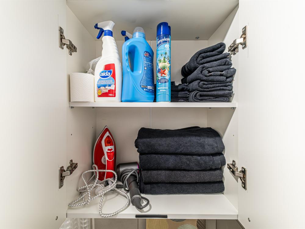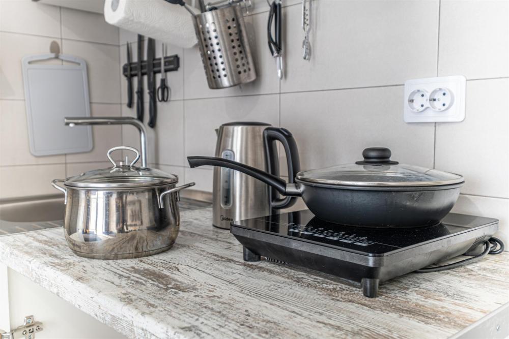 -Функциональное кухонное пространство. Есть все необходимое (посуда, кастрюли, сковородки, кружки, столовые приборы и т.д.). В наличии минимальный набор продуктов: растительное масло, соль, сахар, чай, кофе.