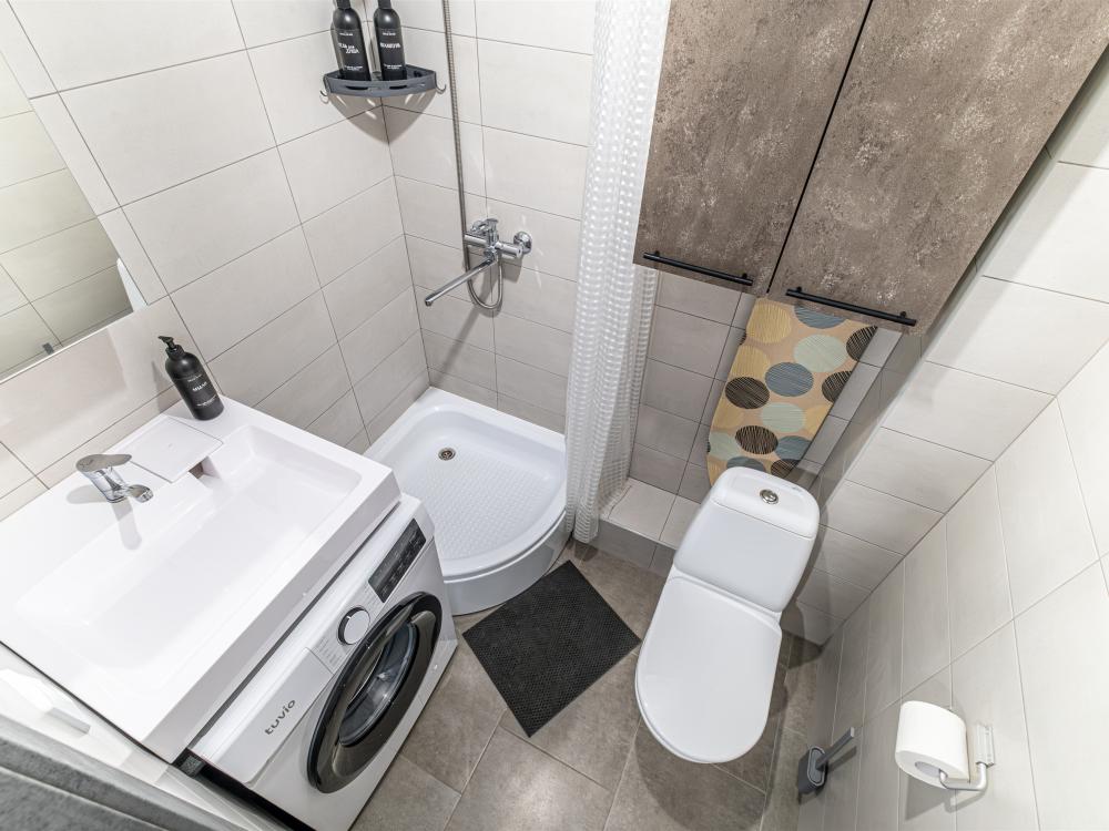 -Санузел с ванной, совмещенный. Чистые полотенца, средства гигиены, туалетная бумага, стиральная машина, фен, утюг.