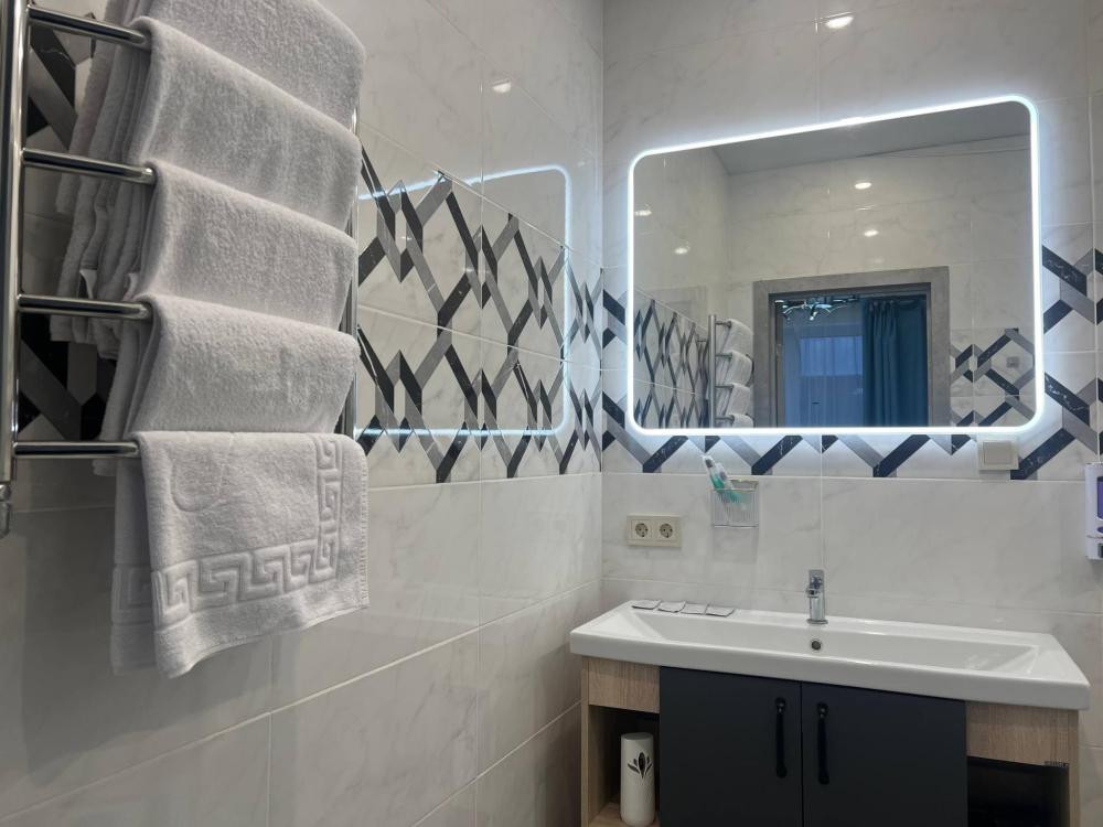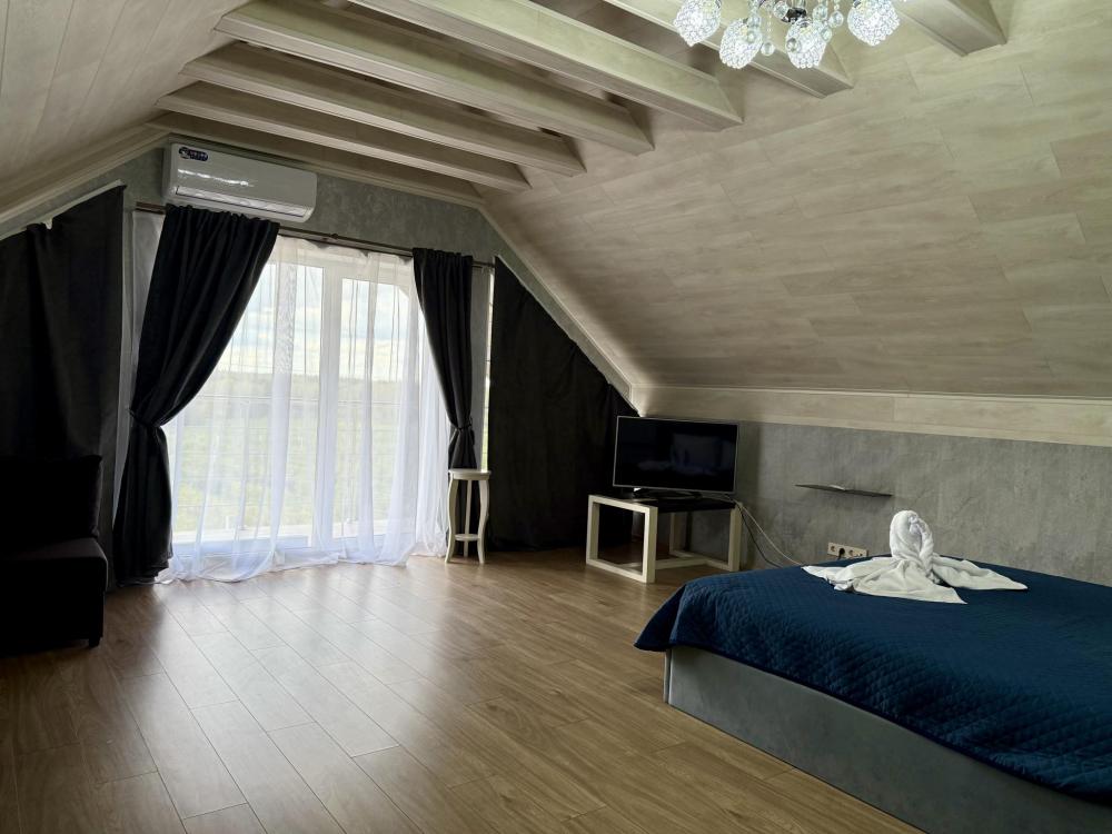 Номер люкс общей площадью 40 кв.м. для размещения до 4-х гостей. В номере: двухспальная кровать, диван, прикроватные тумбочки, постельное белье и полотенца, мини-кухня, телевизор, ванная комната с душем, туалетно-косметические принадлежности.