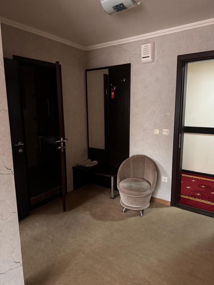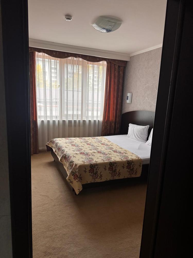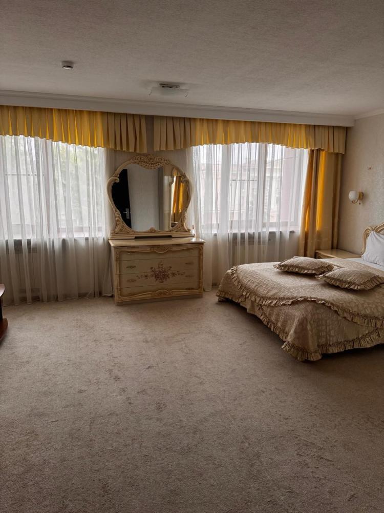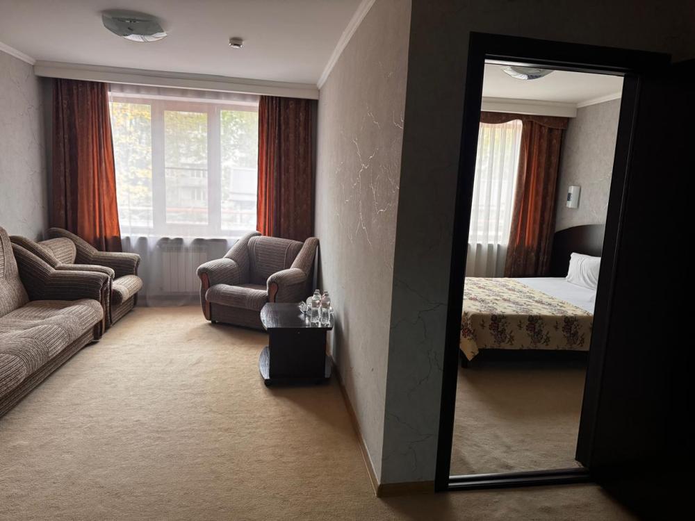 Двухкомнатный номер "Люкс". В отдельной комнате двуспальная кровать, шкаф, прикроватные тумбы. В основной комнате диван и 2 кресла, журнальный стол. Телевизор, холодильник, чайник. Туалетные принадлежности, тапочки, халат. Фен предоставляется по требованию. Бесплатный Wi-Fi.