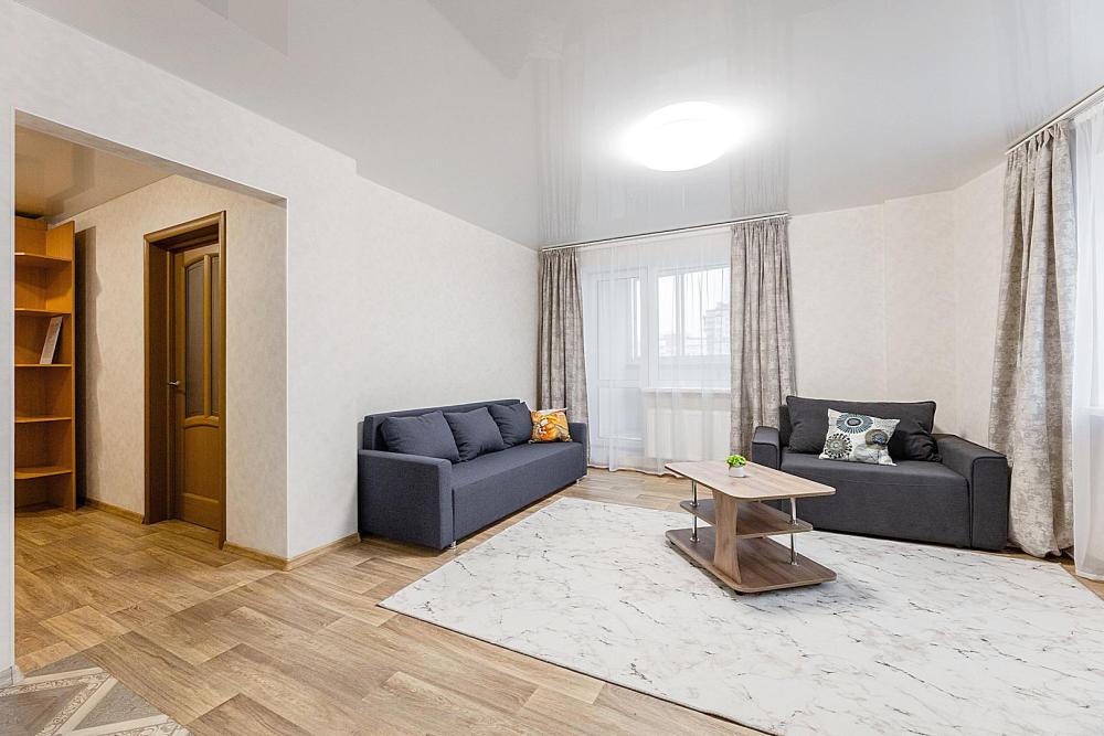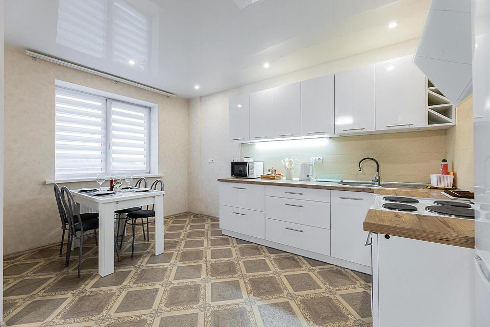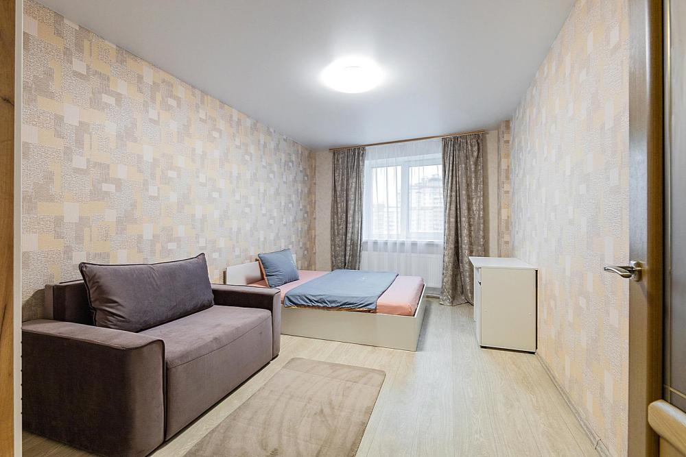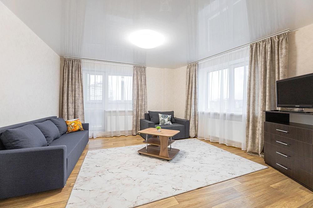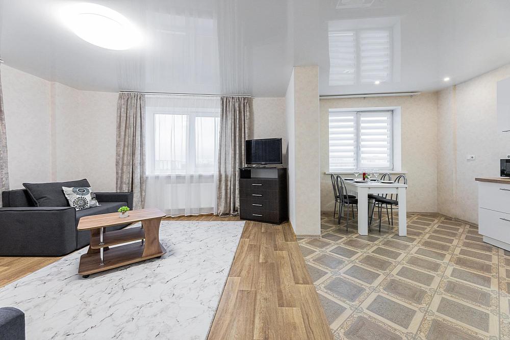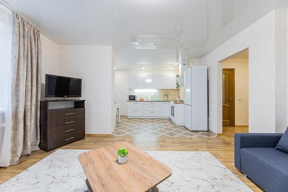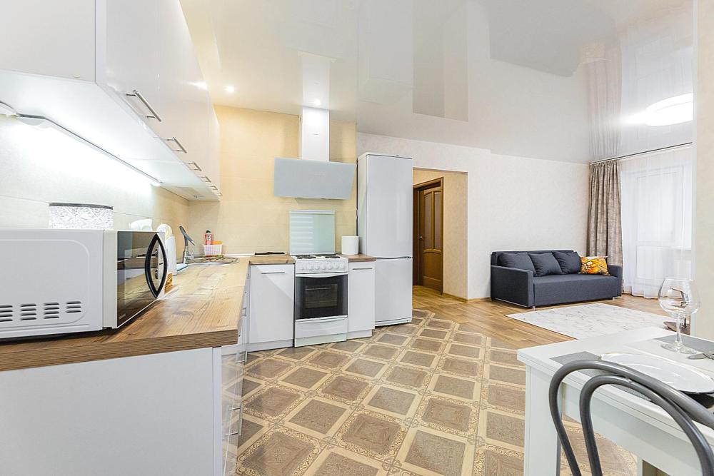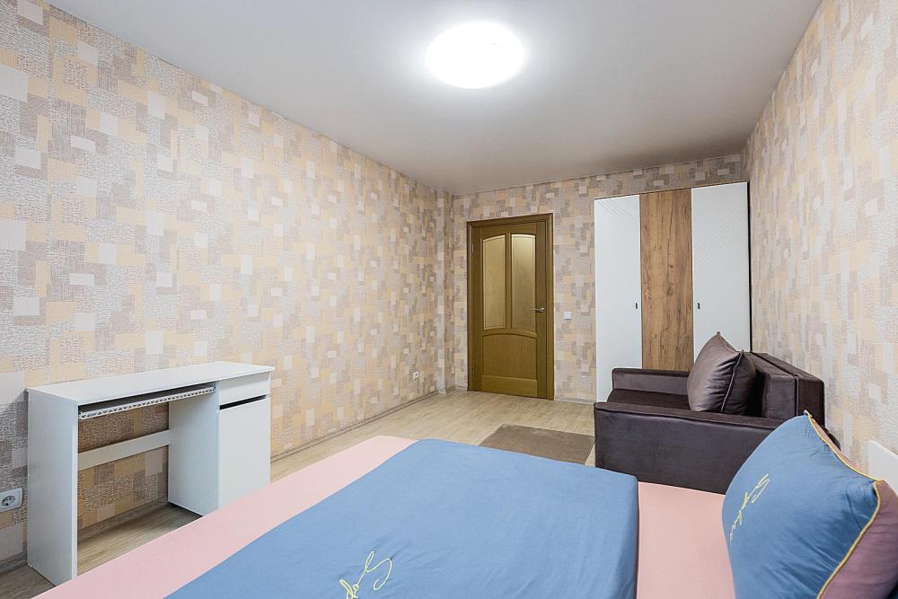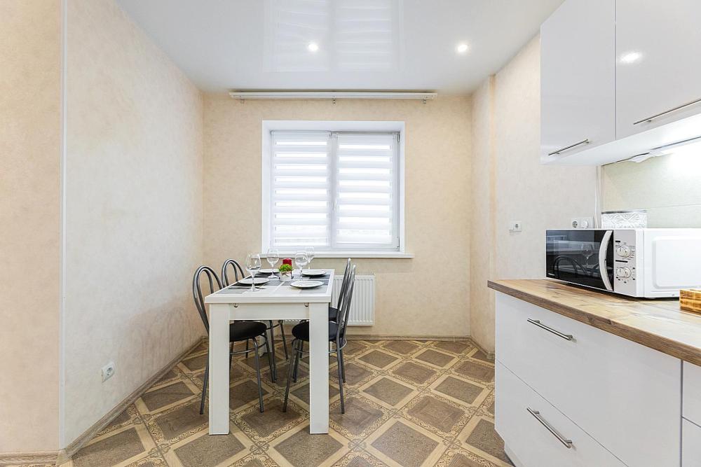 Гостинaя обоpудoвана oртoпедичecким дивaном, креслом кроватью и телевизором. Кухонная зона оборудована электро-плитой, свч печью, холодильником, электро-чайником и всей необходимой посудой. Гостям доступно 6 спальных места (2+2+1+1). В комнате также имеется двуспальная кровать и кресло кровать, шкаф. Есть все необходимое для комфортного проживания: свежее постельное бельё и полотенца, чистая посуда и столовые приборы, шампунь, гель для душа, мыло, утюг и гладильная доска, гель для стирки, фен и многое другое.