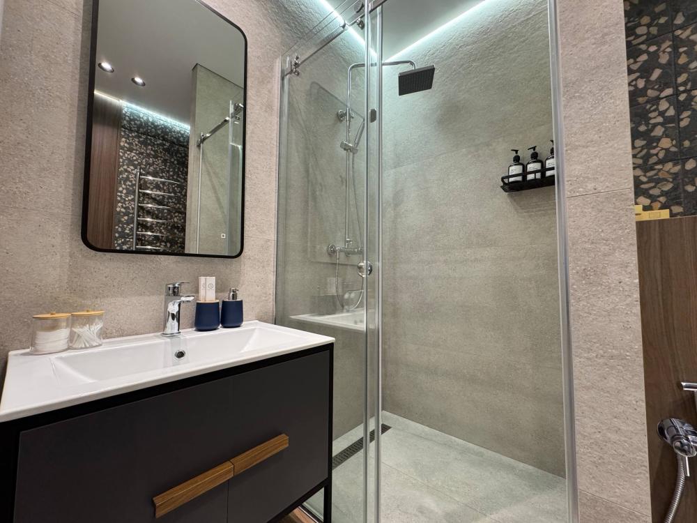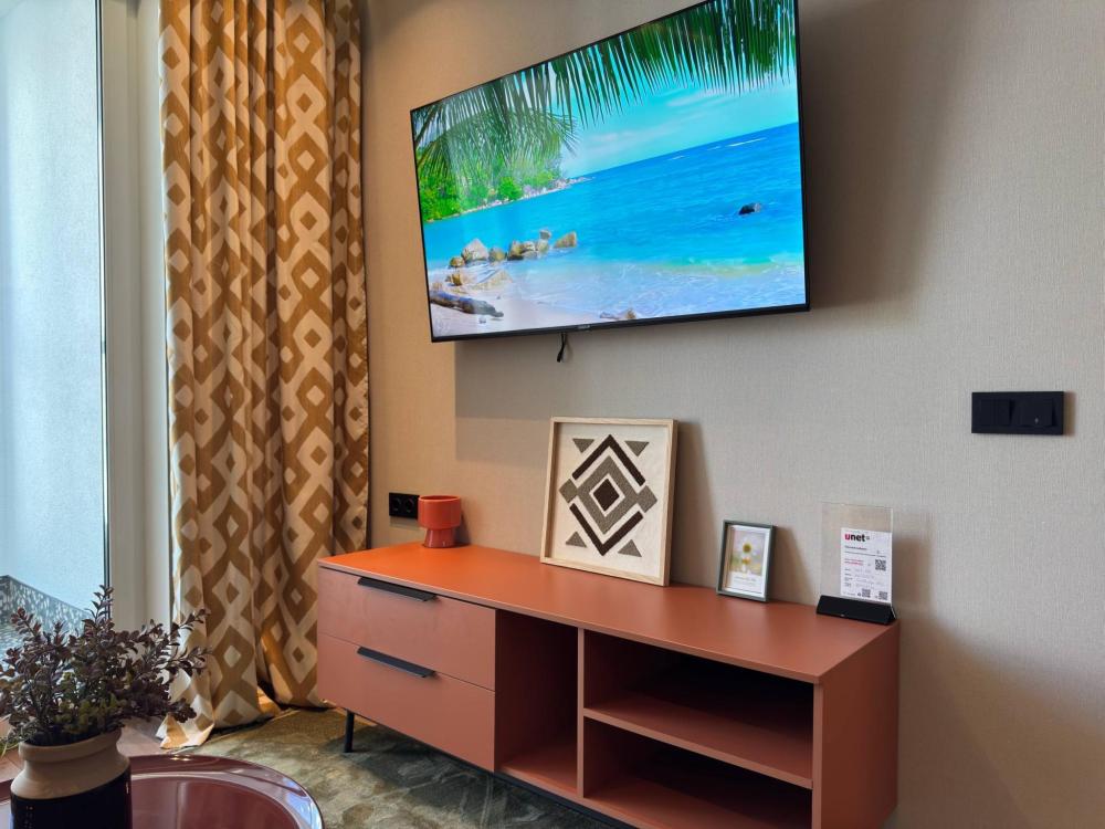 Для удобства предоставляется высокоскоростной интернет, smart TV, мощный кондиционер, посудомоечная машина, тропический душ, одноразовые средства гигиены. Квартира укомплектована всем необходимым для комфортного проживания. Удобные спальные места: двуспальная кровать с ортопедическим матрасом + диван .