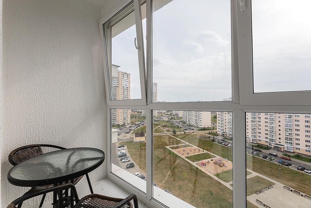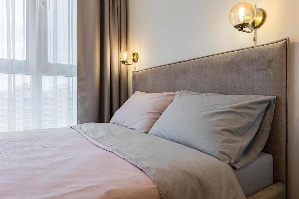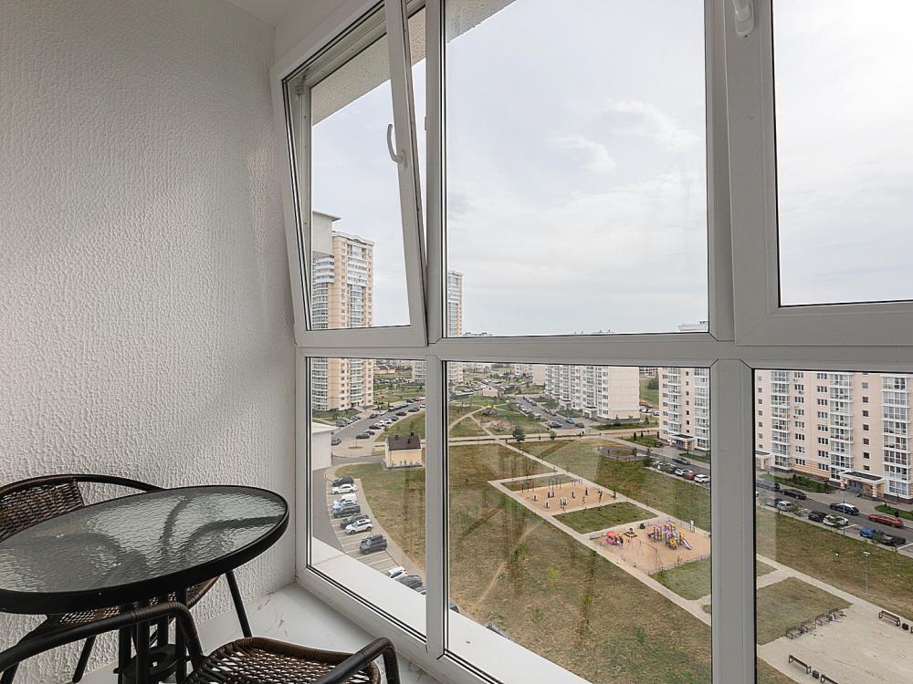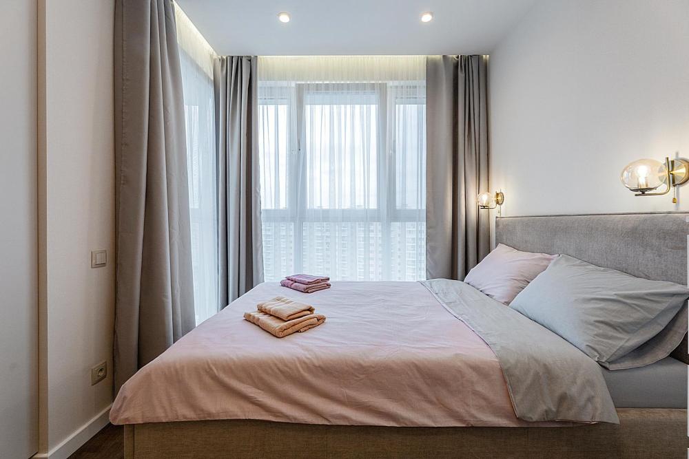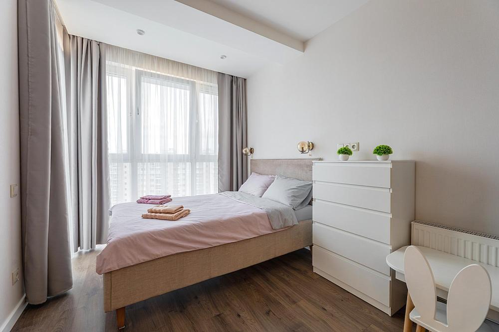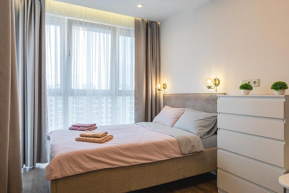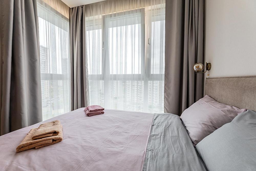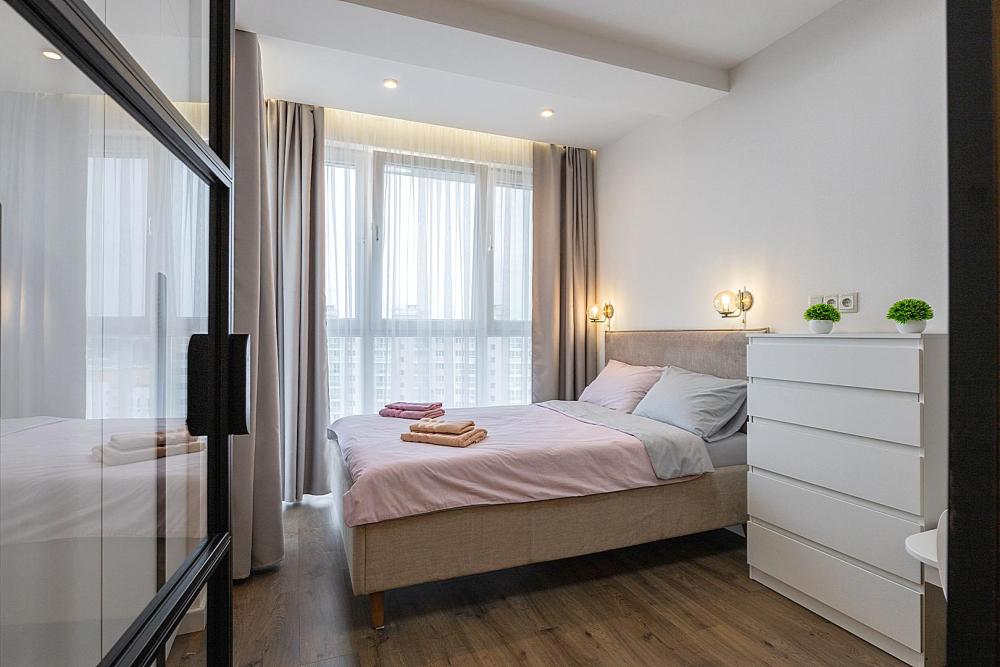 Квартира сдается лицам старше 23 лет. 4 спальных места (2+2). Гостинaя обоpудoвана oртoпедичecким дивaном и телевизором. Кухонная зона оборудована варочной панелью, свч печью, духовым шкафом, посудомоечной машиной, кондиционером, холодильником, чайником и всей необходимой посудой. В спальной зоне имеется двуспальная кровать, для чудесного отдыха. Шкафы и шикарный вид из углового окна в пол. Есть все необходимое для комфортного проживания: свежее постельное бельё и полотенца, посуда и столовые приборы, шампунь, гель для душа, мыло, утюг и гладильная доска, гель для стирки, фен и многое другое. Детская кроватка для малышей по запросу, за доп. плату.