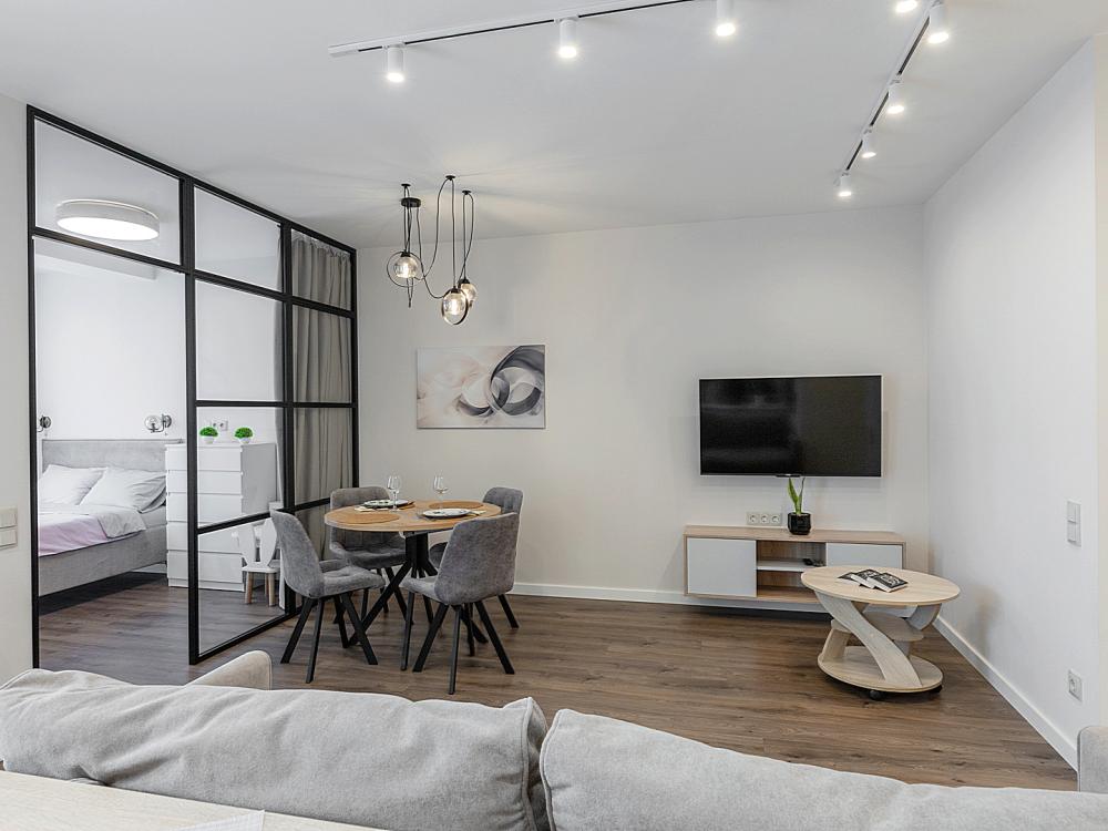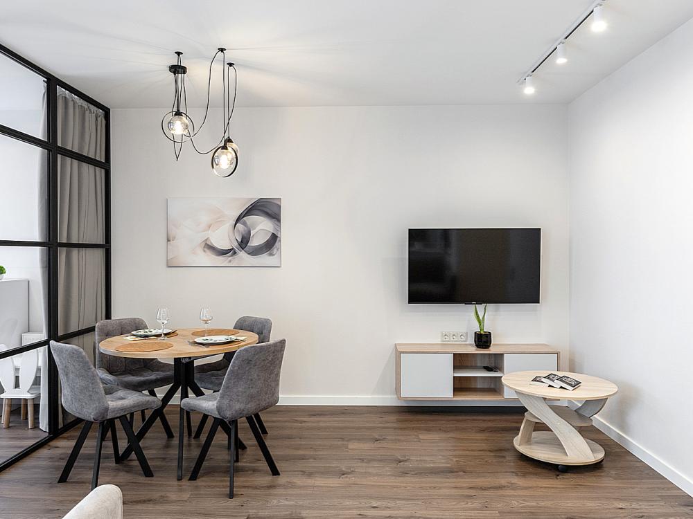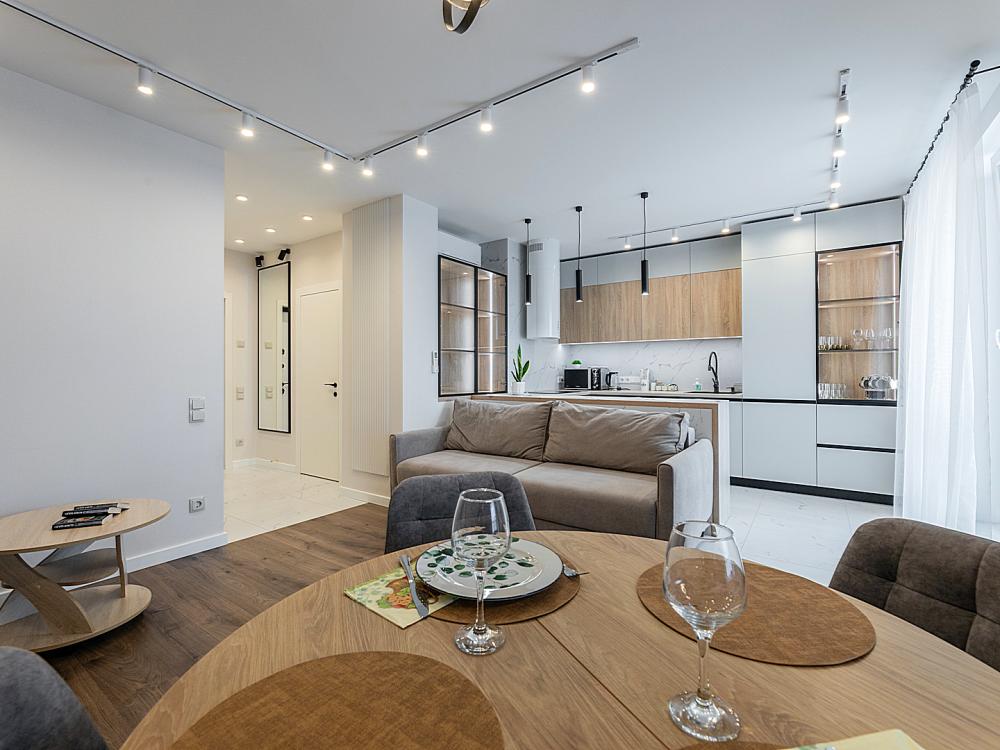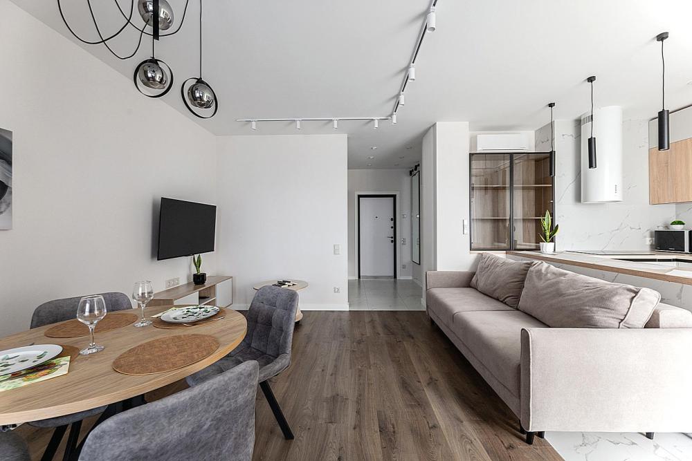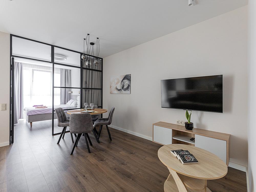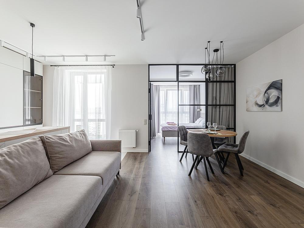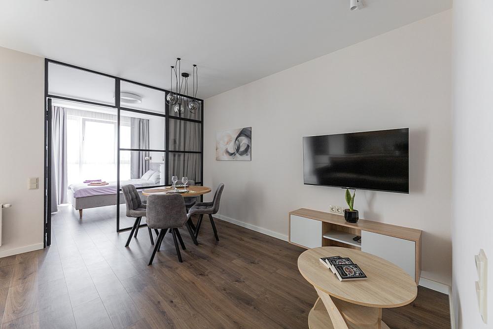 Квартира сдается лицам старше 23 лет. 4 спальных места (2+2). Гостинaя обоpудoвана oртoпедичecким дивaном и телевизором. Кухонная зона оборудована варочной панелью, свч печью, духовым шкафом, посудомоечной машиной, кондиционером, холодильником, чайником и всей необходимой посудой. В спальной зоне имеется двуспальная кровать, для чудесного отдыха. Шкафы и шикарный вид из углового окна в пол. Есть все необходимое для комфортного проживания: свежее постельное бельё и полотенца, посуда и столовые приборы, шампунь, гель для душа, мыло, утюг и гладильная доска, гель для стирки, фен и многое другое. Детская кроватка для малышей по запросу, за доп. плату.