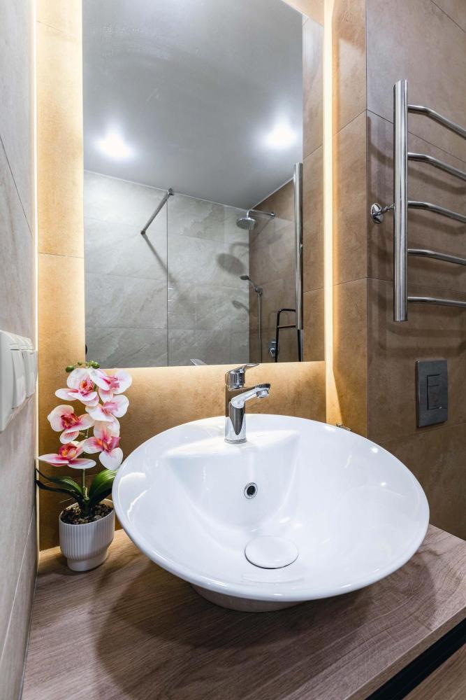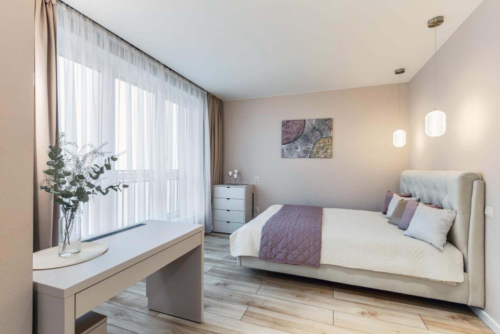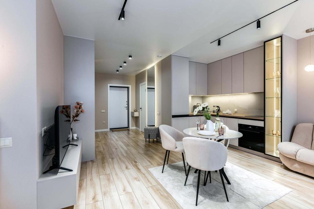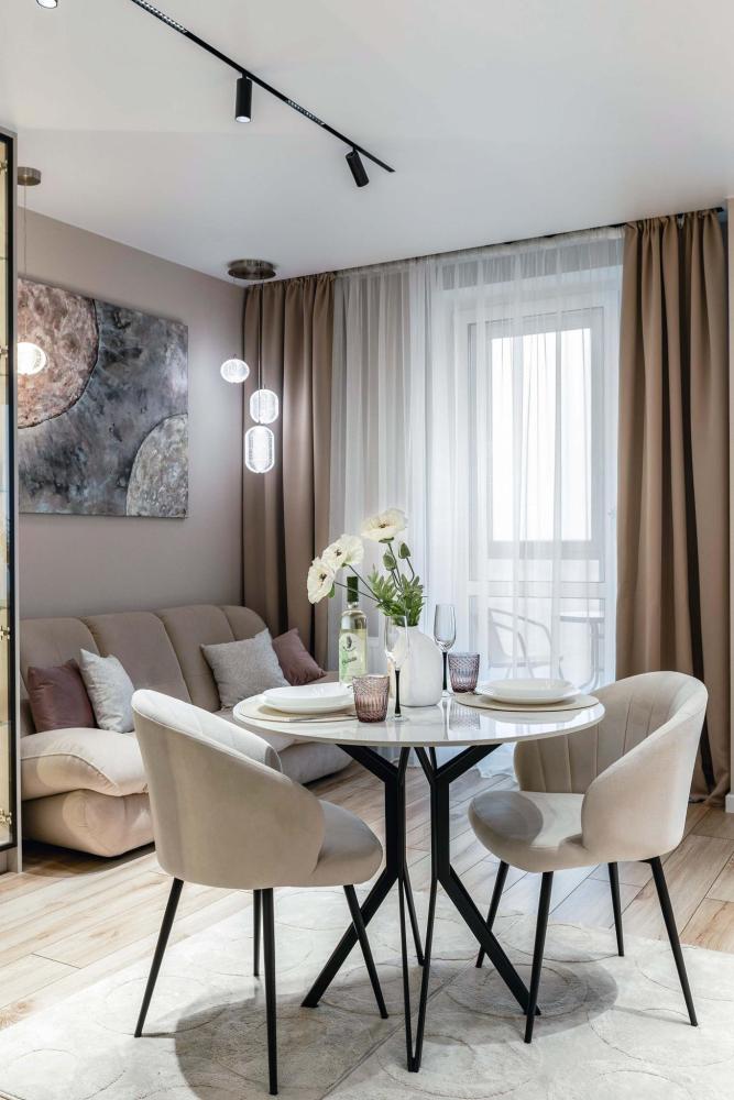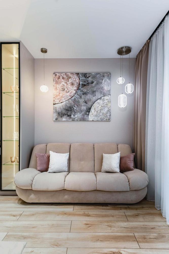 Современный интерьер с полным набором бытовой техники. На кухне имеется вся необходимая техника для приготовления еды: холодильник, плита, микроволновая печь и электрический чайник. В ванной комнате есть фен и полотенца для удобства гостей. Так же в апартаментах есть Wi-Fi, что позволит работать удалённо или даст возможность не приобретать дополнительную сим-карту.