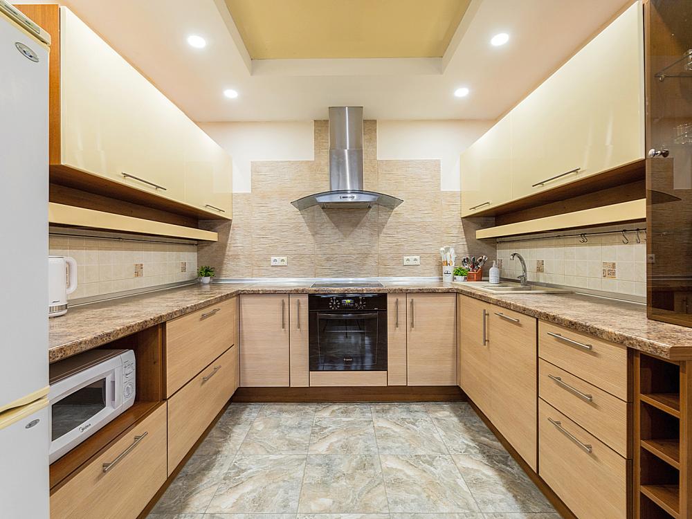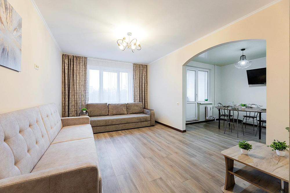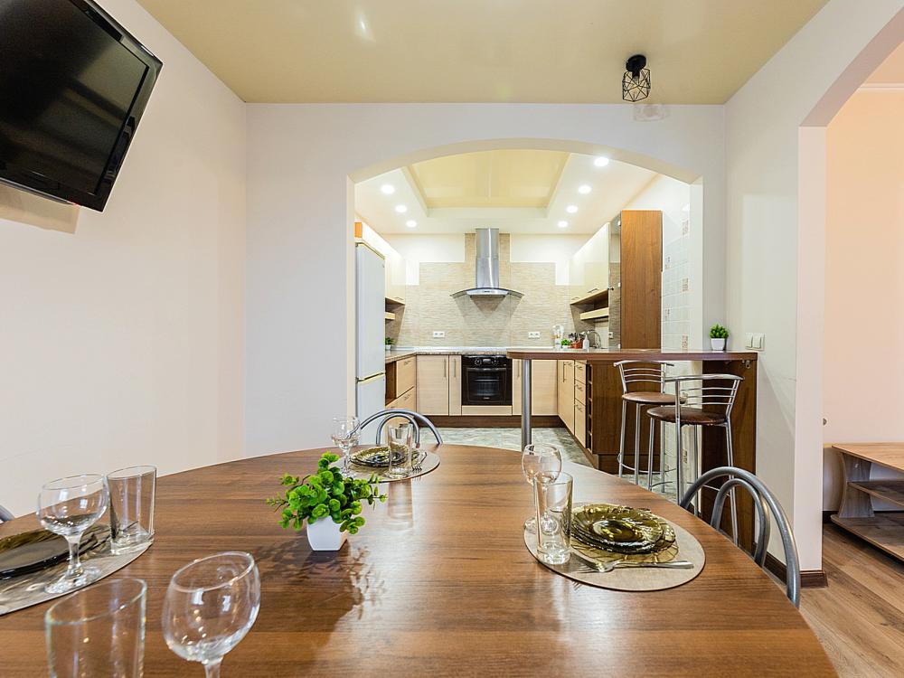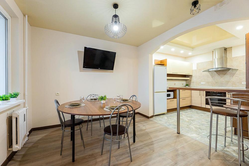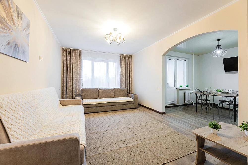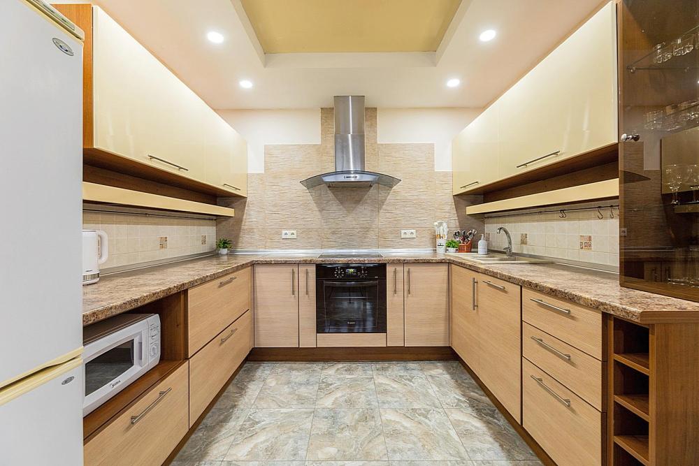 В квартире 9 спальных мест (2+2+2+2+1). Гостинaя обоpудoвана oртoпедичecкими дивaнами и телевизором. Кухонная зона оборудована варочной панелью, посудомоечной машиной, свч печь, духовой шкаф, встроенный холодильник и вся необходимая посуда. В комнатах также имеются двуспальные кровати. Есть все необходимое для комфортного проживания: свежее постельное бельё и полотенца, чистая посуда и столовые приборы, шампунь, гель для душа, мыло, утюг и гладильная доска, гель для стирки, фен и многое другое.