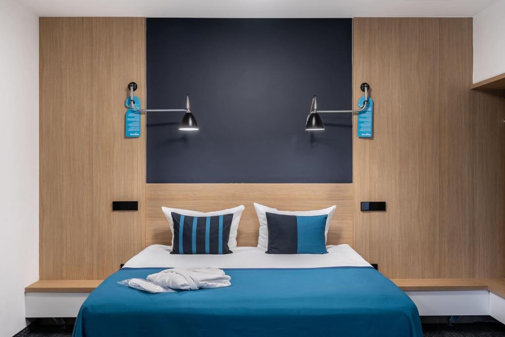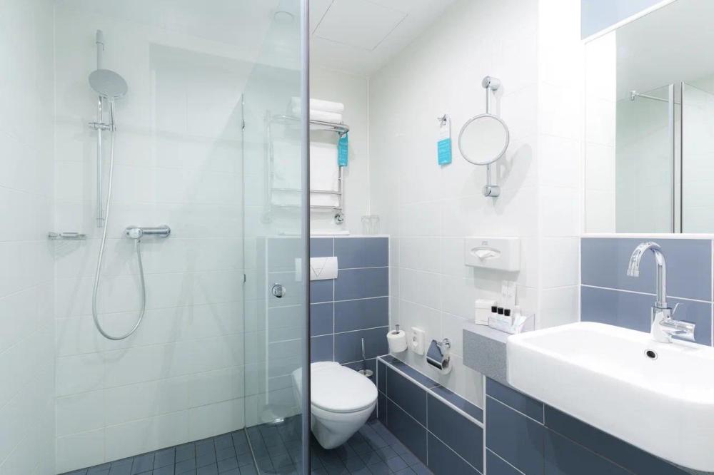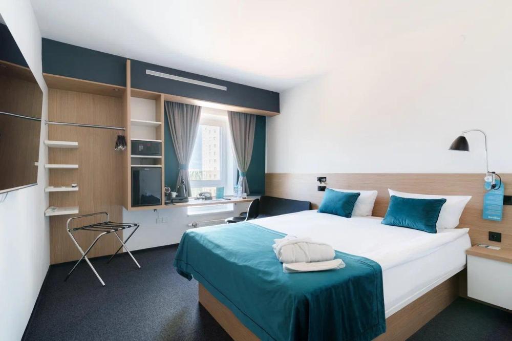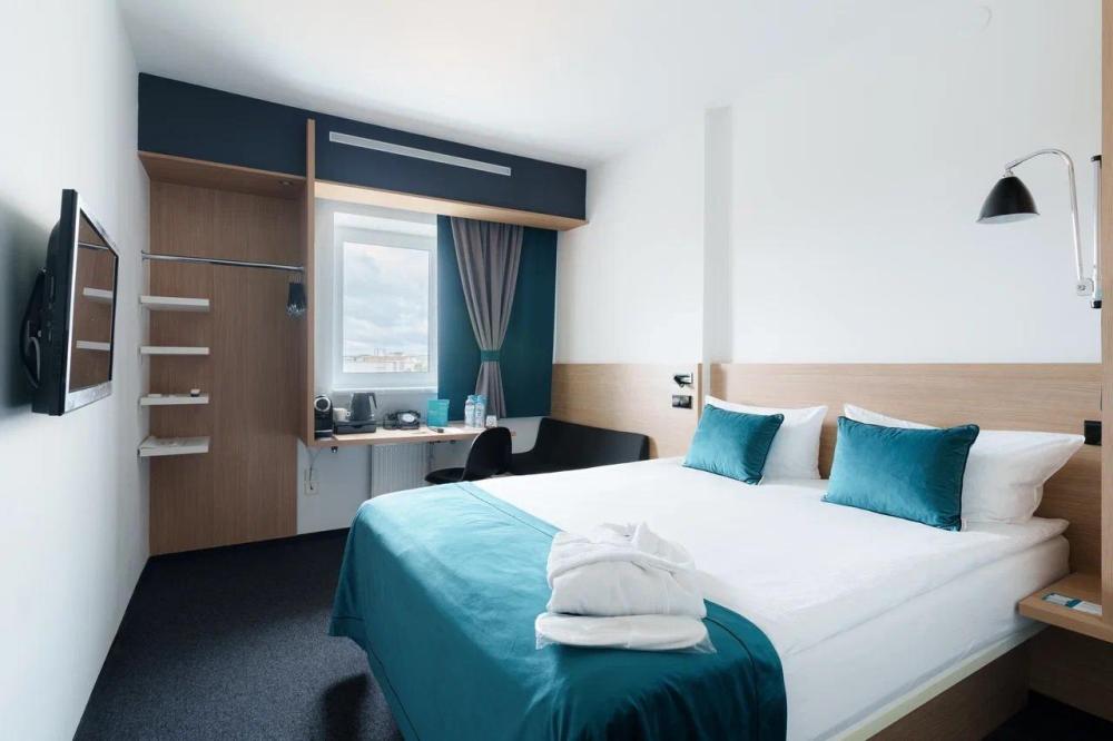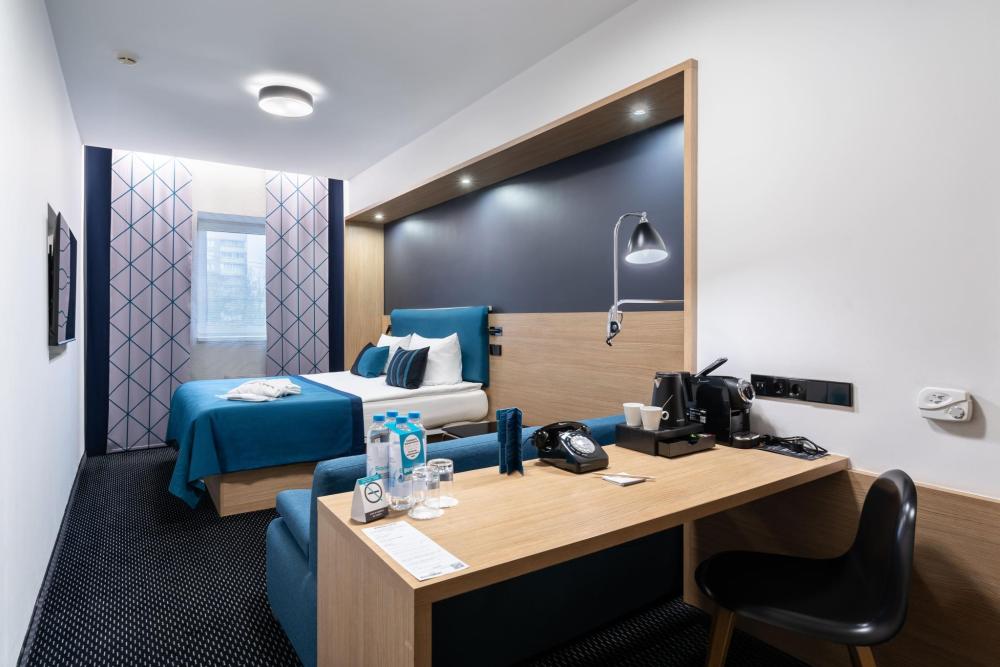 Функциональный двухместный номер категории TWIN площадью 14 кв. м. Номер оснащен двумя раздельными кроватями с ортопедическим матрасом, секцией для хранения вещей и удобной рабочей зоной. Для гостей в номере предоставлен набор полотенец, фен, набор эксклюзивной чешской косметики. Во всех номерах ковровое напольное покрытие. Идеальный выбор для путешествий с друзьями или семьей. Светлая ванная комната оборудована душевой кабиной и высококлассной сантехникой GROHE.