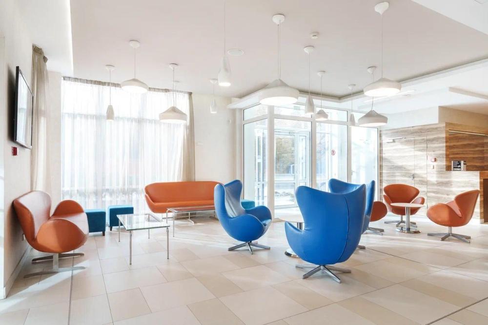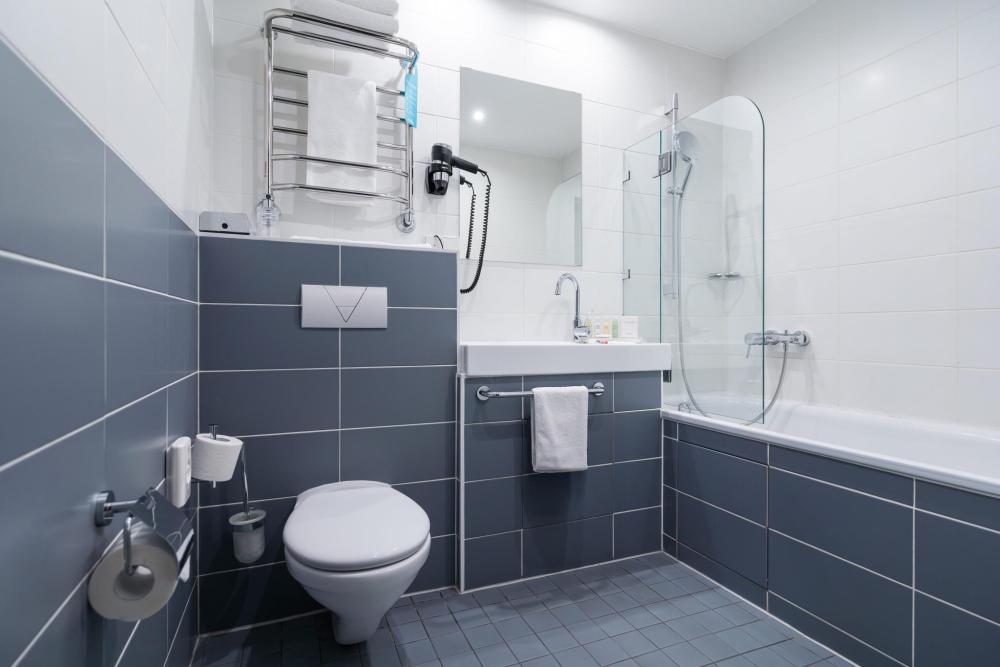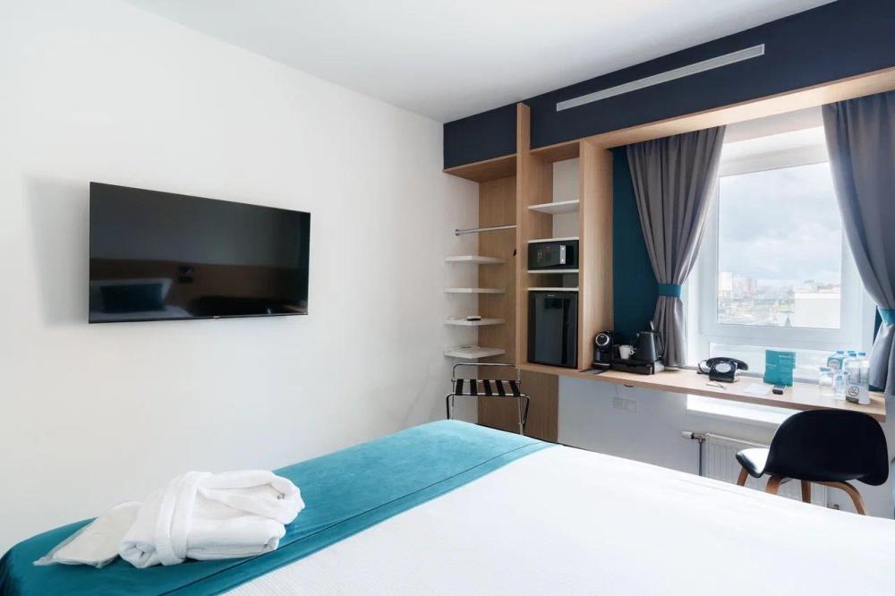 Просторный номер категории COMFORT площадью 16 кв. м. оснащен дополнительными удобствами, такими как подставка для багажа, косметическое зеркало с эффектом увеличения и капсульная кофемашина. Телевизор с Smart TV диагональю 42" позволит насладиться любимыми фильмами в уютной обстановке. Для гостей в номере предоставлен набор полотенец, фен, махровый халат и тапочки, эксклюзивная косметика. Во всех номерах ковровое напольное покрытие. Светлая ванная комната оборудована душевой кабиной и высококлассной сантехникой GROHE.