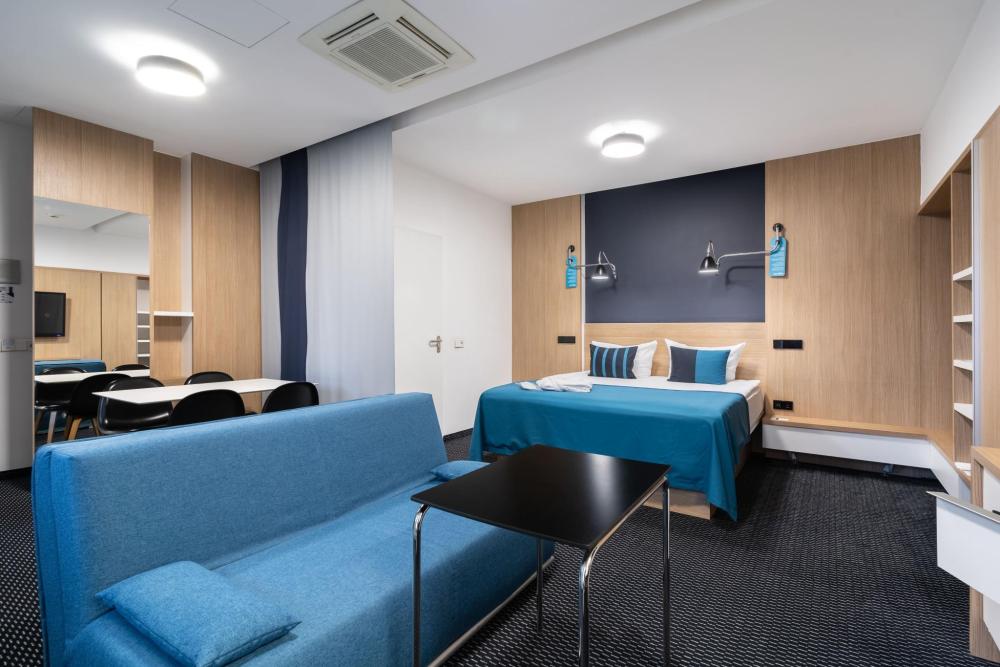 Просторный номер категории STUDIO площадью 22 кв. м., подходит для комфортного размещения до трех гостей. Номер оснащен комфортной двуспальной кроватью King Size (180х200), большим раскладным диваном и журнальным столиком для комфортного отдыха и продуктивной работы. В номере есть все необходимое для проживания, включая набор для приготовления чая/кофе, капсульную кофемашину, пушистый халат и мягкие тапочки, набор полотенец, фен, эксклюзивную чешскую косметику. Во всех номерах ковровое напольное покрытие. Светлая ванная комната оборудована просторной ванной и высококлассной сантехникой GROHE.