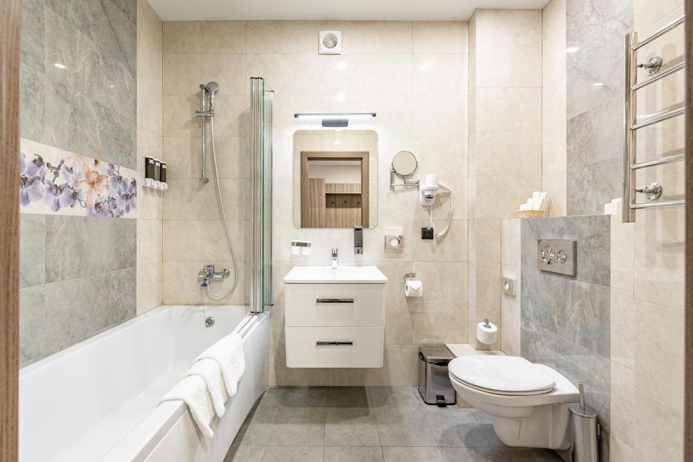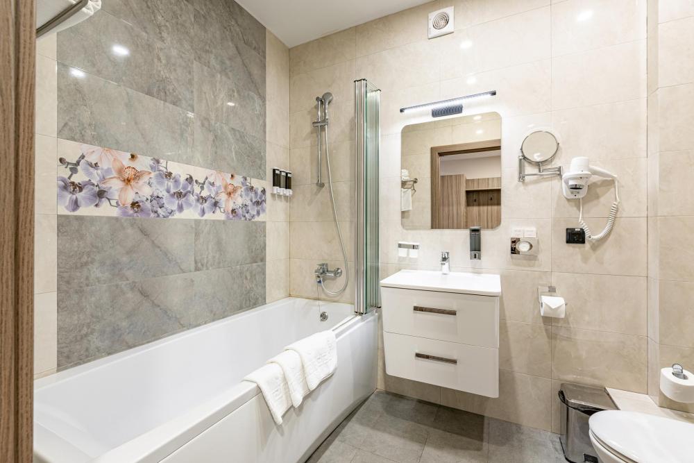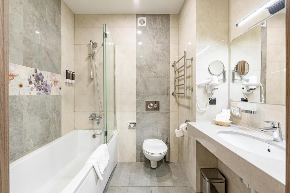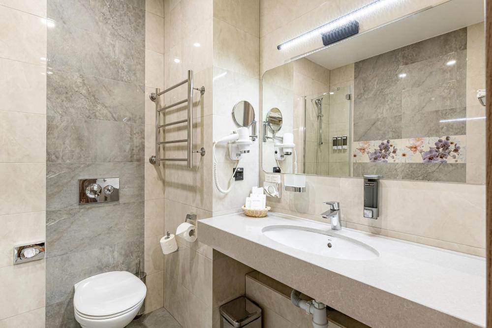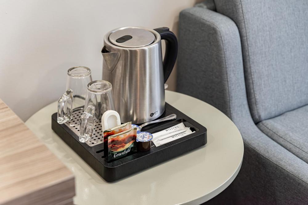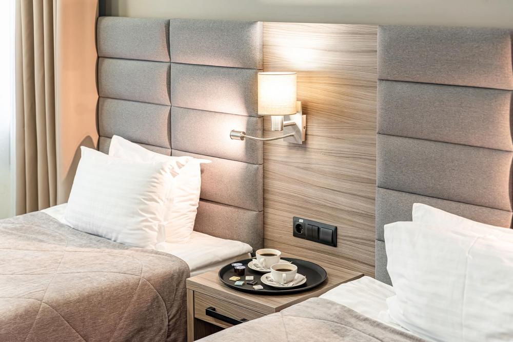 Улучшенный однокомнатный номер с двумя раздельными кроватями прекрасно подходит для проживания двух или трёх персон. Оттенки интерьера располагают к расслаблению и отдыху. Ортопедический матрас 110х200 см и мягкое сатиновое бельё обеспечат приятный сон. В просторных номерах этой категории гости получают дополнительный комфорт: порционные кофе и сливки, бутилированная вода пополняется ежедневно, мягкие халаты, тапочки, зубной, бритвенный и косметический наборы. Номера дополнительно оборудованы гладильной доской, утюгом, сейфом и раскладывающейся диван-кроватью. В зависимости от своих предпочтений гости могут зарезервировать номер с видом из окна на город либо на тихий внутренний дворик Отеля (при наличии соответствующих номеров). Возможно размещение третьего гостя за дополнительную оплату на диван-кровати, матрас размером 90х185 см.