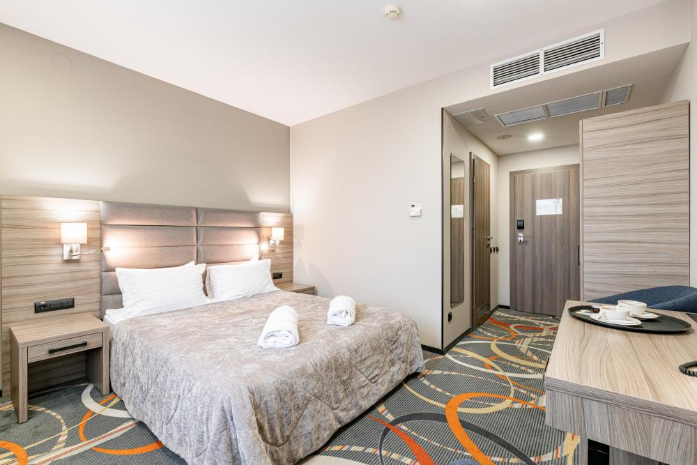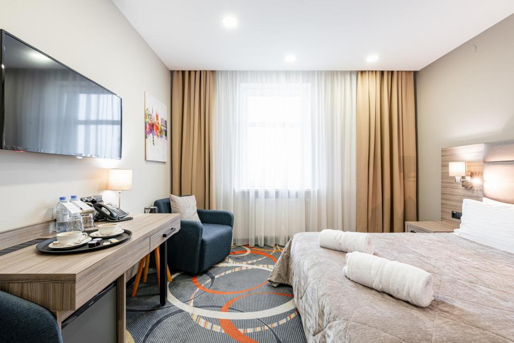 Улучшенный однокомнатный номер с двуспальной кроватью подходит для проживания одного или двух гостей. Оттенки интерьера располагают к расслаблению и отдыху. Ортопедический матрас 160х200 см и мягкое сатиновое бельё обеспечат приятный сон. В номерах этой категории гости получают дополнительный комфорт: порционные кофе и сливки, бутилированная вода пополняется ежедневно, мягкие халаты, тапочки, зубной, бритвенный и косметический наборы. Номера дополнительно оборудованы гладильной доской, утюгом и сейфом. В зависимости от своих предпочтений гости могут зарезервировать номер с видом из окна на город либо на тихий внутренний дворик Отеля (при наличии соответствующих номеров).