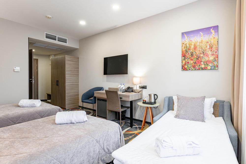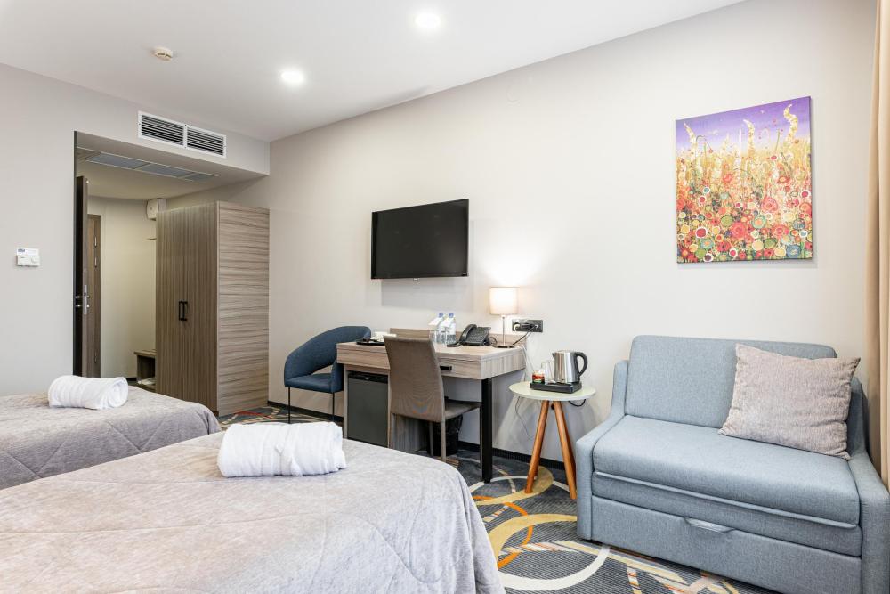 Уютный однокомнатный номер с двумя раздельными кроватями размером single-size с ортопедическим матрасом и сатиновым бельем. Номер выполнен в спокойных природных тонах, способствующих отдыху и расслаблению, и оснащен всем необходимым для комфортного проживания. В зависимости от своих предпочтений, гости могут выбрать номер с ванной или душем, с видом на город либо с окнами, выходящими во внутренний дворик отеля.