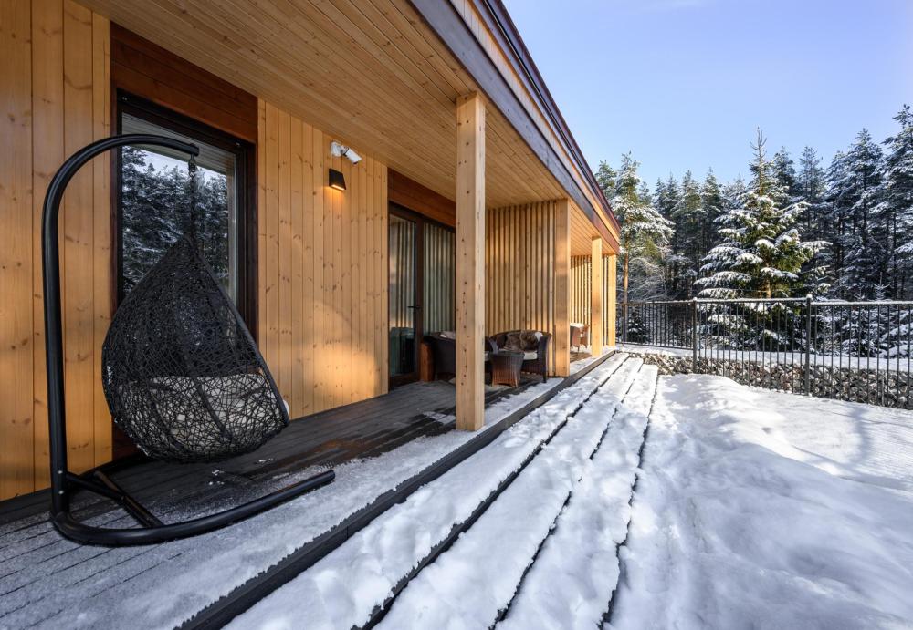 Коттеджи оснащены современной техникой и удобной мебелью для вашего незабываемого отдыха. Из окна открывается восхитительный вид на заснеженный хвойный лес и реку. Две спальни с двумя односпальными кроватями (соединяются между собой), оборудованы отдельными санузлами, ванной и душевой кабиной. Коттедж оборудован современной системой тёплый пол (гостиная, прихожая). Стиральная машина, гладильная доска, сушилка, утюг по запросу. Кухня: холодильник, электроплита, микроволновая печь, фильтр для воды, посудомоечная машина, набор посуды для приготовления еды, набор посуды для сервировки на 6 персон, стол, стулья, барная стойка, камин. Сейф для хранения ценных вещей, денег, документов. Прихожая: шкаф для хранения одежды, зеркало, тумба. Освещённая терраса: стол, 4 кресла. Кондиционер.