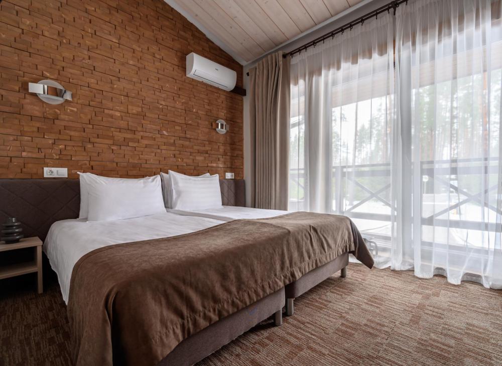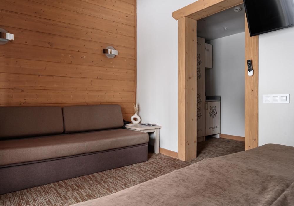 Верный выбор для небольших семей или компаний, желающих комфортно и активно отдохнуть на свежем воздухе, но недалеко от города. В номерах с простым, но элегантным интерьером сочетаются традиционный альпийский дизайн и домашний уют. Конечно же, в отеле есть помещение для хранения лыж, которым может воспользоваться каждый постоялец абсолютно бесплатно. Переступив порог отеля, вы сразу забудете обо всех проблемах. Спальня с одной двуспальной кроватью или двумя односпальными (по желанию). Диван (может быть дополнительным полноценным спальным местом для 3 гостя). Телевизор (интерактивное ТВ), фен, мини-холодильник, чайная станция (электрический чайник, чайный набор). Сейф для хранения ценных вещей, денег, документов. Шкаф для хранения одежды, зеркало, тумбы журнальный стол. Освещённая терраса: стол, кресла. Мини-бар.