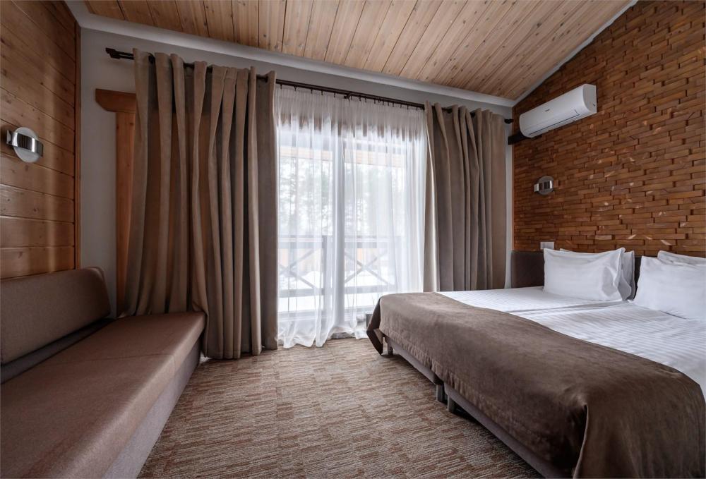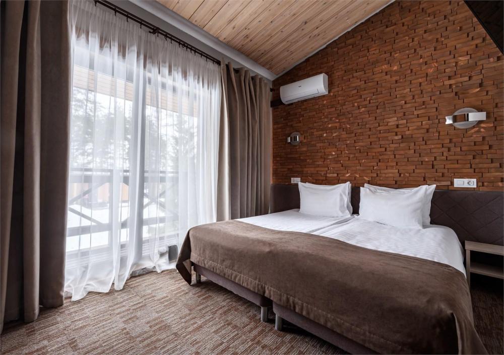 Верный выбор для небольших семей или компаний, желающих комфортно и активно отдохнуть на свежем воздухе, но недалеко от города. В номерах с простым, но элегантным интерьером сочетаются традиционный альпийский дизайн и домашний уют. Конечно же, в отеле есть помещение для хранения лыж, которым может воспользоваться каждый постоялец абсолютно бесплатно. Переступив порог отеля, вы сразу забудете обо всех проблемах. Спальня с одной двуспальной кроватью или двумя односпальными (по желанию). Диван (может быть дополнительным полноценным спальным местом для 3 гостя). Телевизор (интерактивное ТВ), фен, мини-холодильник, чайная станция (электрический чайник, чайный набор). Сейф для хранения ценных вещей, денег, документов. Шкаф для хранения одежды, зеркало, тумбы журнальный стол. Освещённая терраса: стол, кресла.