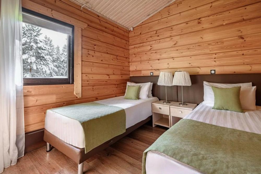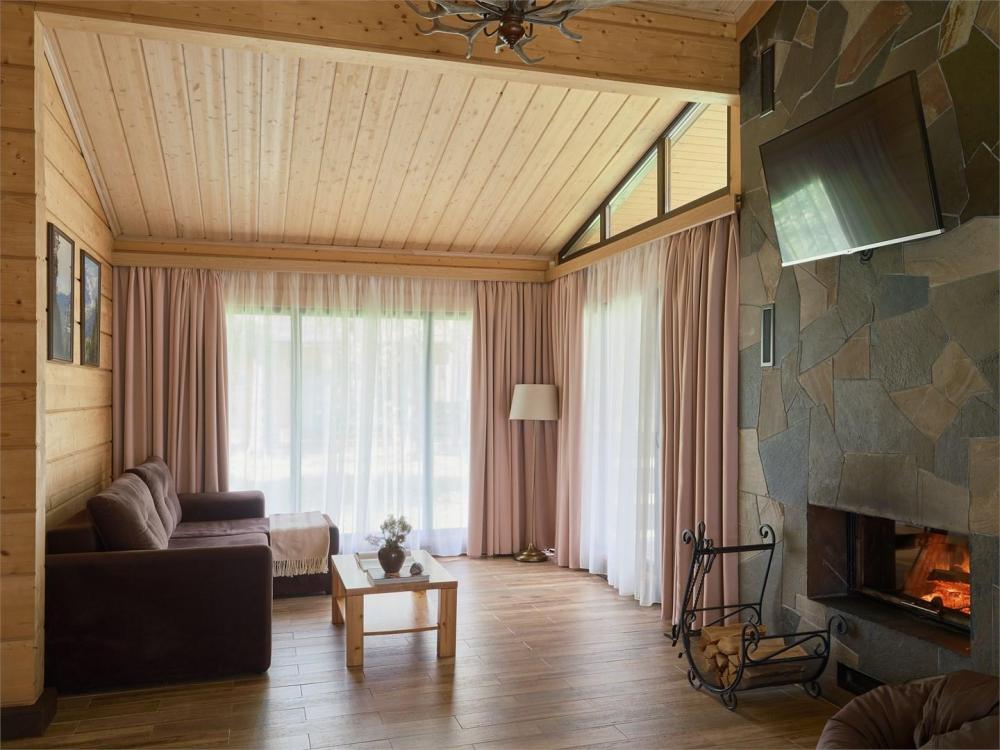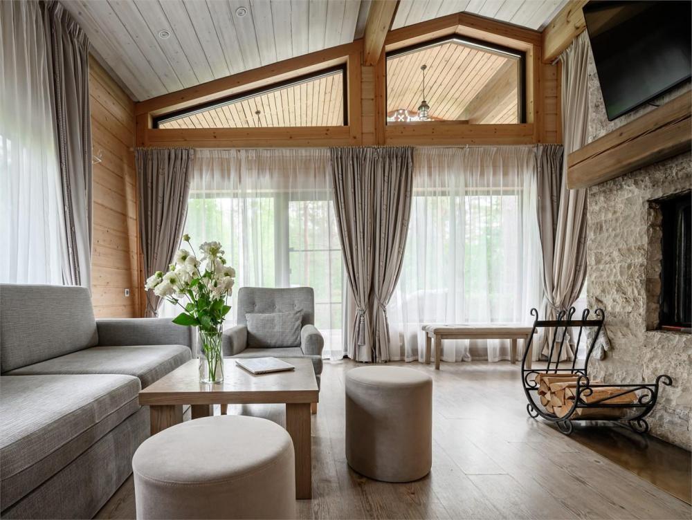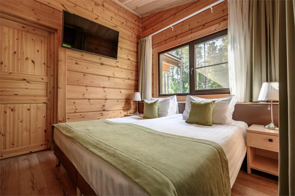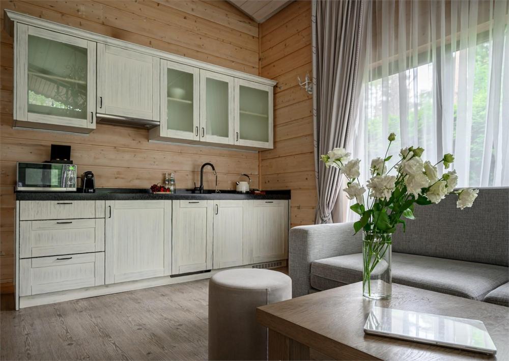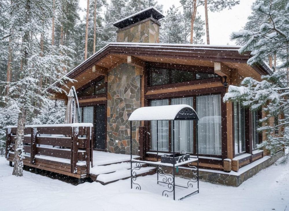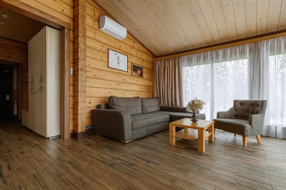 Коттеджи оснащены современной техникой и удобной мебелью для вашего незабываемого отдыха. Из окна открывается восхитительный вид на заснеженный хвойный лес и реку. Две спальни с двумя односпальными кроватями (соединяются между собой), оборудованы отдельными санузлами, ванной и душевой кабиной. Коттедж оборудован современной системой тёплый пол (гостиная, прихожая). Стиральная машина, гладильная доска, сушилка, утюг по запросу. Кухня: холодильник, электроплита, микроволновая печь, фильтр для воды, посудомоечная машина, набор посуды для приготовления еды, набор посуды для сервировки на 6 персон, стол, стулья, барная стойка, камин. Сейф для хранения ценных вещей, денег, документов. Прихожая: шкаф для хранения одежды, зеркало, тумба. Освещённая терраса: стол, 4 кресла. Кондиционер.