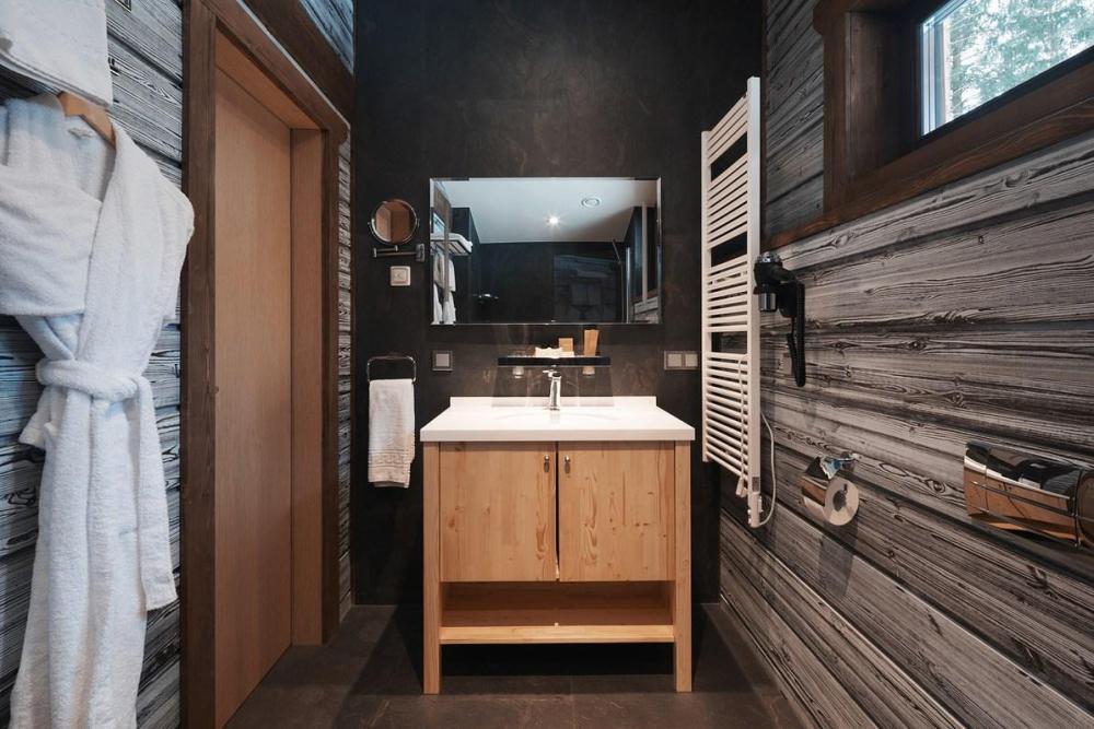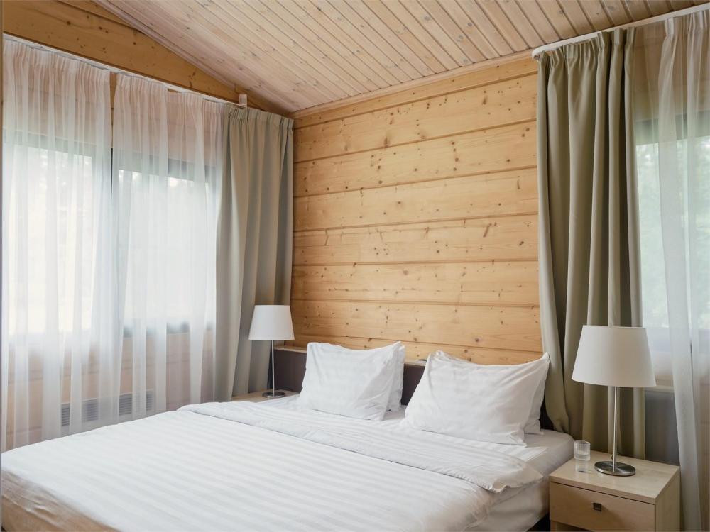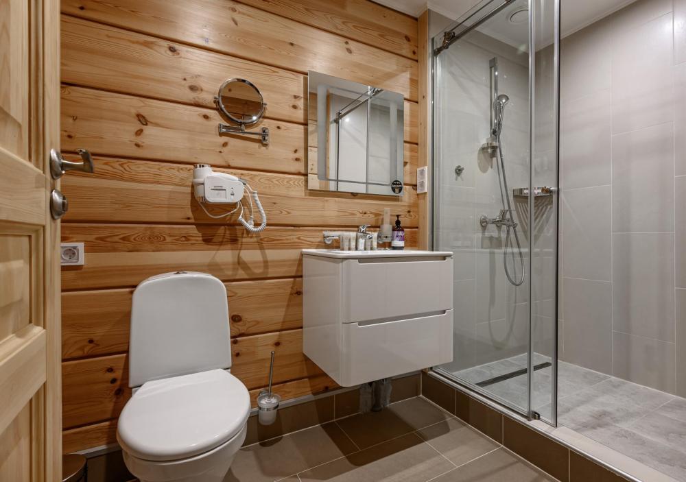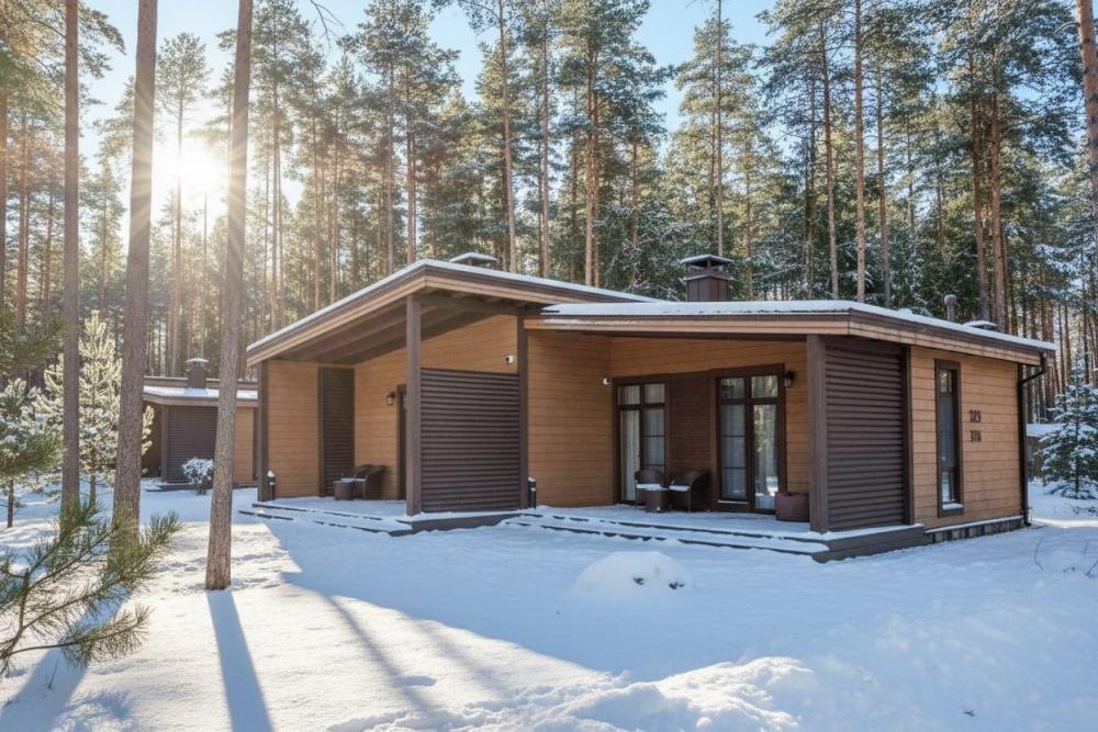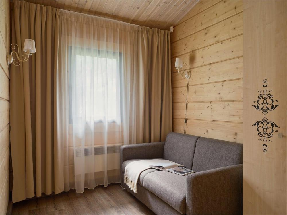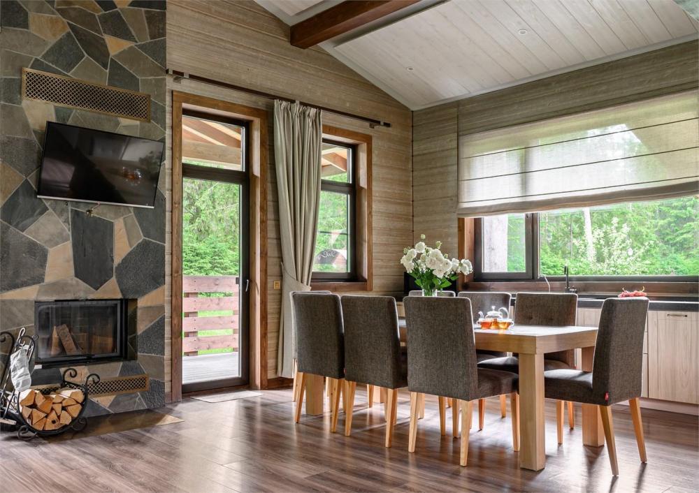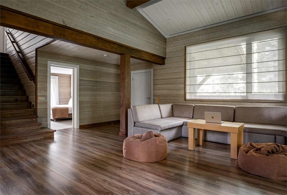Коттеджи оснащены современной техникой и удобной мебелью для вашего незабываемого отдыха. Из окна открывается восхитительный вид на заснеженный хвойный лес и реку. Две спальни с двумя односпальными кроватями (соединяются между собой), оборудованы отдельными санузлами, ванной и душевой кабиной. Коттедж оборудован современной системой тёплый пол (гостиная, прихожая). Стиральная машина, гладильная доска, сушилка, утюг по запросу. Кухня: холодильник, электроплита, микроволновая печь, фильтр для воды, посудомоечная машина, набор посуды для приготовления еды, набор посуды для сервировки на 6 персон, стол, стулья, барная стойка, камин. Сейф для хранения ценных вещей, денег, документов. Прихожая: шкаф для хранения одежды, зеркало, тумба. Освещённая терраса: стол, 4 кресла. Кондиционер.