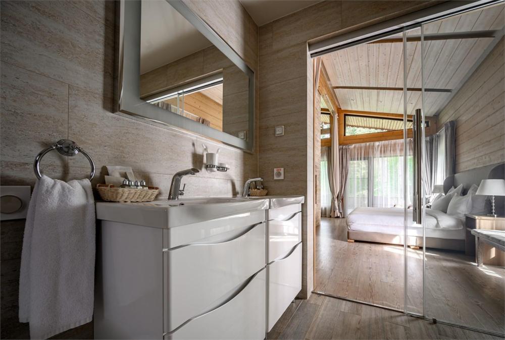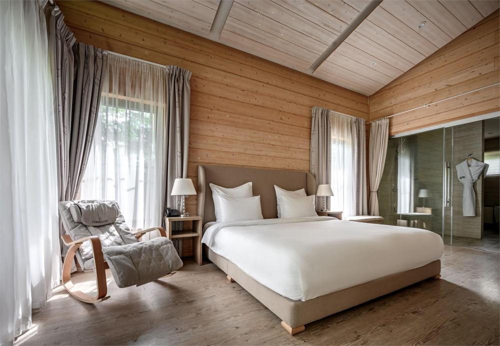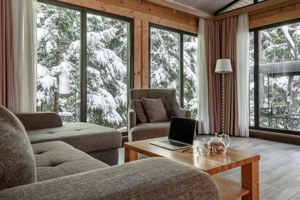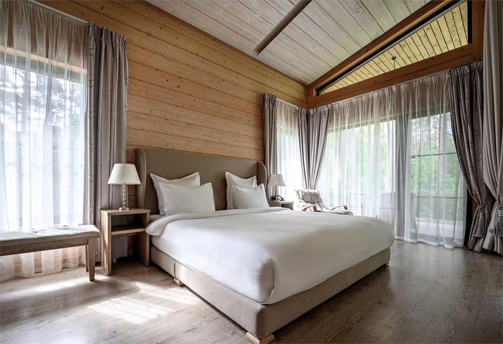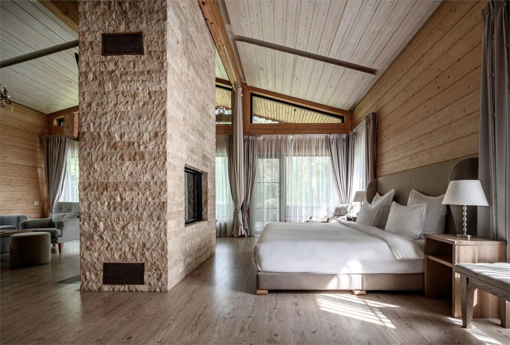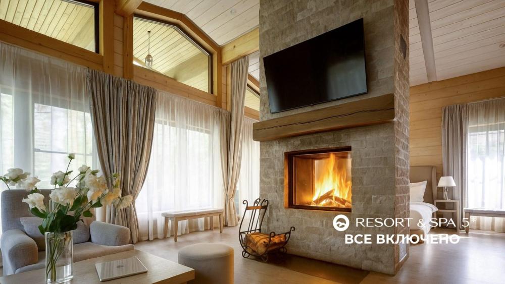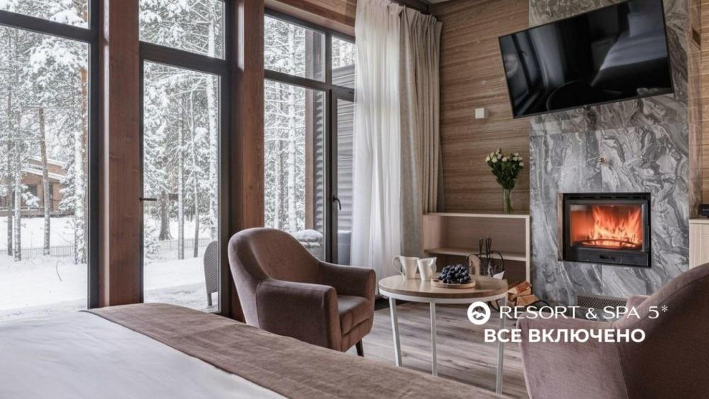 Категория размещения «Делюкс+» — выбор для пар, которые предпочитают роскошный отдых в просторном номере с камином и видовой террасой. Отдельно стоящее здание «Делюксов+» располагается в одном из самых уединённых и живописных мест курорта. Из каждого номера открывается живописный вид на сосновый лес и тихую реку с зелёными луговыми берегами. Совсем недалеко располагается уникальный ресторан высокой кухни «В Чаще». Сами номера — уютные и просторные, выполнены в лаконичном скандинавском стиле. Спальня с большой двуспальной кроватью и подсветкой. Зона отдыха с камином, большим телевизором (интерактивное ТВ), столиком и креслами. Сейф для хранения ценных вещей, денег, документов. Прихожая с 2 вместительными шкафами для верхней одежды, чемодана и остальных вещей. Фен, мини-холодильник, чайная станция (электрический чайник, чайный набор, кофемашина, набор капсул). Освещённая терраса с уличной мебелью (стол, кресла, диван). Обращаем ваше внимание, что в данной категории размещение с питомцами невозможно.