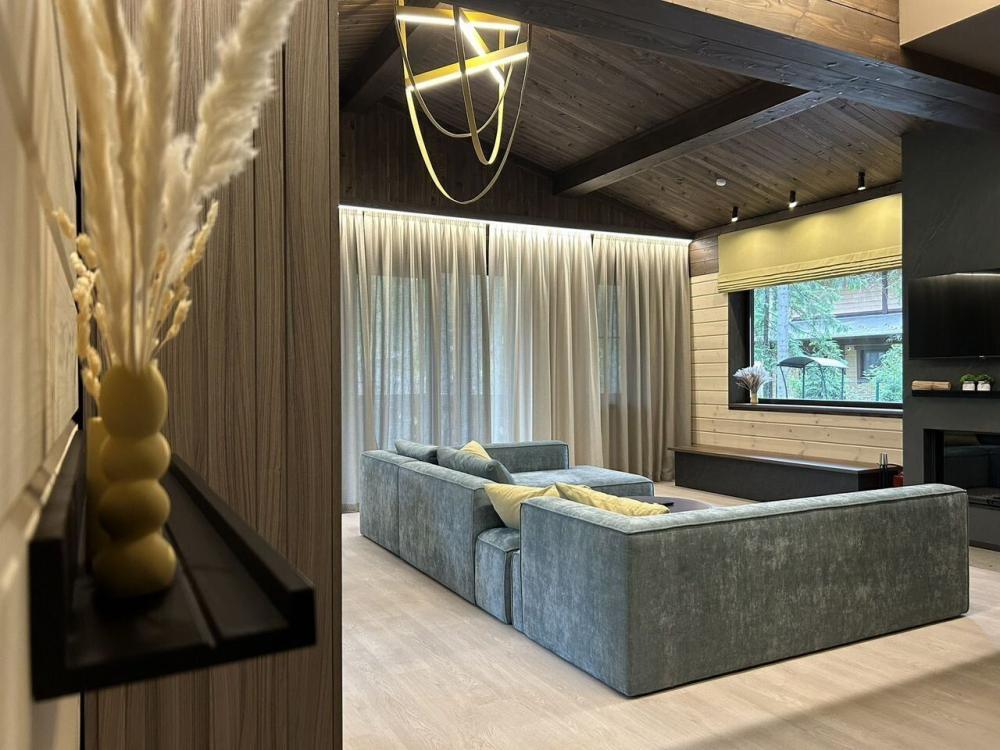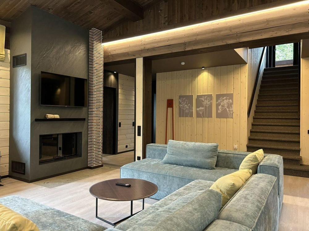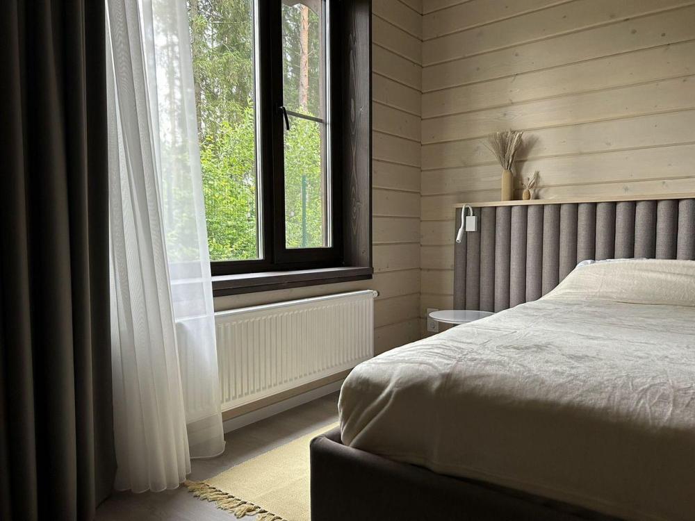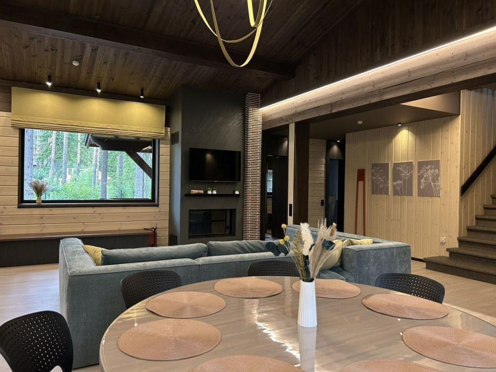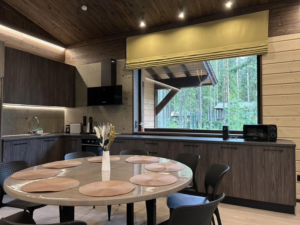 В доме есть все необходимое для комфортного отдыха. На первом этаже кухня-гостиная с выходом на террасу, камин, сауна, две спальни, санузел и постирочная. На втором - две спальни с выходом в личные ванные комнаты и балкон. В обеденной зоне стол, стулья и посуда на 8 персон. На кухне - посудомоечная машина, духовка, чайник, микроволновка, холодильник и плита. В зоне отдыха - удобный диван с подушками и телевизор (смарт-тв). В каждой спальне - кровати, прикроватные тумбы, шкафы. В доме 4 спальни: две - с большой двуспальной кроватью, две - с двумя односпальными кроватями (можно соединить в одну).