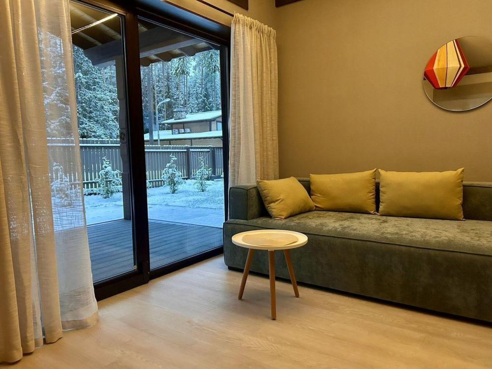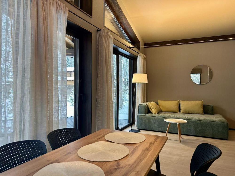 В доме есть все необходимое для комфортного отдыха. Уютная кухня-гостиная с выходом на террасу, две спальни, санузел, прихожая и хозяйственный уголок. На улице зона для мангала и уличная мебель. В гостиной диван (дополнительное спальное место) и телевизор (Smаrt-ТV), торшер. На кухне стол и стулья на 5 персон, посудомоечная машина, чайник, микроволновка, столовые приборы, тарелки, чашки, сковородки и кастрюли, кухонная утварь. В одной комнате двуспальная кровать, в другой - две односпальные. В каждой комнате шкаф для одежды, прикроватные тумбы и светильники. В санузле душевая кабина, раковина, туалет и зеркало с полками. Одно парковочное место. На территории расположено несколько коттеджей с общей парковкой.