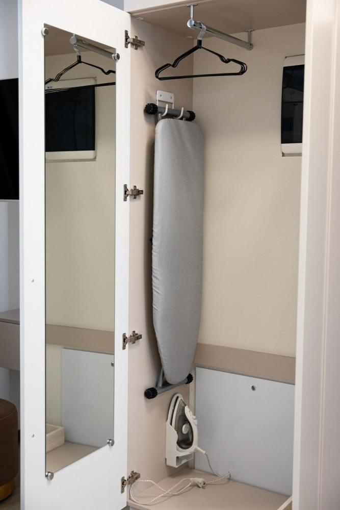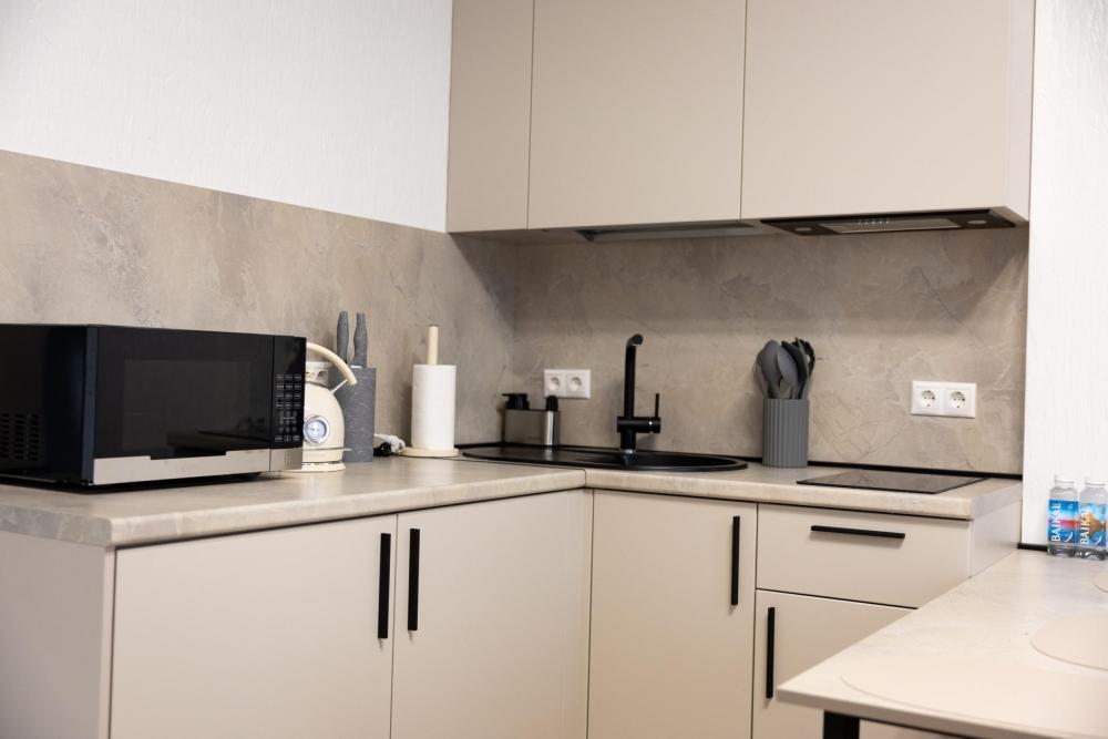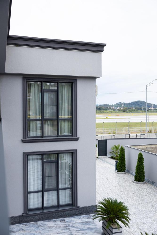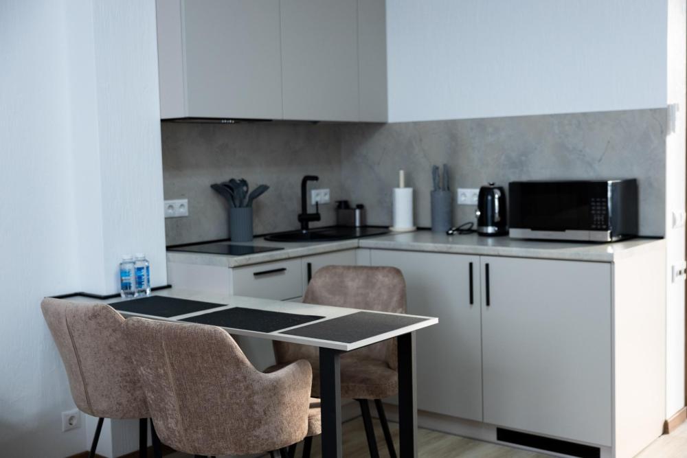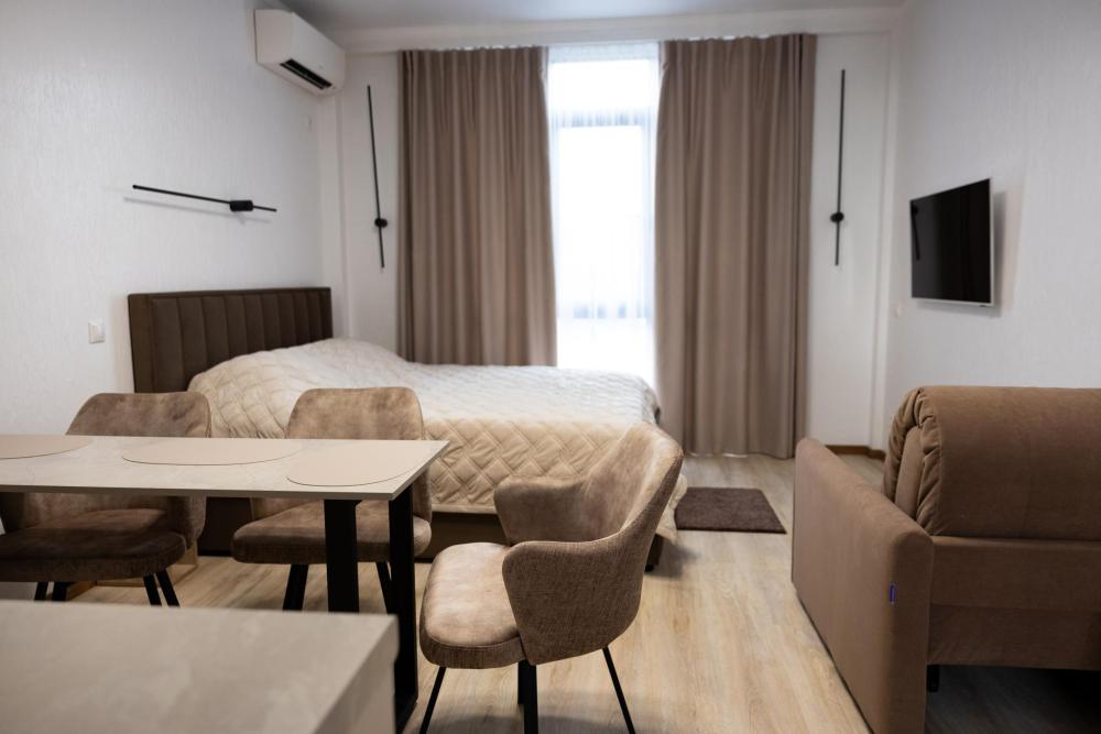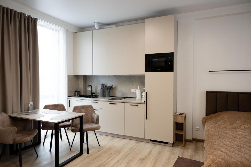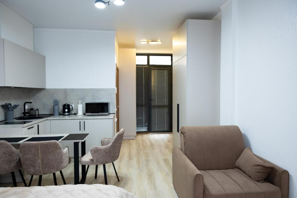 Апартамент полностью автономен, при желании можно ни с кем не пересекаться. Помимо отдельного входа, в апартаменте имеется оборудованная кухонная зона (холодильник, плита, микроволновая печь, электрочайник, посуда), в спальной зоне расположена двухместная кровать, диван, телевизор, а также есть стиральная машина (в 2-ух посудомоечная). Каждый апартамент обеспечен системой кондиционирования и теплыми полами. Во всех комнатах проложена хорошая шумоизоляция, позволяющая наслаждаться работой аэропорта без каких-либо неудобств. Также с территории открывается шикарная панорама на горы.