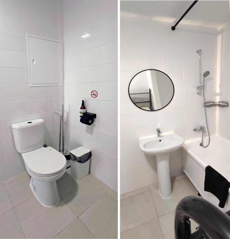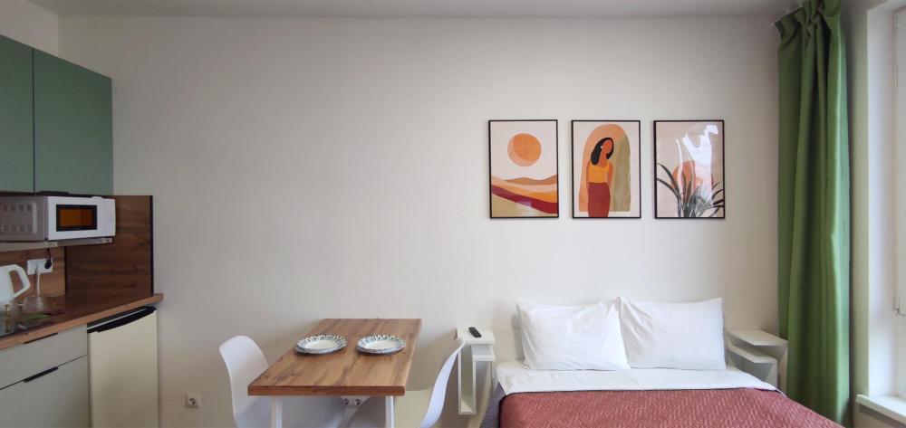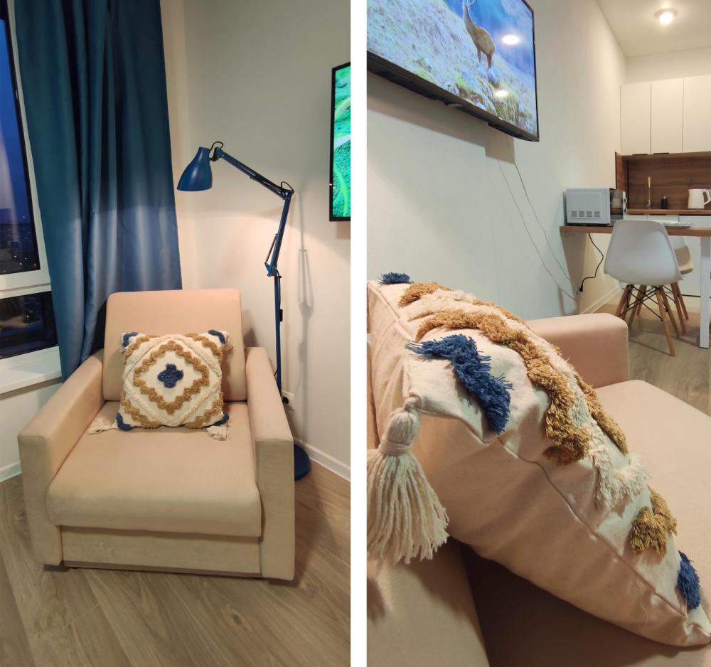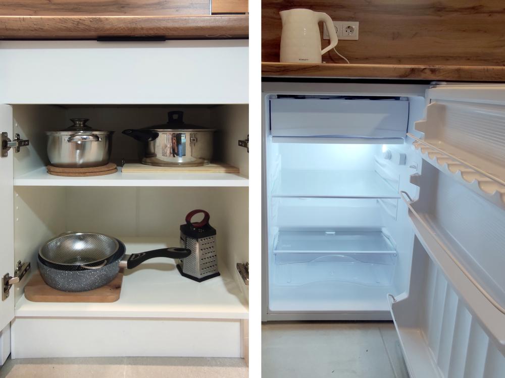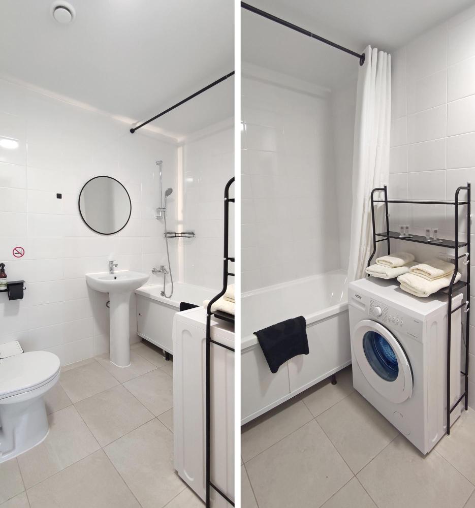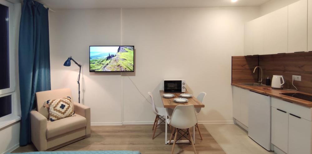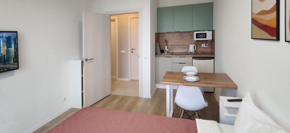 Широкая кровать 160×200 с новым анатомическим матрасом Раскладной диван 130×200 — удобно для 1 взрослого или 2 детей Полноценная кухня с посудой Духовка с СВЧ Посудомоечная машина Фильтр для питьевой воды Стиральная машина с сушкой Сплит система Smart TV Фен, утюг, гладильная доска Просторная гардеробная и много мест хранения