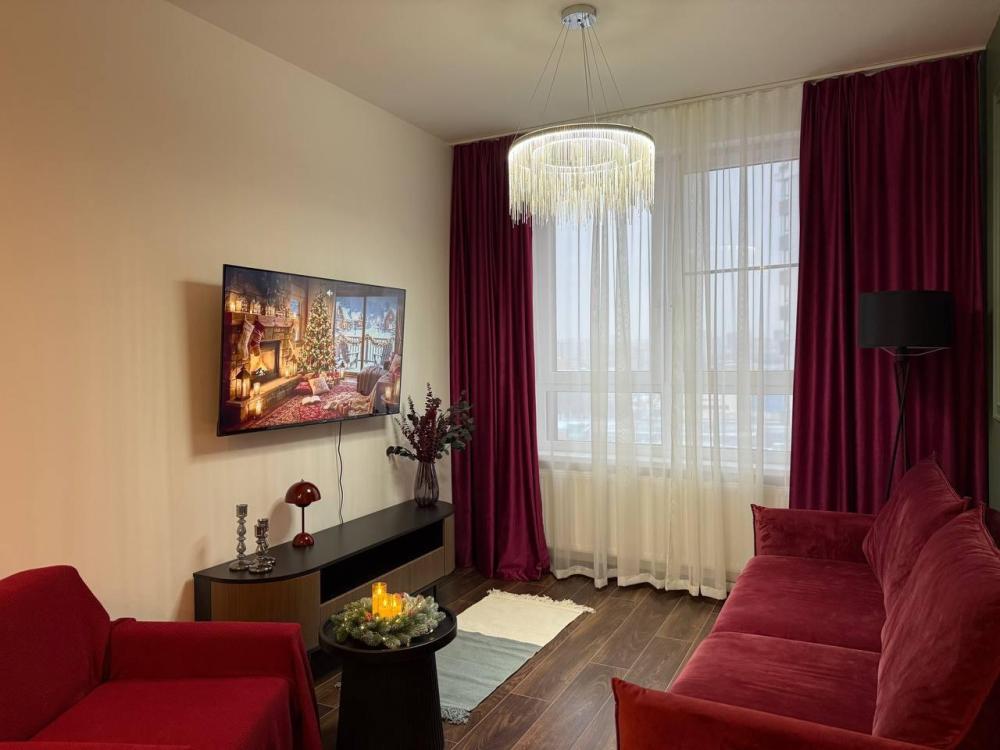 В апартаментах с комфортом разместятся до 4 гостей. Спальные места: двуспальная кровать с ортопедическим матрасом, диван-кровать. Кухня, полностью укомплектованная техникой и посудой: холодильник, варочная панель, посудомоечная машина, микроволновая печь, чайник, кофемашина, продукты первой необходимости, чай, кофе для комфортного завтрака. К услугам также смарт-ТВ, высокоскоростной Wi-Fi, просторная ванна и душевая система, комплект полотенец, фен, косметические принадлежности, кондиционер в каждой комнате, стиральная машина, гладильные принадлежности, пылесос, одноразовые тапочки, зубные наборы, гель для душа, шампунь.