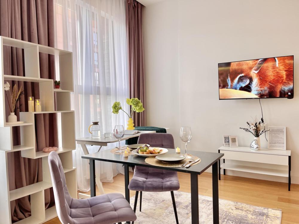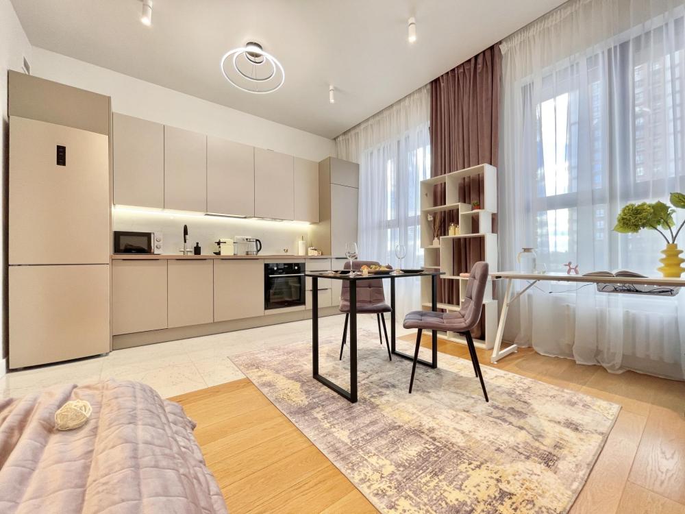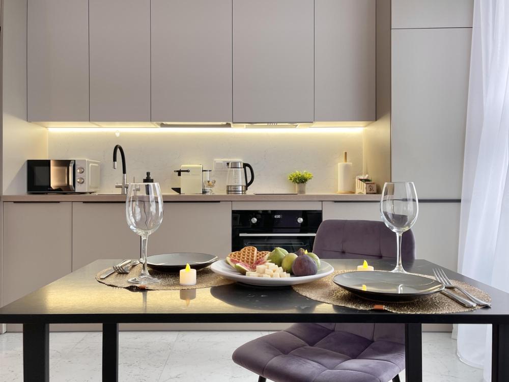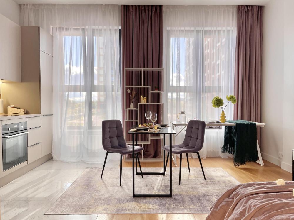 Уютные апартаменты студия с двуспальной кроватью. В апартаментах: быстрый WI-Fi и бытовая техника: телевизор, стиральная машина, посудомоечная машина, капсюльная кофе машина, холодильник, индукционная плита, микроволновая печь, электрочайник, фен, утюг, посуда и столовые приборы, кондиционер.