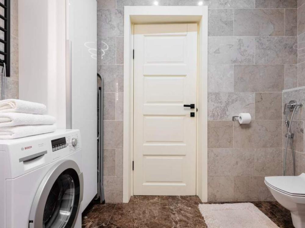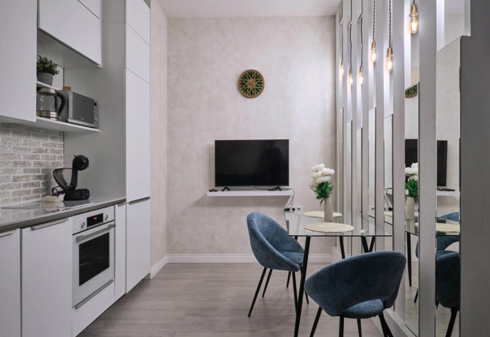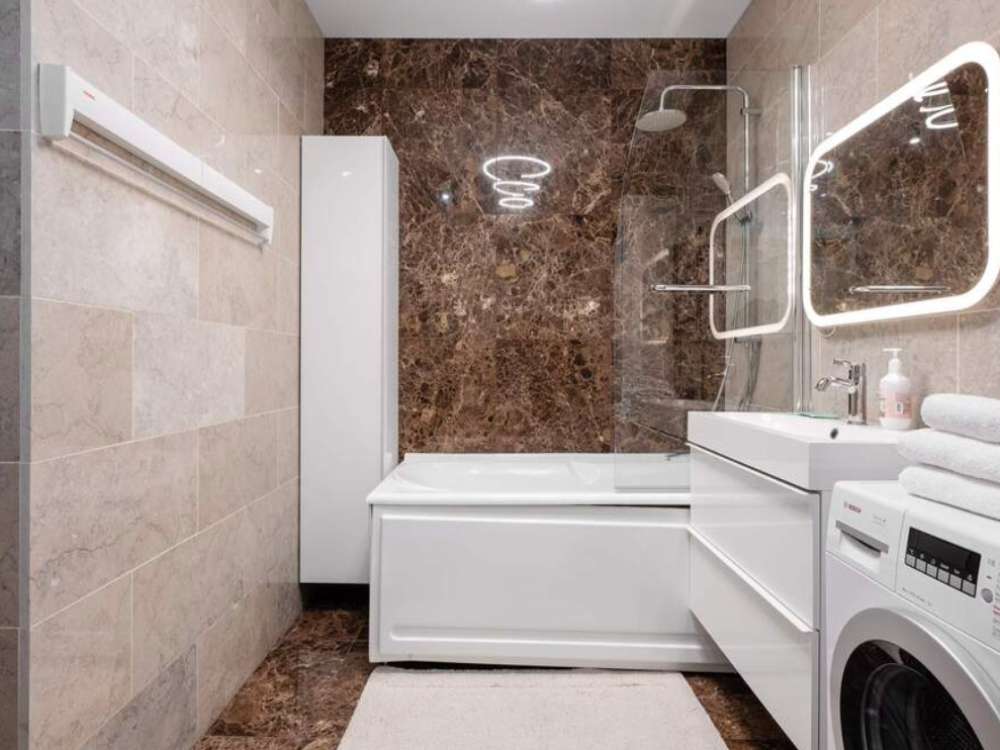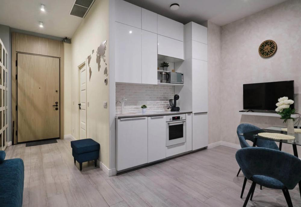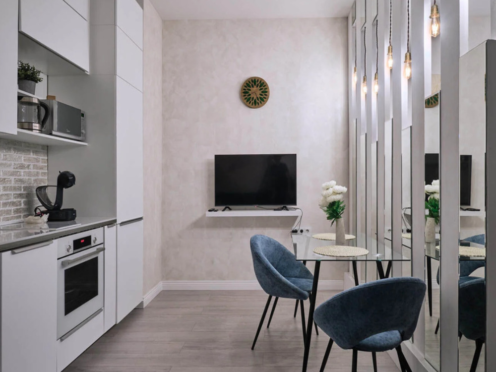 В апартаментах 4 комфортных спальных места:кровать и раскладной диван. Совмещенный санузел с комфортной ванной и тропическим душем. Также предусмотрены средства личной гигиены, полотенца, мыло, шампунь и гель для душа. Кухня полностью оборудована:посуда и столовые приборы, сковородки, кастрюли, холодильник, духовка, микроволновая печь, чайник, бокалы разных типов. Апартаменты оборудованы всей необходимой техникой, а именно : кондиционер с системой климат-контроля, телевизор со Smart-tv, высокоскоростной Wi-Fi, стиральная машина, утюг, гладильная доска, фен, в каждой комнате шторы black-out.
