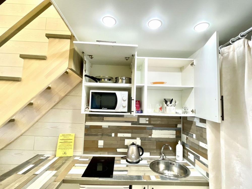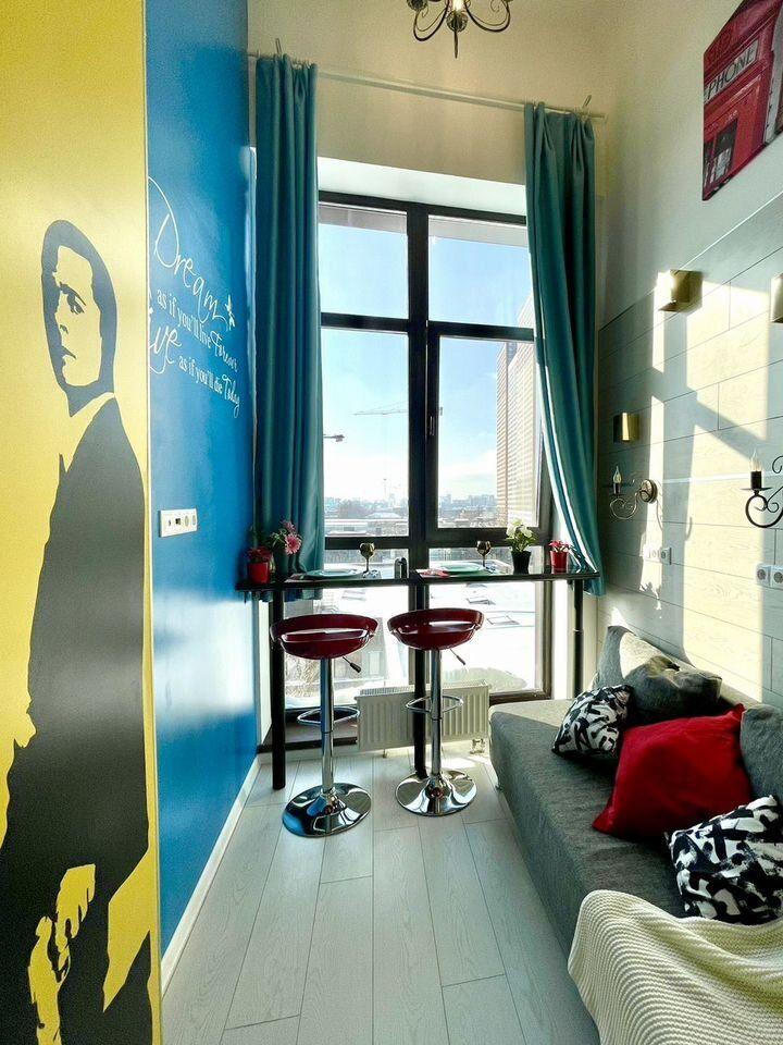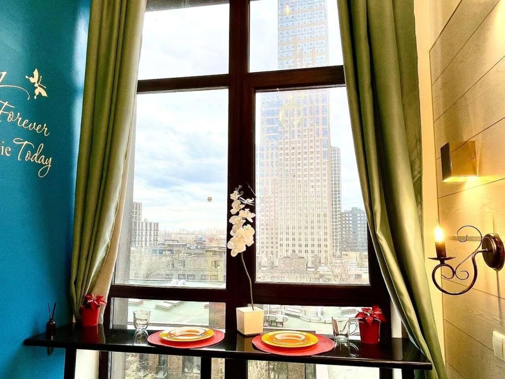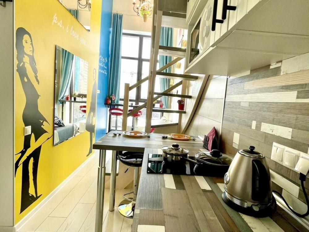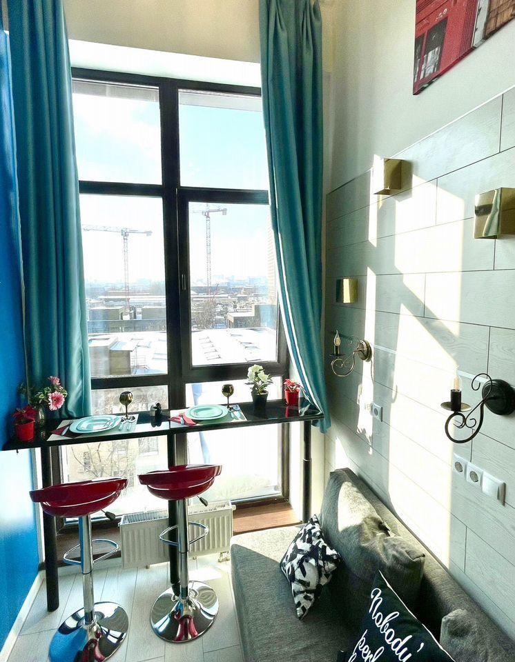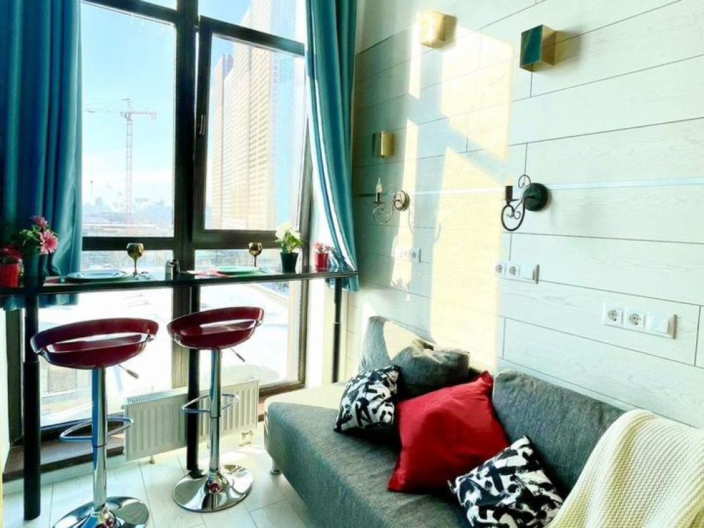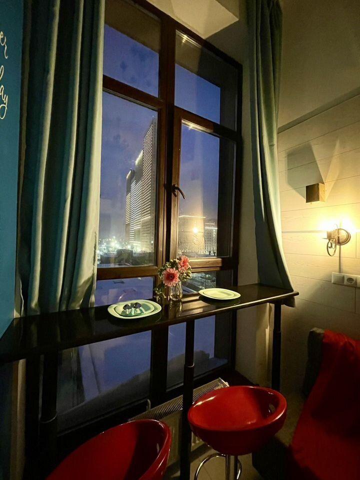 В студии панорамное остекление с красивыми видами. У окна гранитная барная стойка с высокими стульями, за которой можно завтракать или ужинать, наслаждаясь с красивыми видами на вечернюю Москву. На первом этаже есть прихожая и кухня с обеденной зоной. На втором этаже располагается большая уютная спальня с двуспальной кроватью. Напротив кровати висит жк телевизор с кабельными каналами. Квартира оборудована полноценной кухней со всей необходимой техникой и набором посуды. Также имеется душевая комната. Качественный дизайнерский ремонт. Вся мебель и предметы интерьера тщательно подбирались, чтобы ни одна мелочь не была упущена. В студии есть: — необходимый набор посуды — телевизор — двуспальная кровать на 2 этаже — диван длиной 1,3 метра на 1 этаже не раскладывающийся — утюг — стиральная машина — обеденный стол — чайник — холодильник — электрическая плита — микроволновка — прихожая В стоимость включено: — проживание двух человек — чистое постельное бельё — бесплатный wi-fi интернет — цифровое телевидение — отчётные документы Основные спальные места: 2 + 1 место на диване.