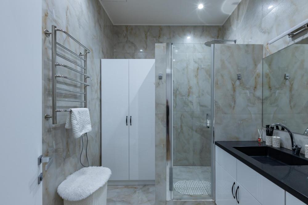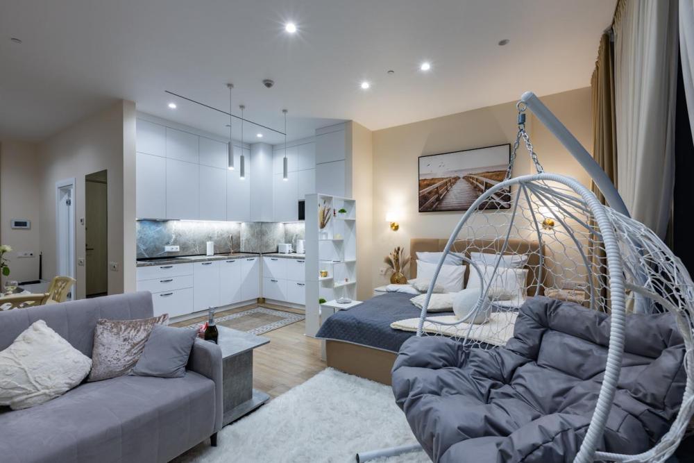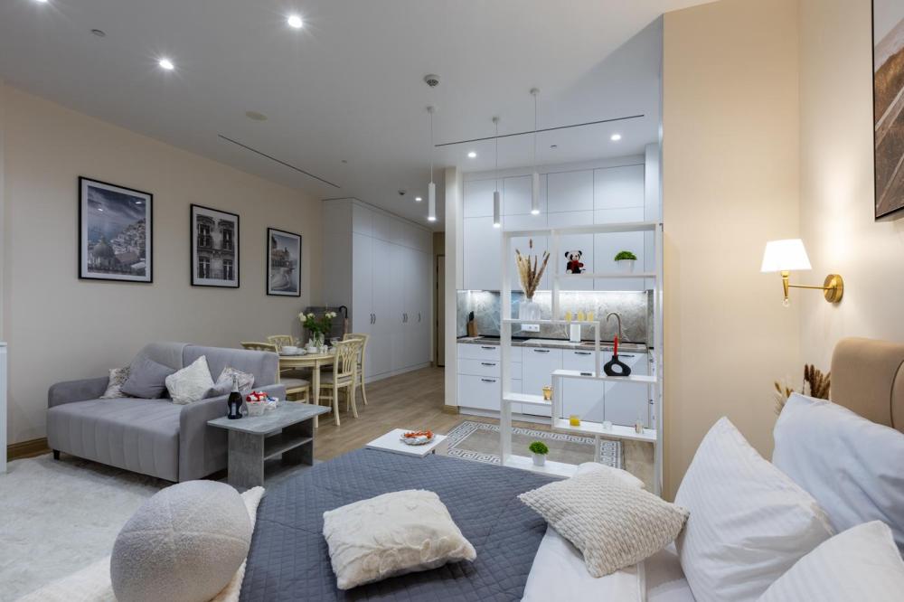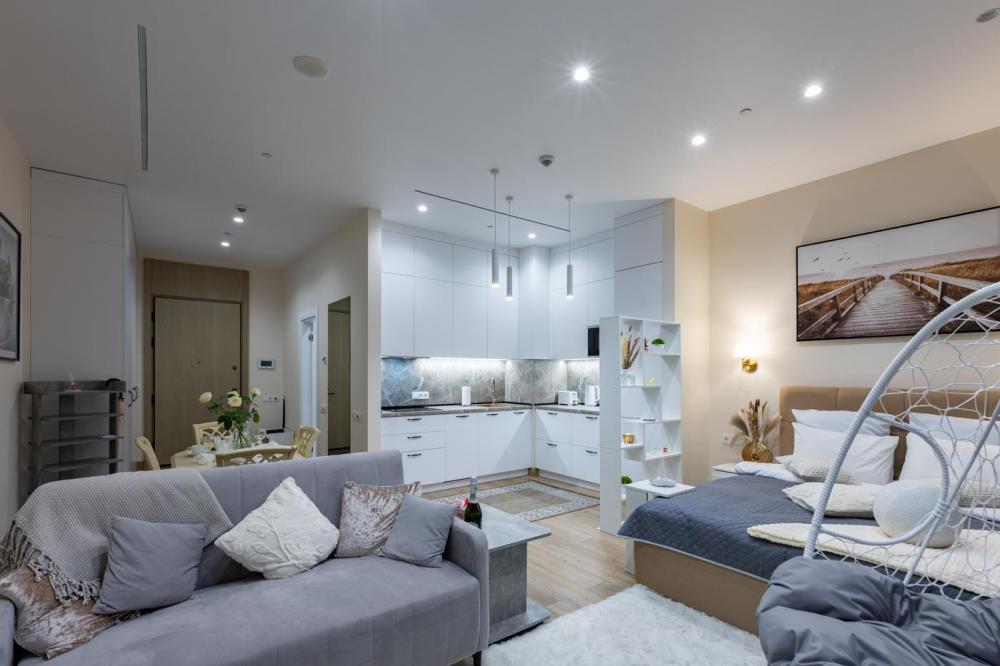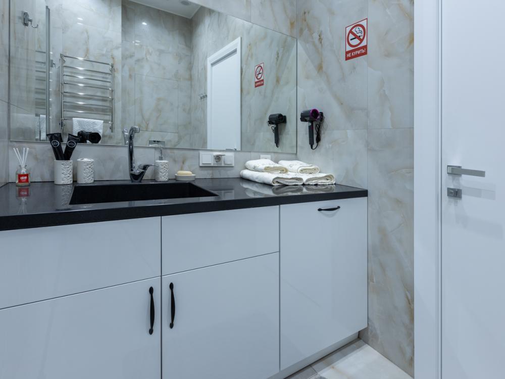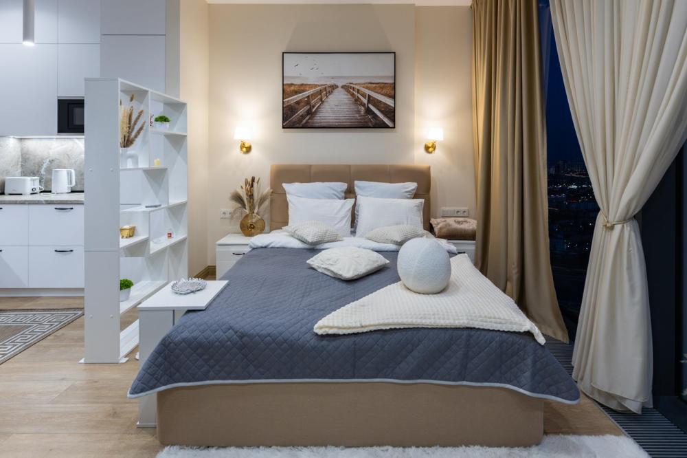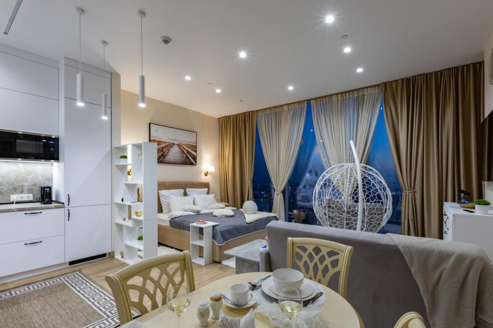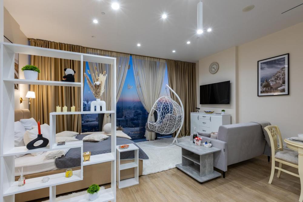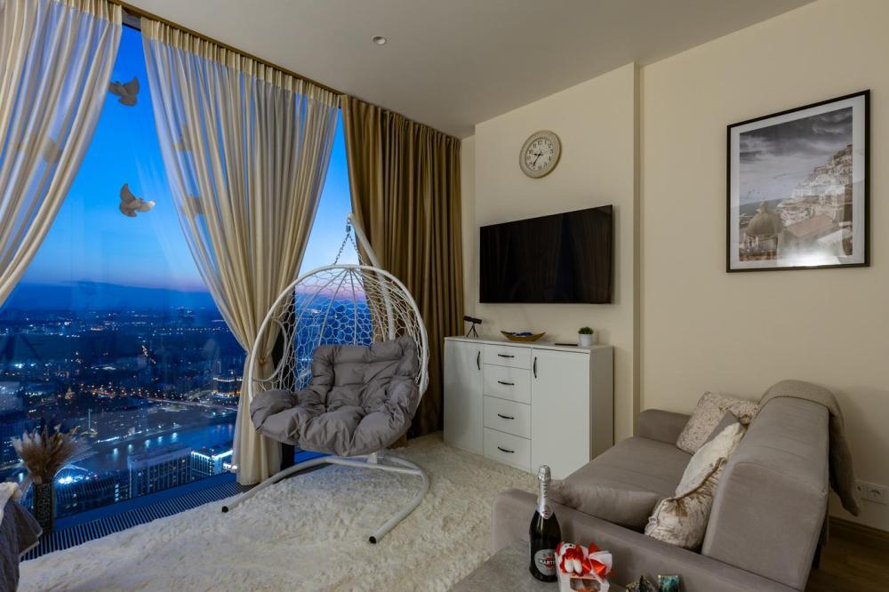 Апартаменты премиум-класса на 61 этаже башни Москва-Сити. Свежий и чистый воздух, благодаря системе очистки, расположенной на высоте более 200 метров. Теплые полы и кондиционер. Уютное кресло-кокон для двоих с потрясающим видом на запад Москвы. Вся необходимая техника — гладильная доска, утюг, стиральная и сушильная машины, фен, посудомойка. Обзорная панорама на западную часть города: Кутузовский проспект, Парк победы, Филевский парк, Багратионовский мост и т.д. Полный набор посуды, бокалов и кухонных принадлежностей.