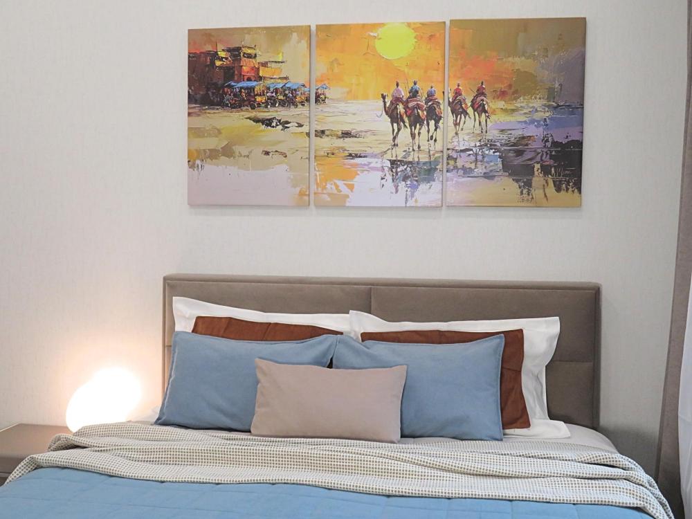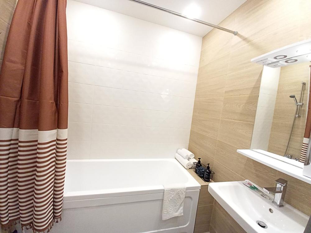 В квартире есть двуспальная кровать с ортопедическим матрасом, постельное белье и полотенца, полностью оснащённая кухня с холодильником, электроплитой, микроволновой печью, духовкой, чайником, посудой и кухонными принадлежностями, кондиционер, стиральная машина, фен, утюг с гладильной доской, сушилка для одежды, Smart TV, высокоскоростной Wi-Fi и гигиенические принадлежности.