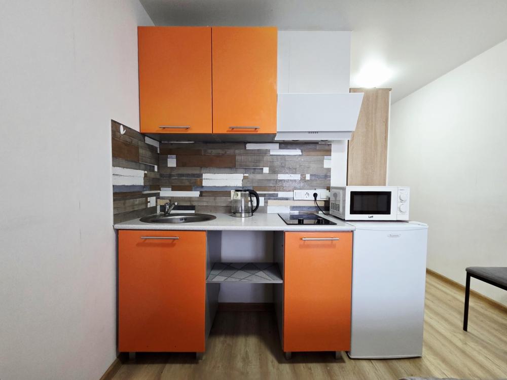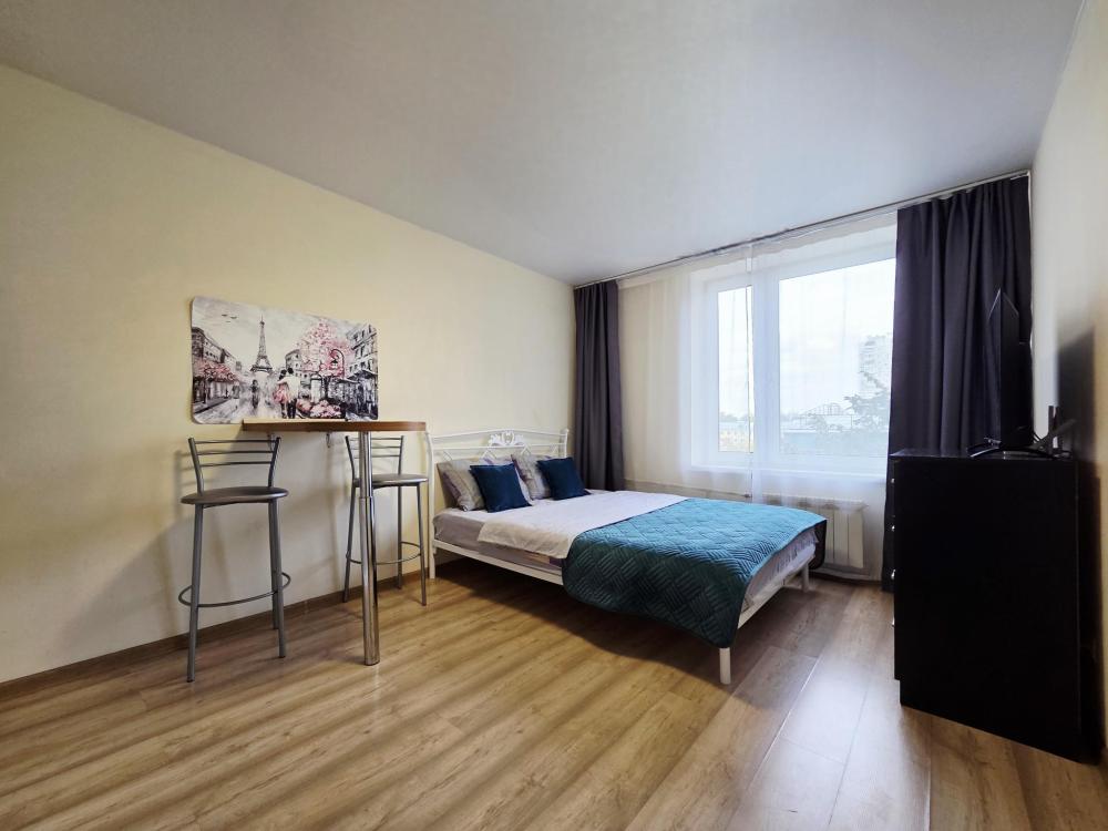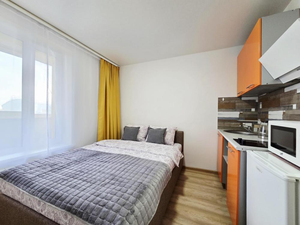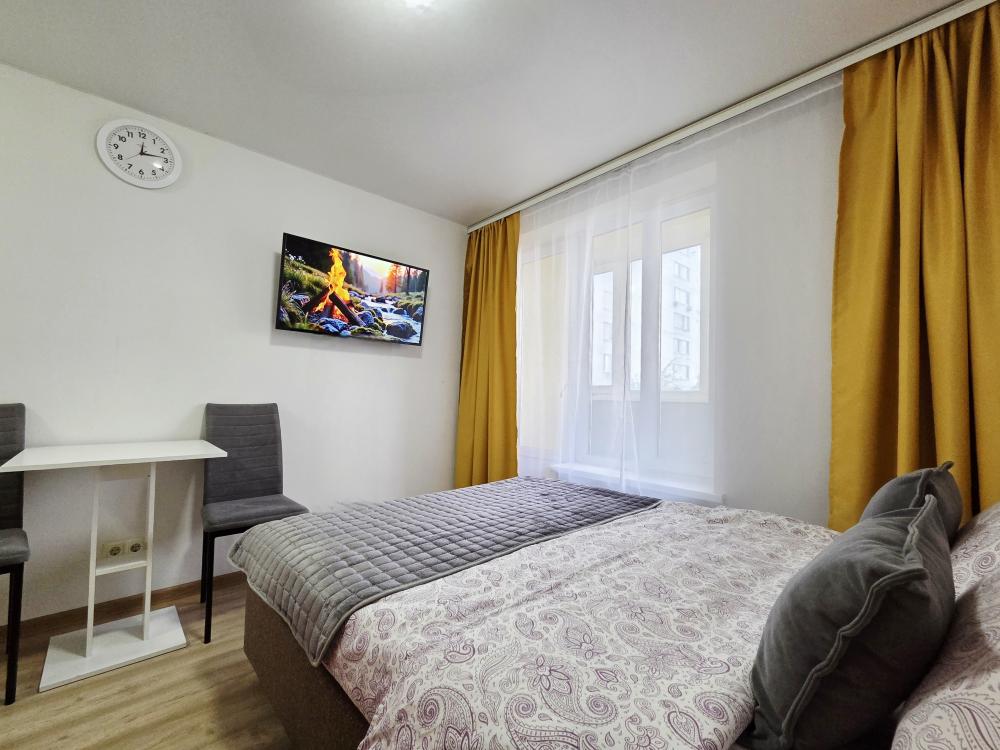 Апартаменты-студия подойдут для размещения 2 человек. Спальные места: двуспальная кровать. В квартире есть все необходимое для комфортного проживания: утюг, гладильная доска, стиральная машина, фен, Wi-Fi и ТV. На кухне: электроплита, холодильник, микроволновая печь, чайник. Постельное белье, полотенца и средства личной гигиены предоставляются.