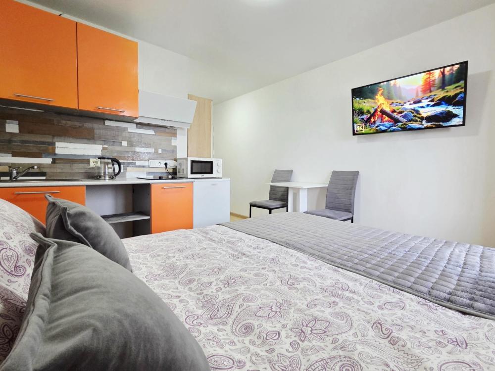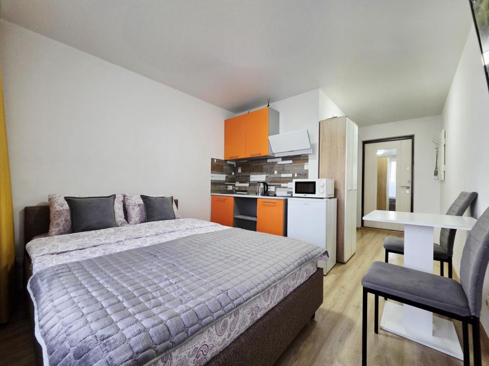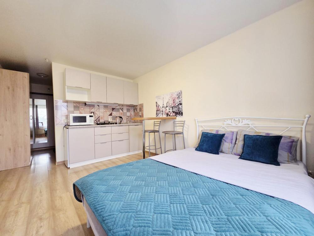 Апартаменты-студия подойдут для размещения 2 человек. Спальные места: двуспальная кровать. В квартире есть все необходимое для комфортного проживания: кондиционер, утюг, гладильная доска, стиральная машина, фен, Wi-Fi и ТV. На кухне: электроплита, холодильник, микроволновая печь, чайник. Постельное белье, полотенца.