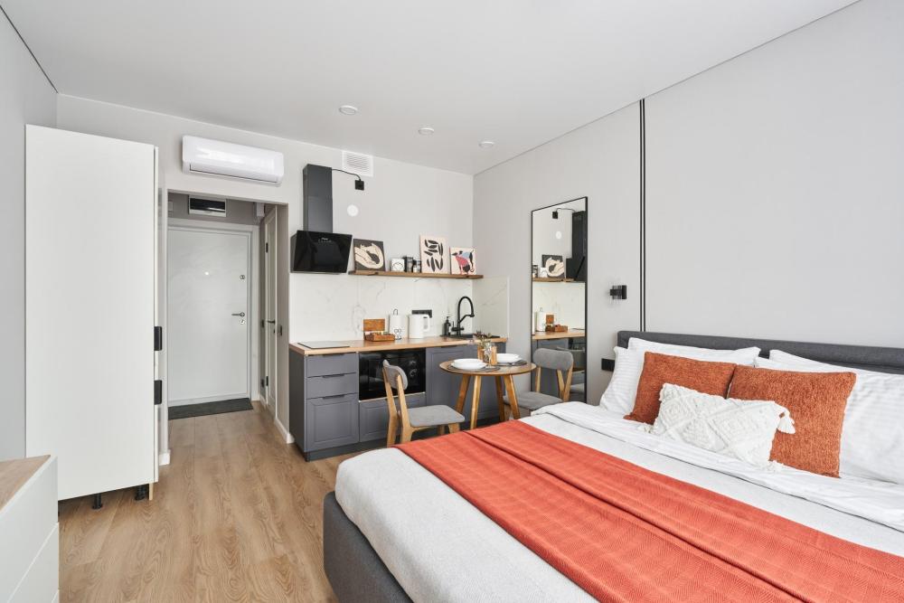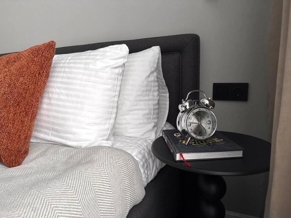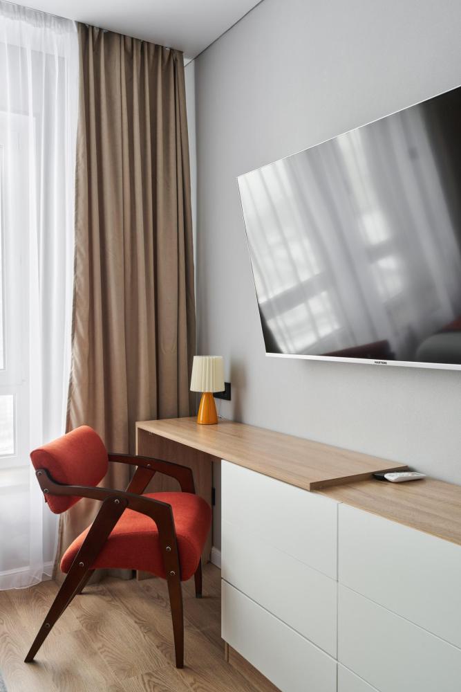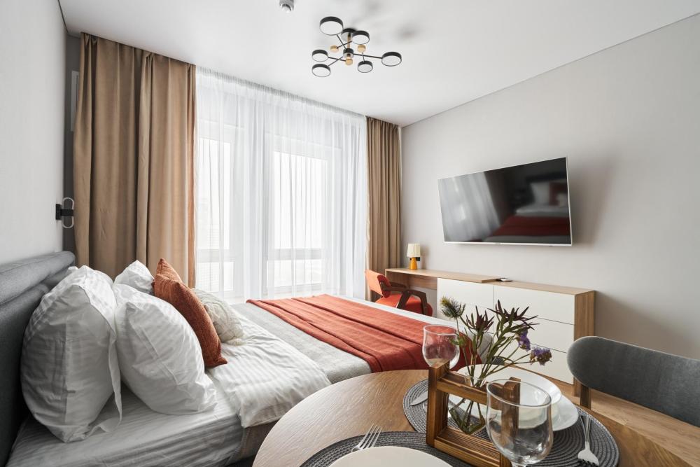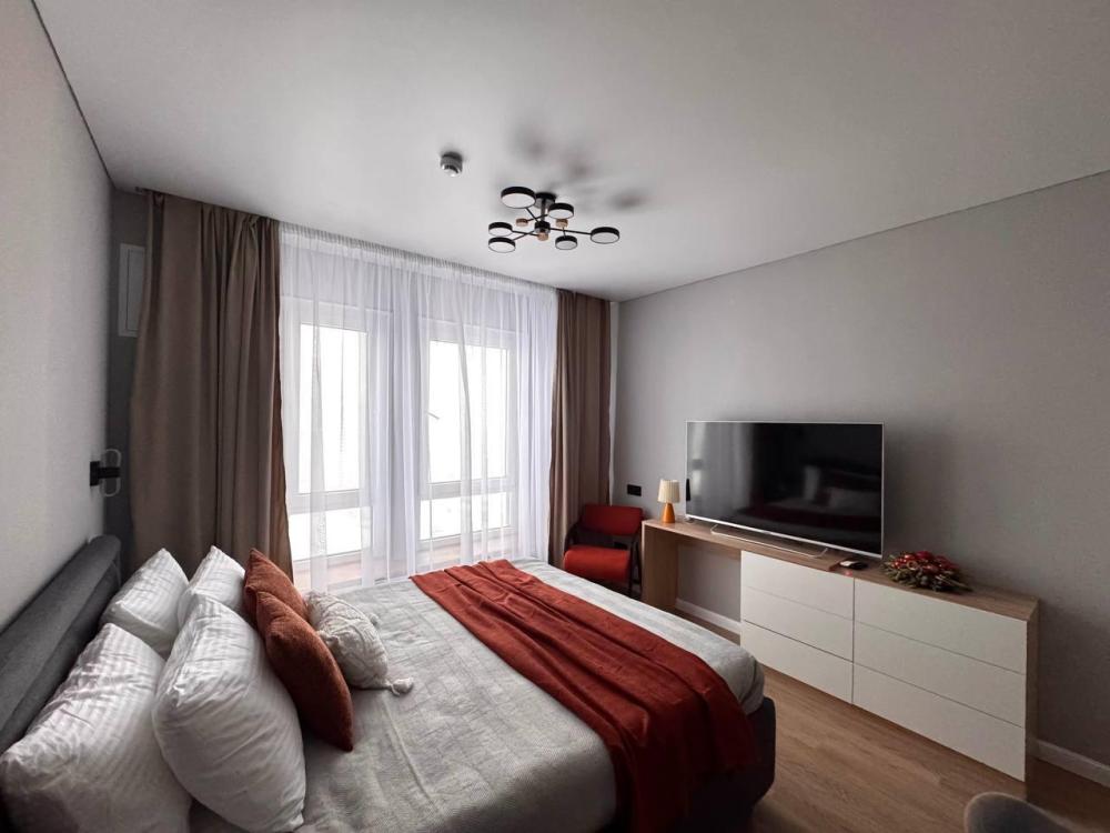 Квартира полностью оборудована для комфортного проживания: Умный телевизор (Smart TV) с доступом к популярным онлайн-кинотеатрам. Чайная станция (чай, кофе, сахар) для быстрого перекуса. Холодильник, вся необходимая посуда и кухонная техника. Комплект постельного белья, полотенца, тапочки. Средства для душа: шампунь, гель для душа, жидкое мыло. Фен.