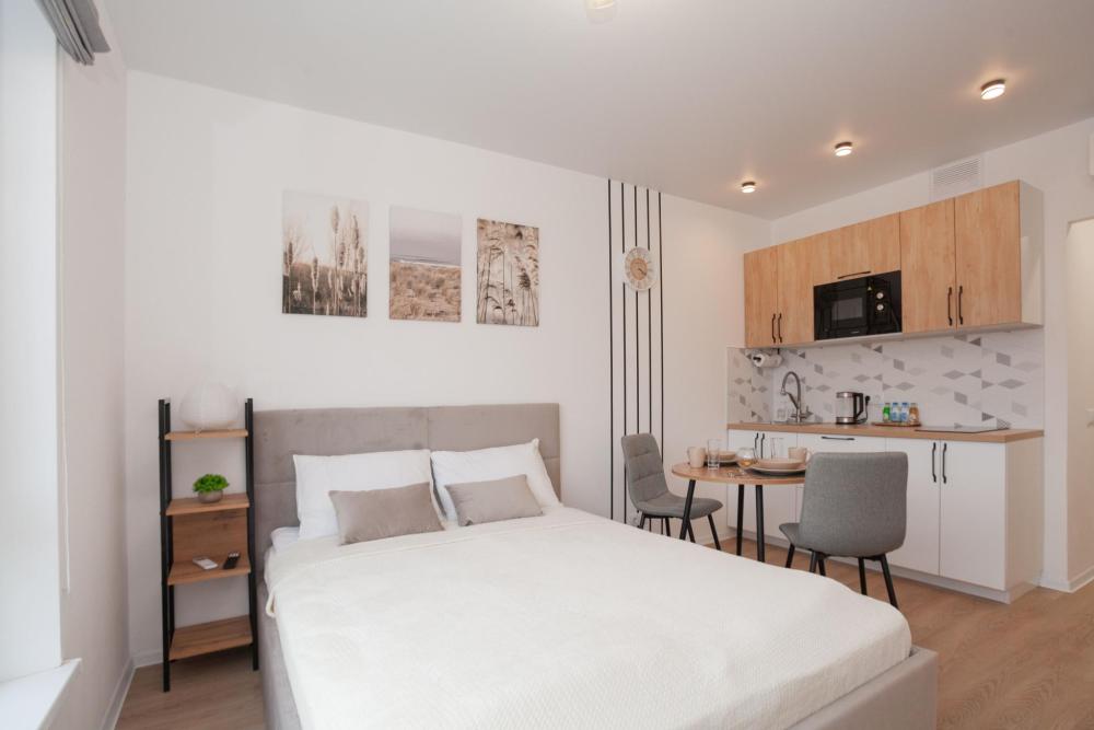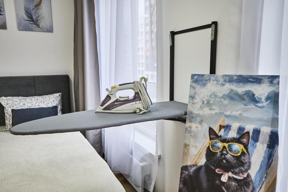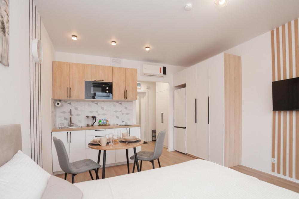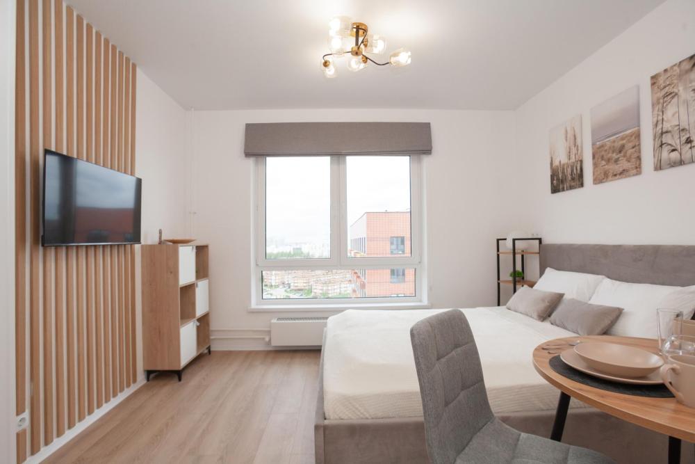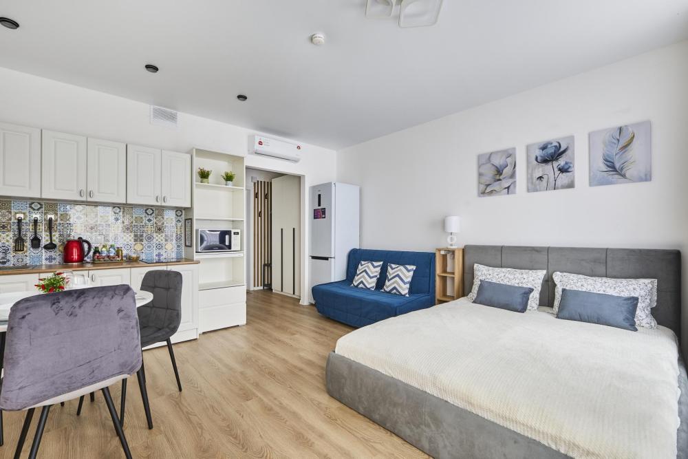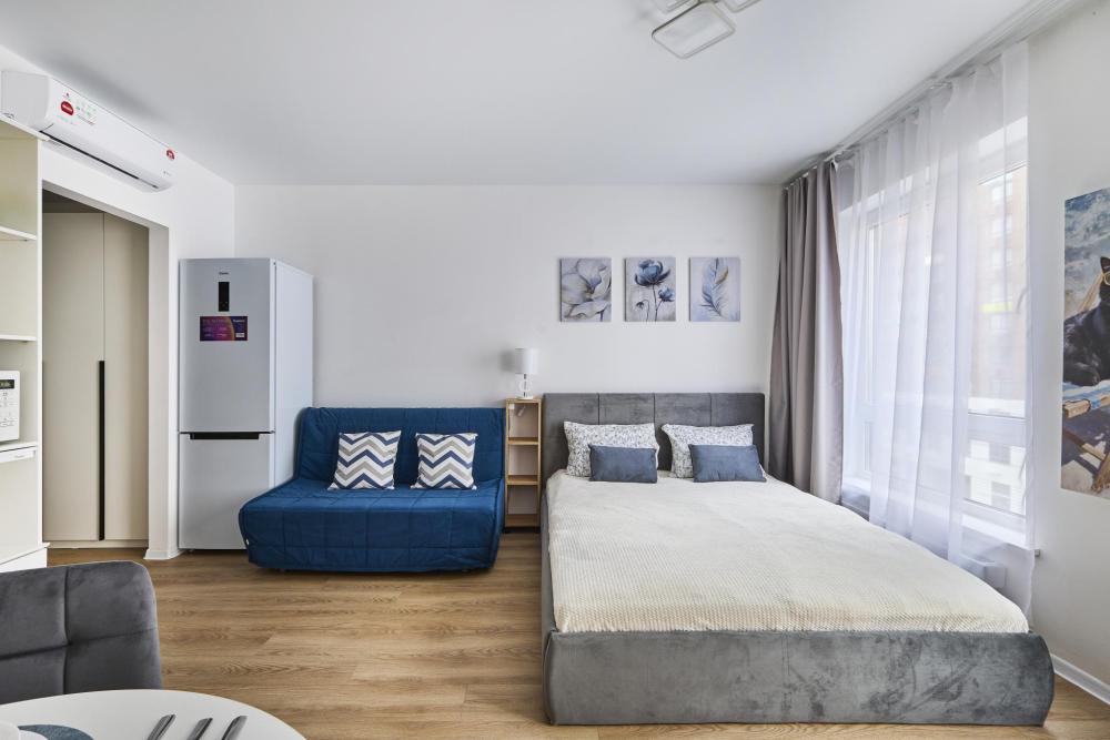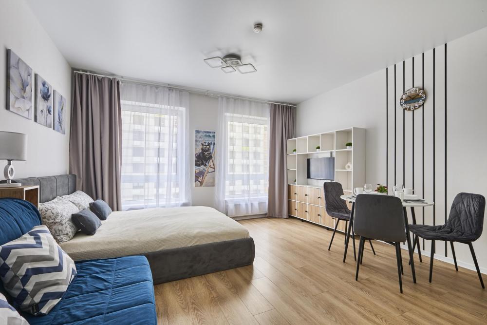 Светлая студию с двумя окнами. В студии есть всё необходимое для проживание 3х гостей: шикарная двуспальная кровать 160*200см с ортопедическим матрасом, комплект постельного белья, комфортный диван-кровать 140х200, комплект постельного белья, кухня с микроволновкой, плитой, чайником и холодильником, полный комплект посуды, столовых приборов, штопор, бытовая техника: стиральная машина, кондиционер, телевизор со смарт тв, wi-fi, утюг и гладильная доска, 3 комплекта одноразовых зубных щёток с пастой, гель для душа, шампунь, туалетная бумага, ватные диски и палочки; в санузле: душевой уголок, фен, 3 комплекта полотенец, раскладная сушилка для одежды и электрический полотенцесушитель; бесплатная приветственная корзина с кучей вкусняшек.