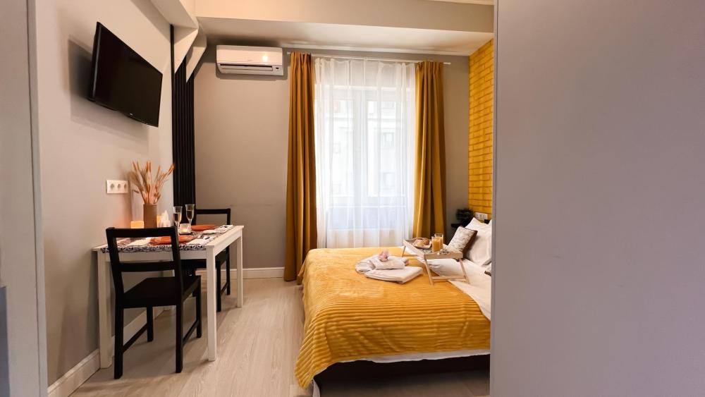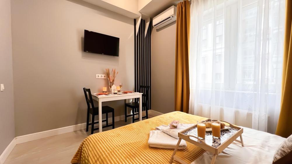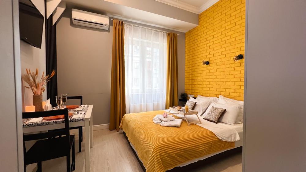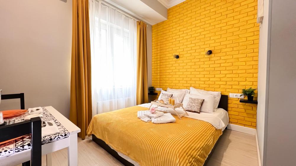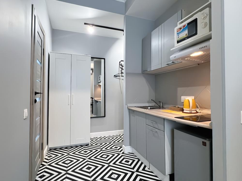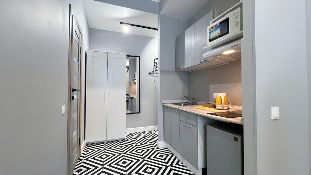 Площадь 20 кв. метров, комнаты: одна комната-студия с удобной кроватью и рабочей зоной, включающей стол и стулья. Кухня: современная кухня, оснащенная всей необходимой техникой, включая холодильник, микроволновую печь, электрическую плиту и вытяжку. Санузел: совмещенный, с душевой кабиной. Мебель: полностью меблирована, включая кровать, диван, стол, стулья и шкафы. Техника: телевизор, кондиционер, стиральная машина. Современный дизайн с элементами кирпичной кладки, создающими уютную атмосферу.