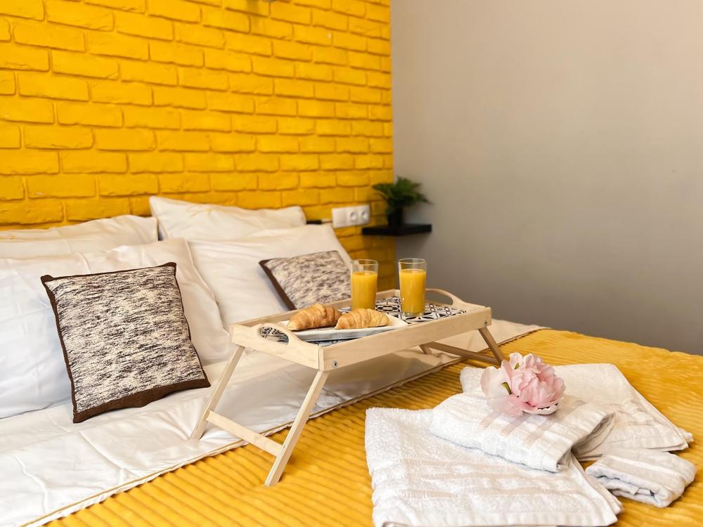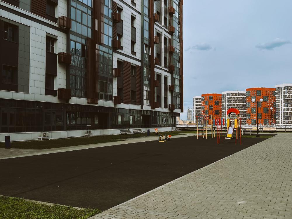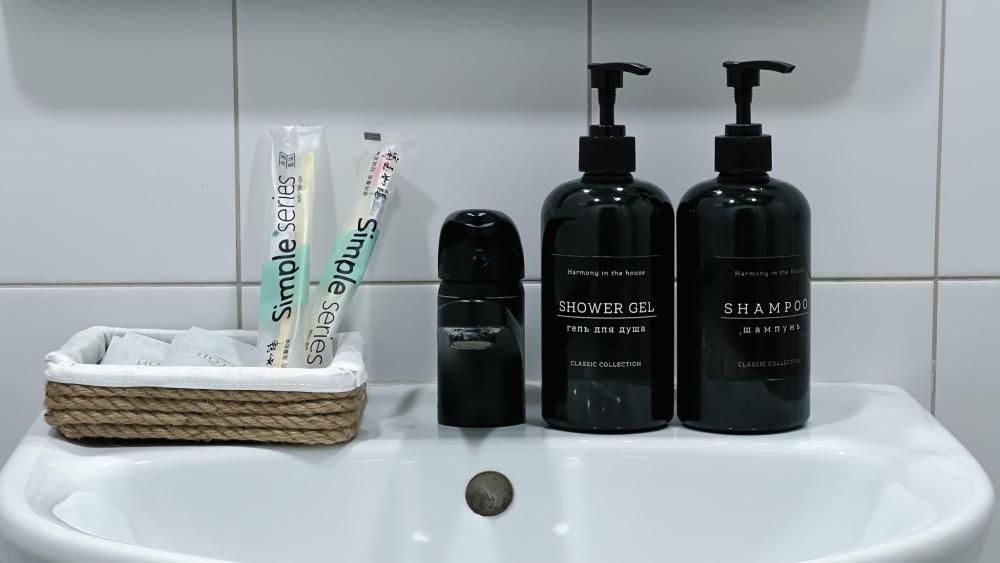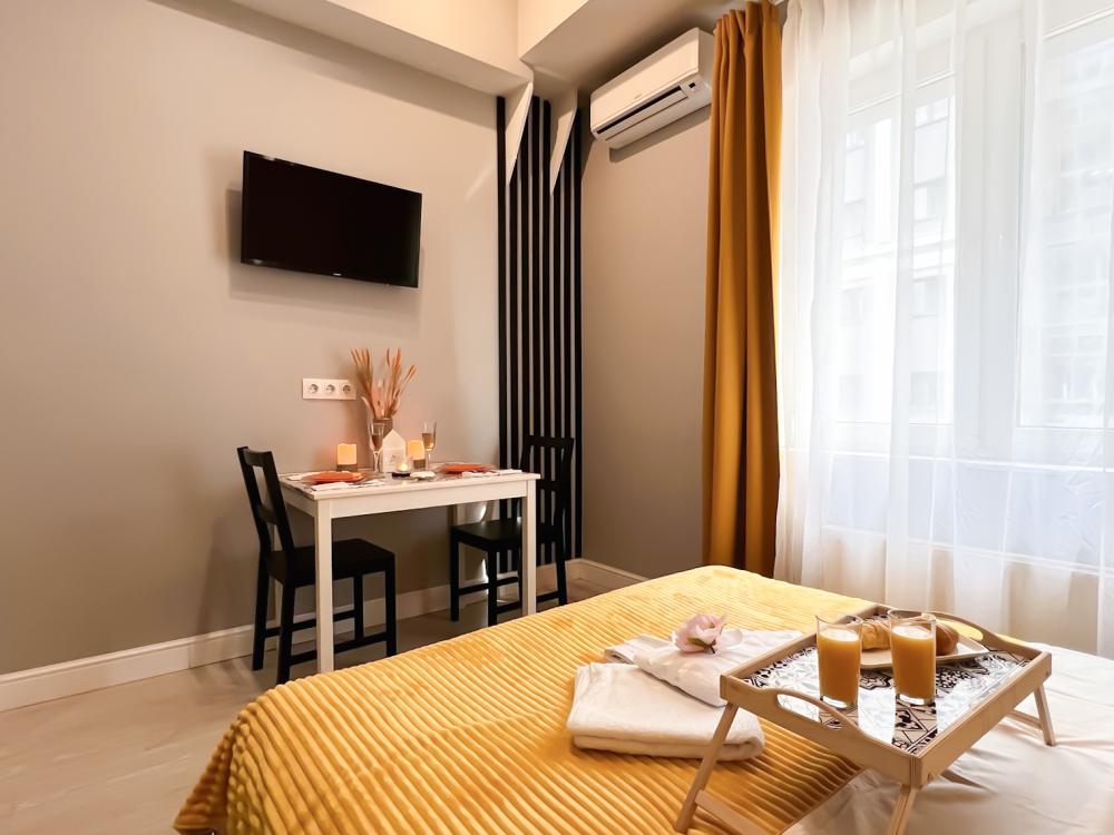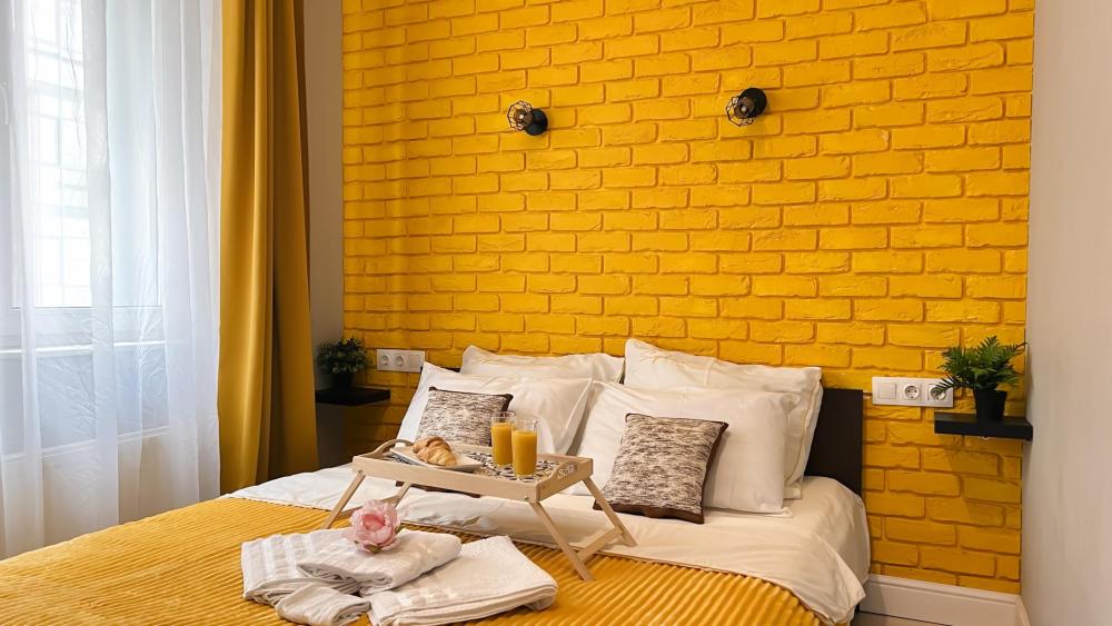 Площадь 20 кв. метров, комнаты: одна комната-студия с удобной кроватью и рабочей зоной, включающей стол и стулья. Кухня: современная кухня, оснащенная всей необходимой техникой, включая холодильник, микроволновую печь, электрическую плиту и вытяжку. Санузел: совмещенный, с душевой кабиной. Мебель: полностью меблирована, включая кровать, диван, стол, стулья и шкафы. Техника: телевизор, кондиционер, стиральная машина. Современный дизайн с элементами кирпичной кладки, создающими уютную атмосферу.